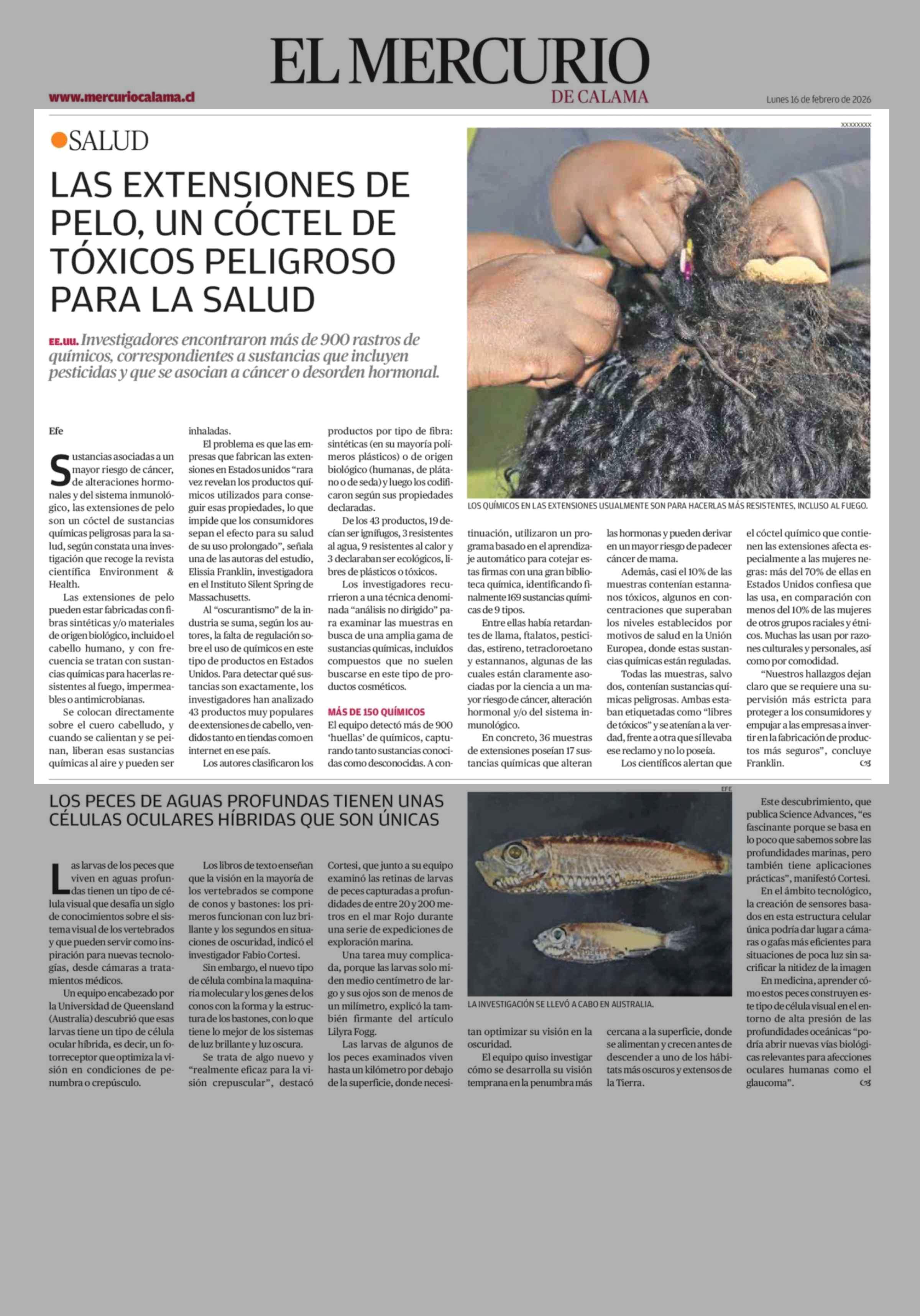 LAS EXTENSIONES DE PELO, UN CÓCTEL DE TÓXICOS PELIGROSO PARA LA SALUD 16-02-2026 El Mercurio de Calama |