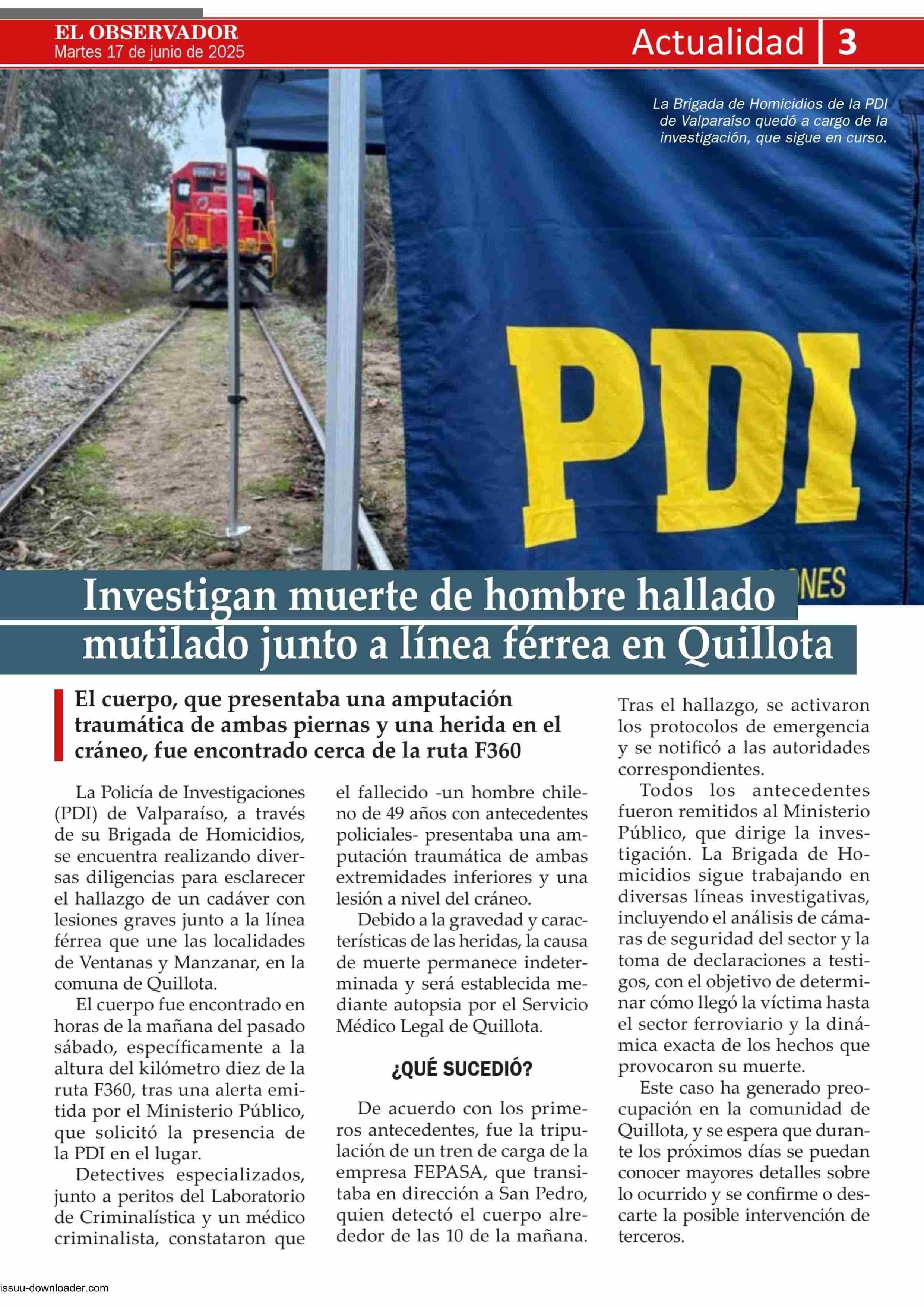 Investigan muerte de hombre hallado mutilado junto a línea férrea en Quillota 17-06-2025 El Observador |
