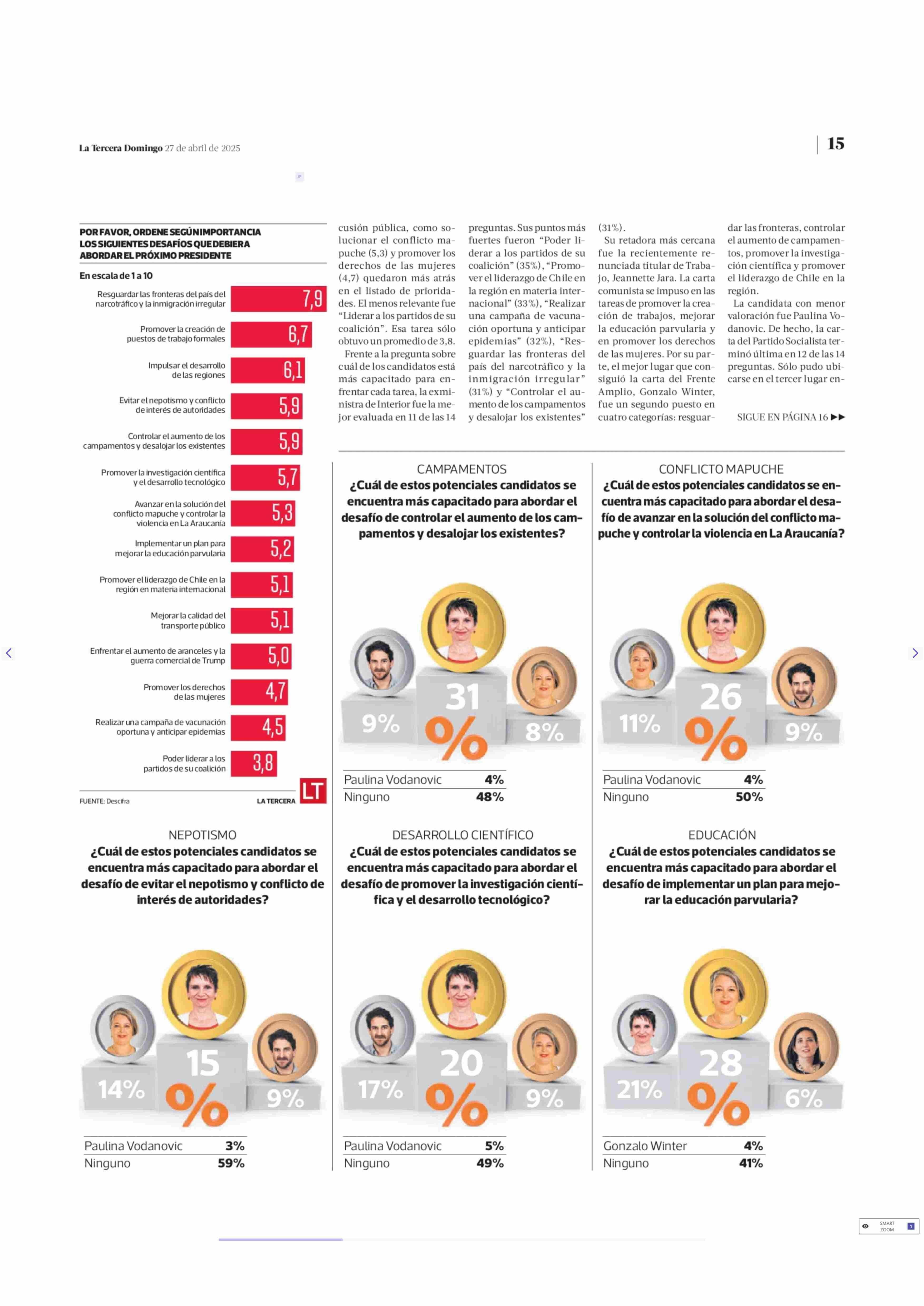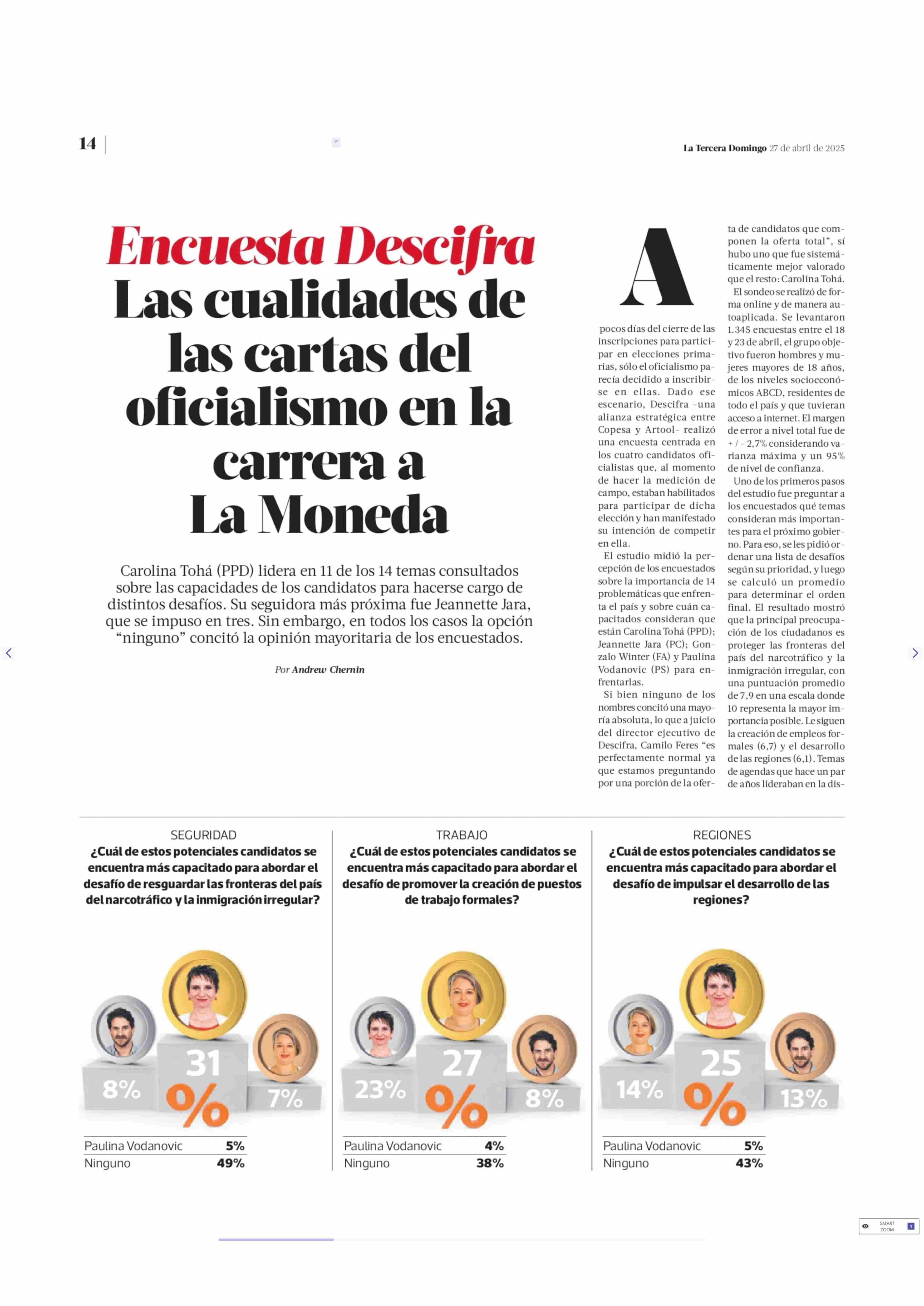 Encuesta Descifra Las cualidades de las cartas del oficialismo en la carrera a La Moneda 27-04-2025 La Tercera |