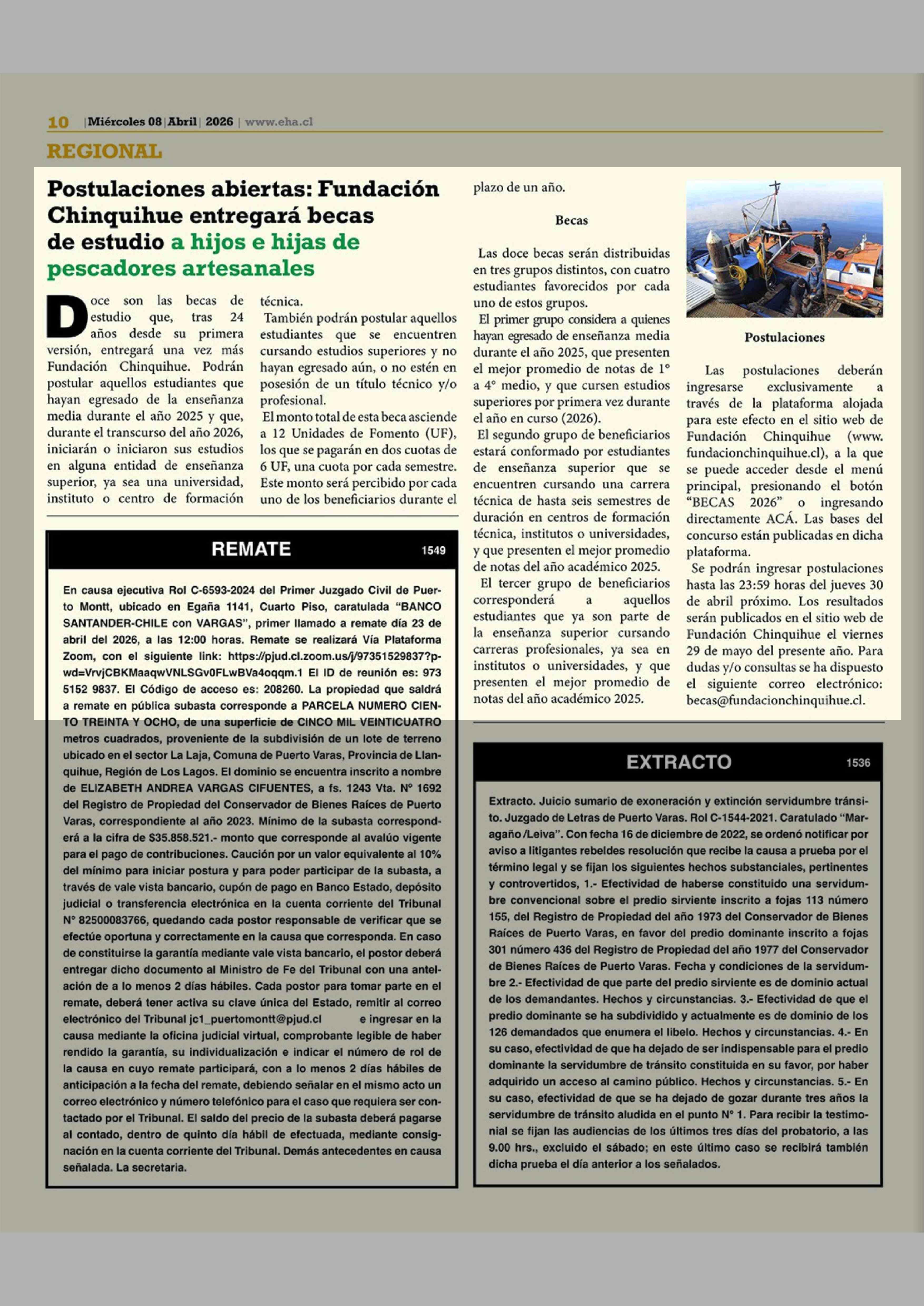 Postulaciones abiertas: Fundación Chinquihue entregará becas de estudio a hijos e hijas de pescadores artesanales 08-04-2026 El Heraldo Austral |