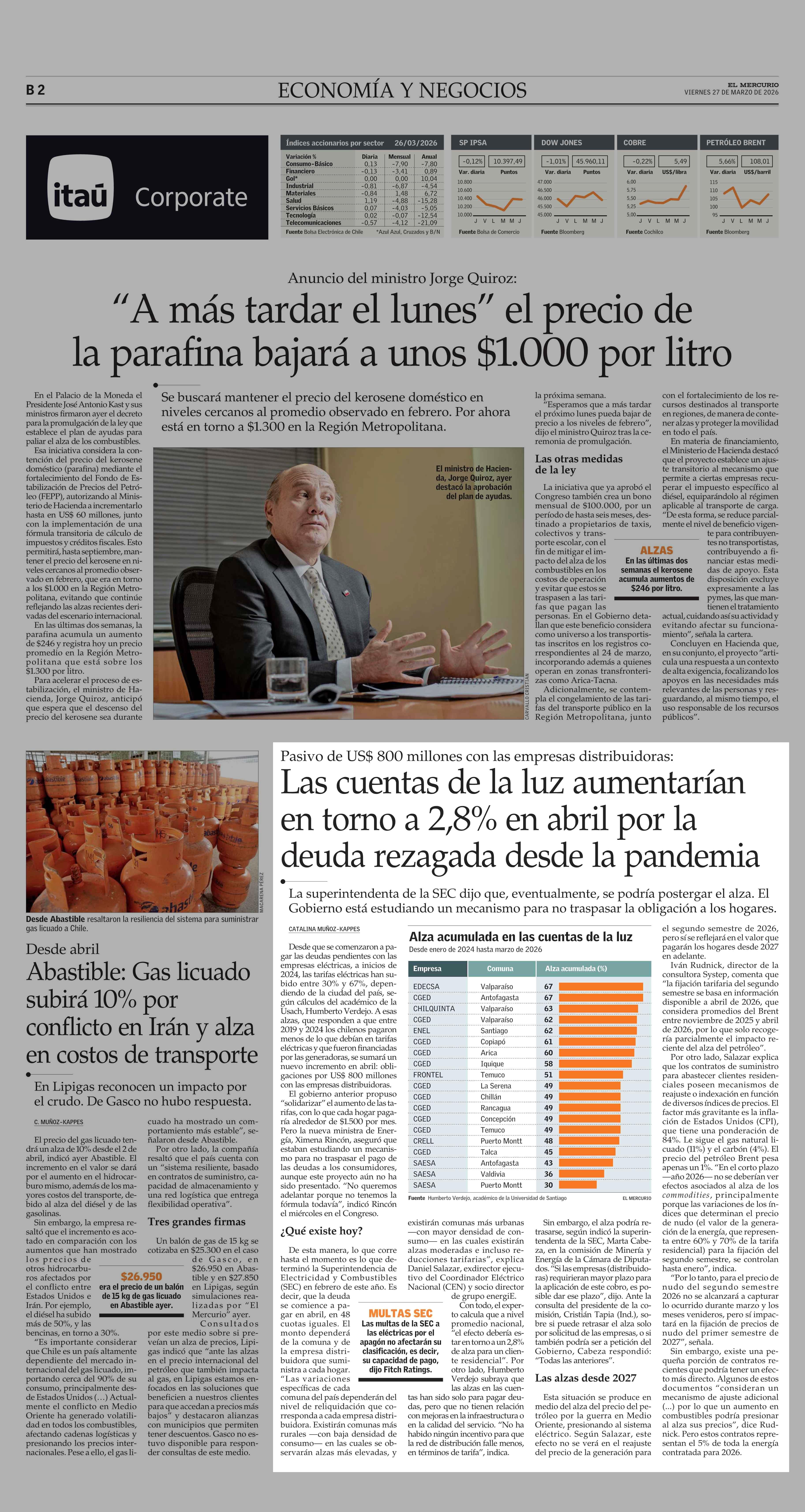 Las cuentas de la luz aumentarían en torno a 2,8% en abril por la deuda rezagada desde la pandemia 27-03-2026 El Mercurio |