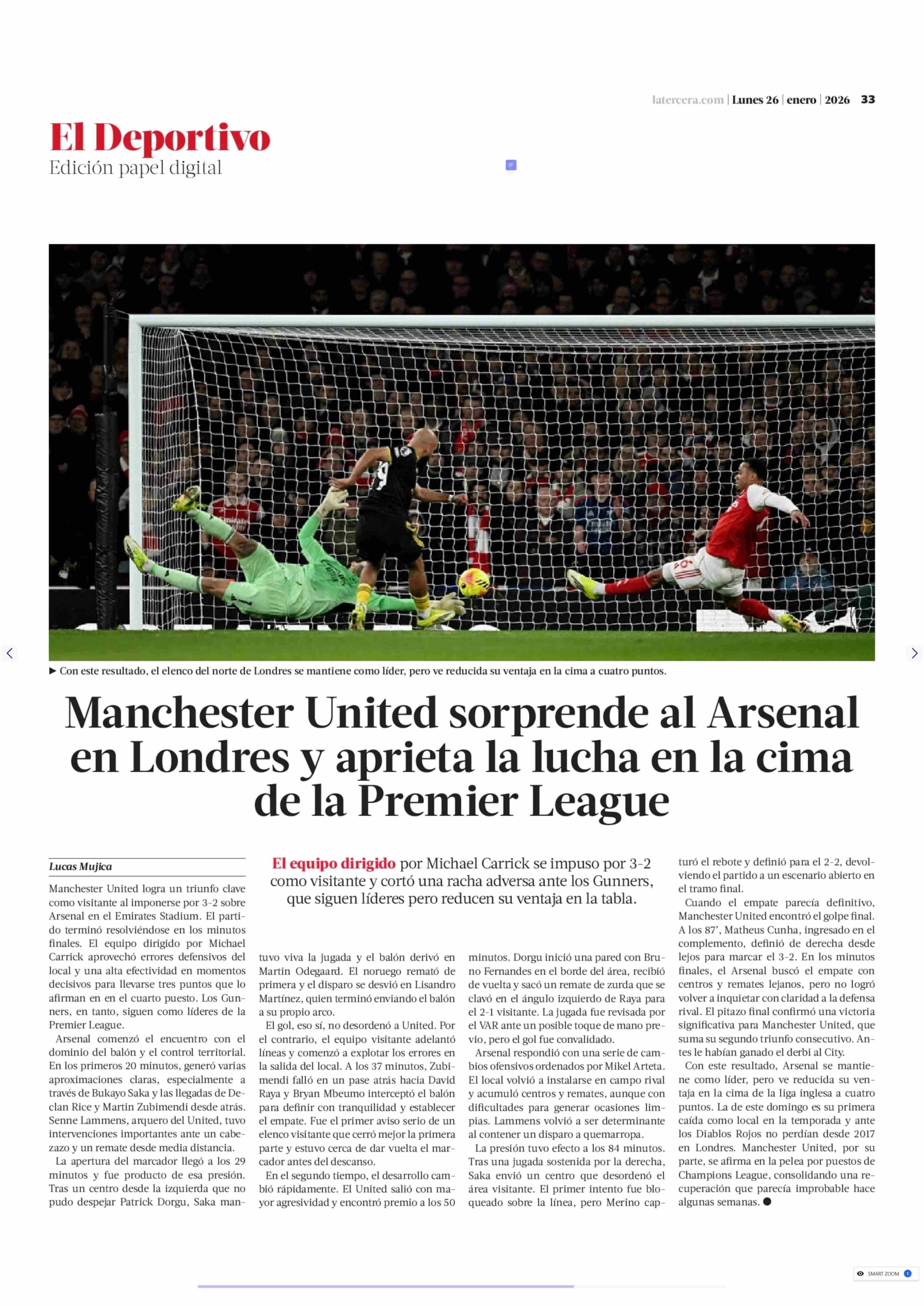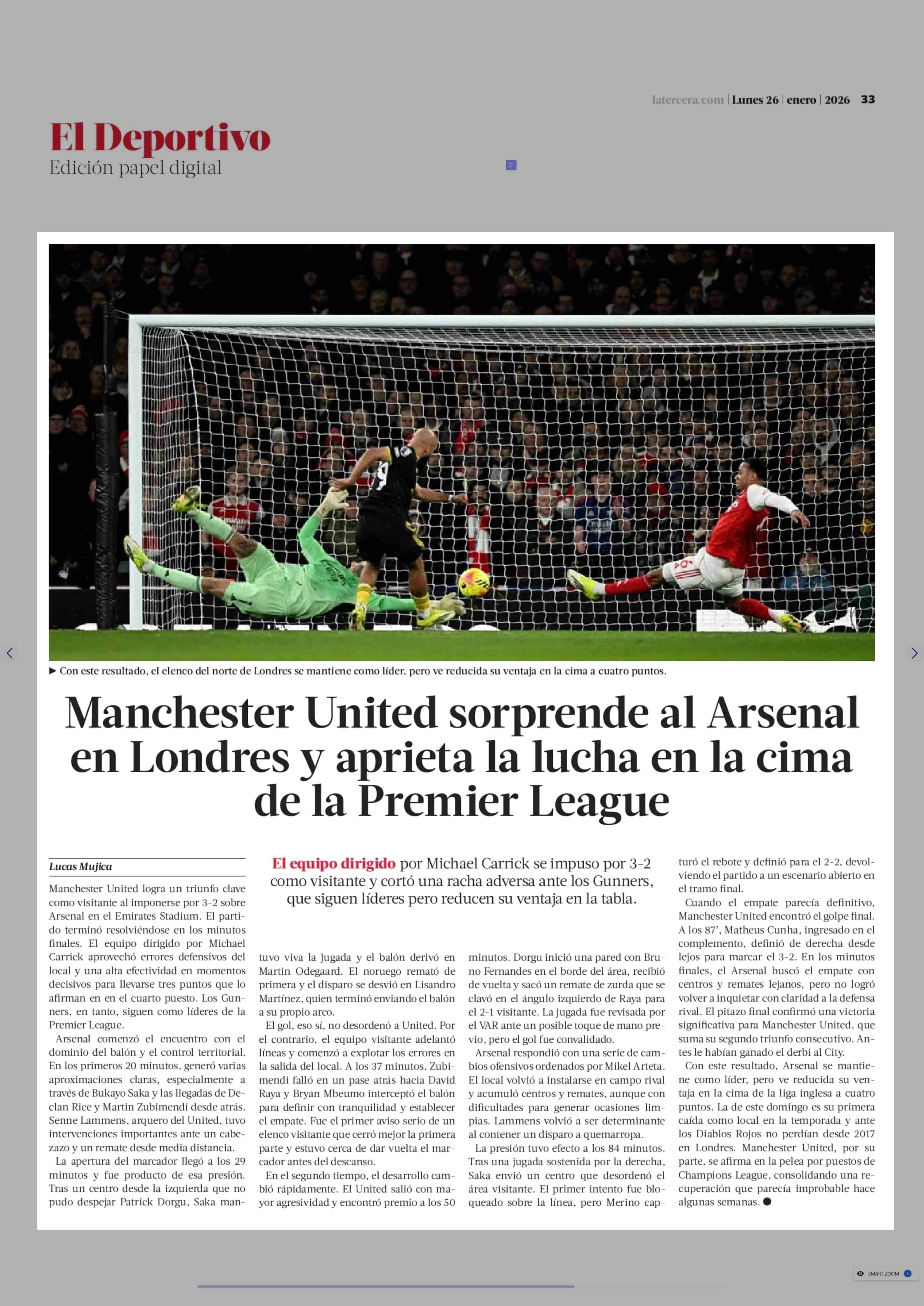 Manchester United sorprende al Arsenal en Londres y aprieta la lucha en la cima de la Premier League 26-01-2026 La Tercera |