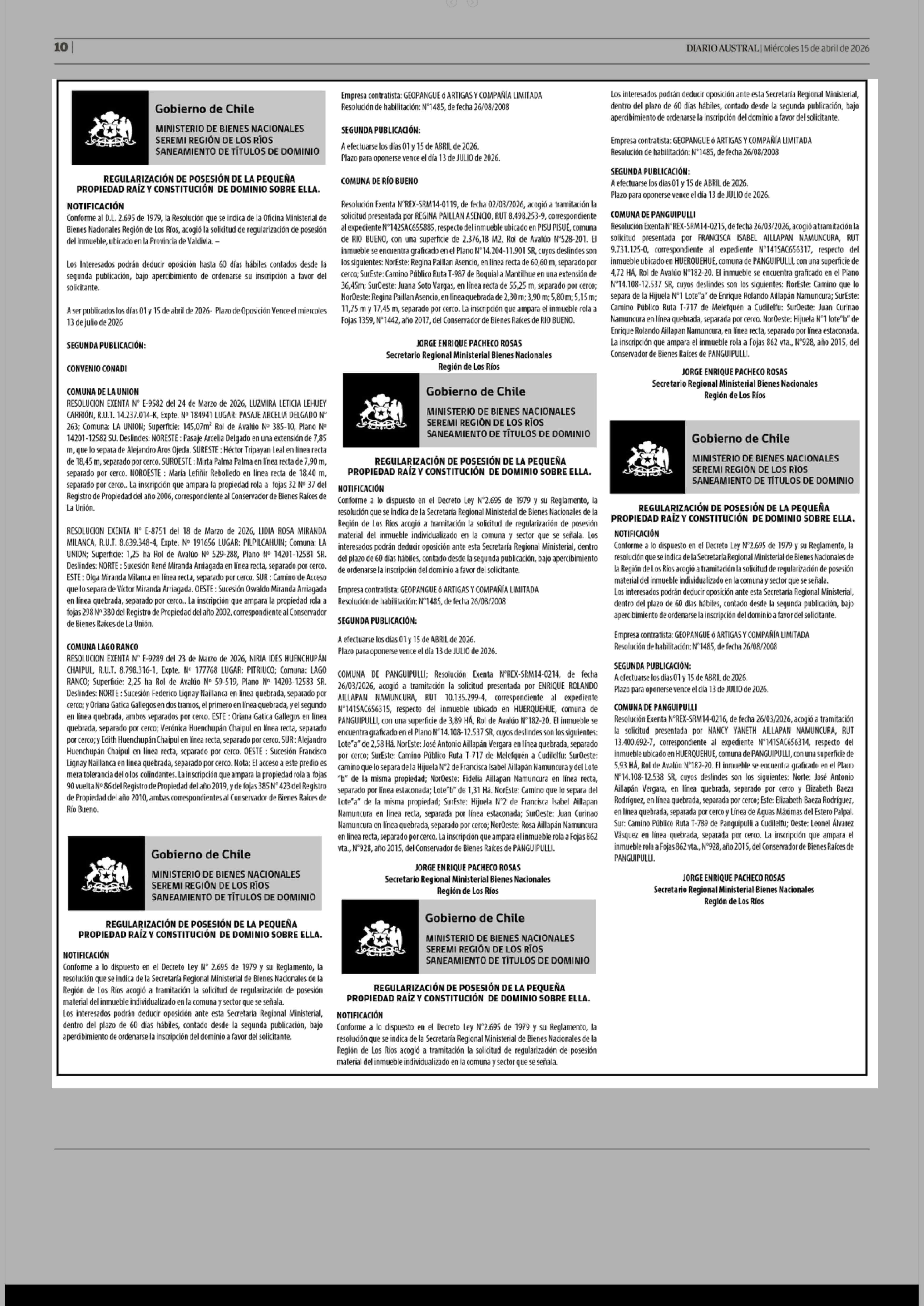 Fecha: 15-04-2026 Sector: Extractos Región: Región de Los Ríos