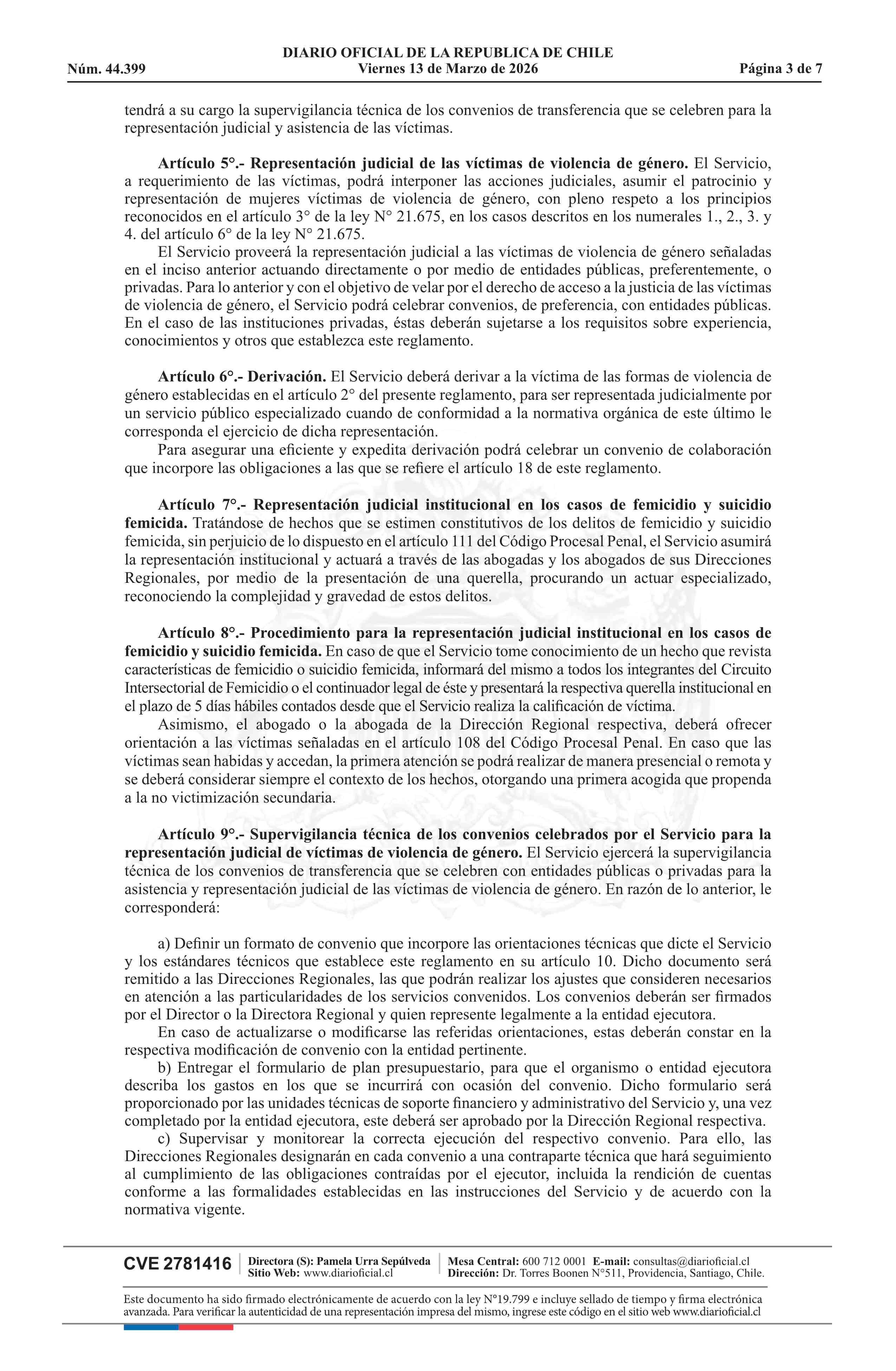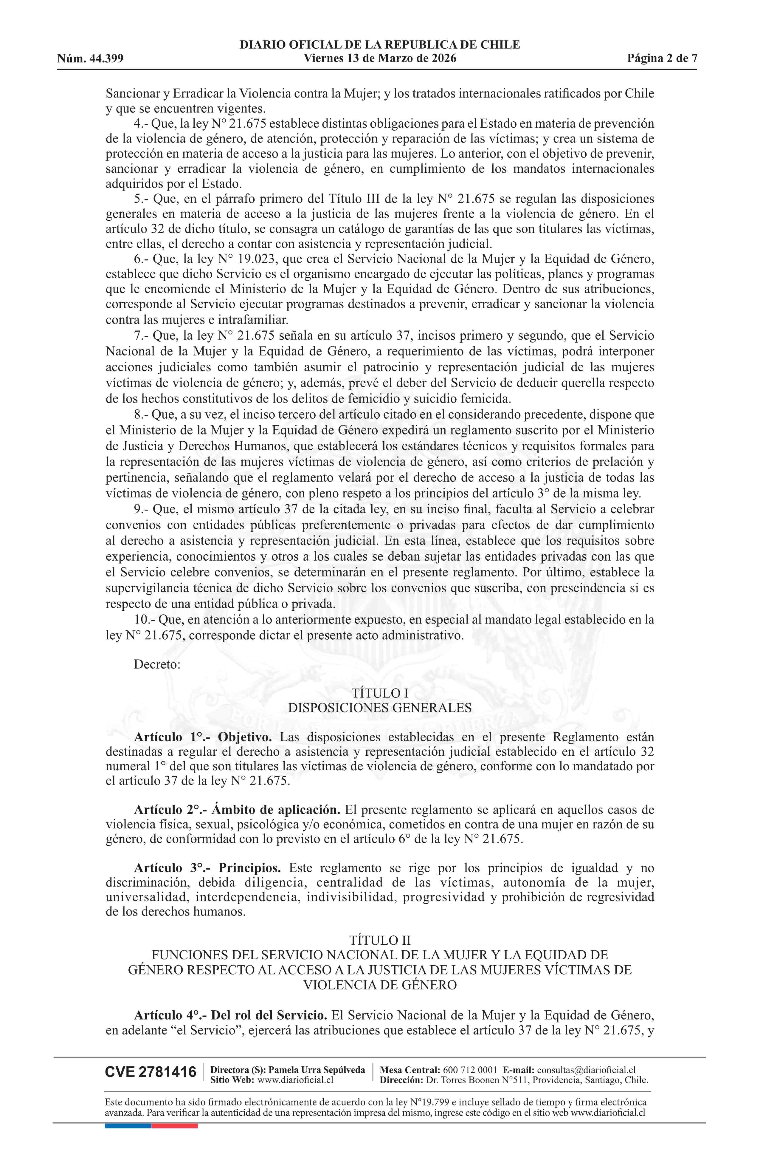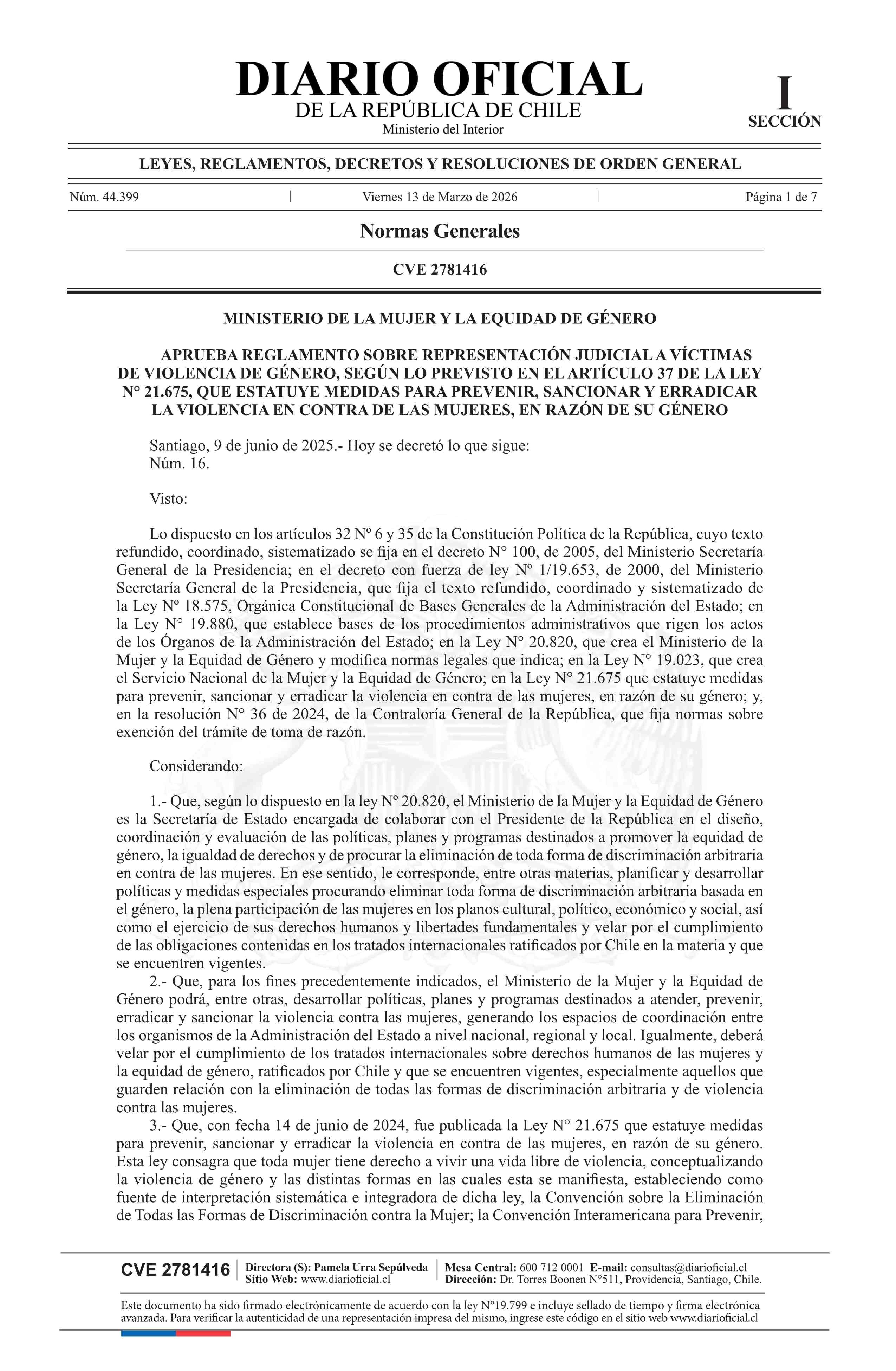Título: Decreto número 16, de 2025.- Aprueba Reglamento sobre representación judicial a víctimas de violencia de género, según lo previsto en el artículo 37 de la ley N° 21.675, que estatuye medidas para prevenir, sancionar y erradicar la violencia en contra de las mujeres, en razón de su género