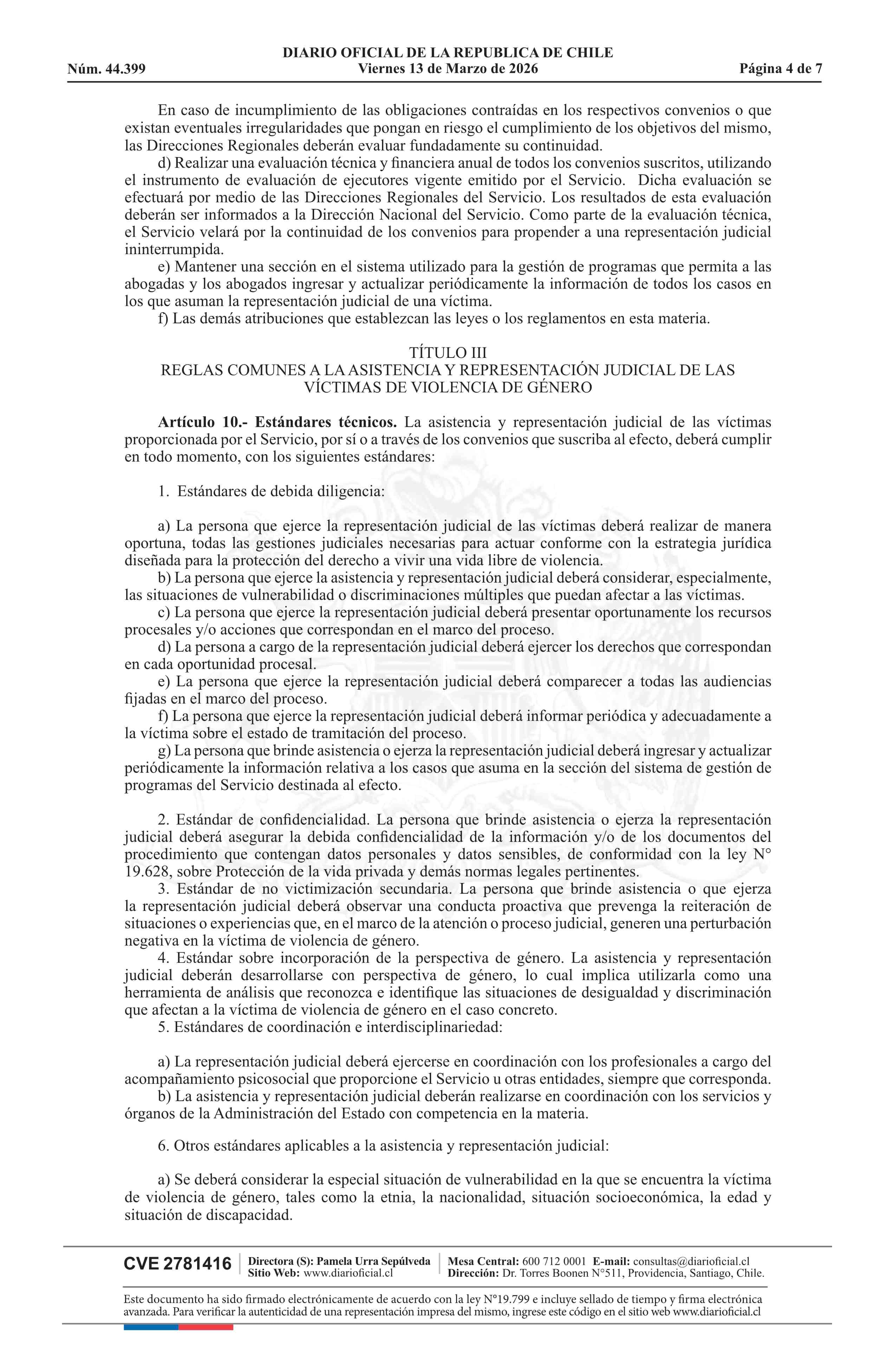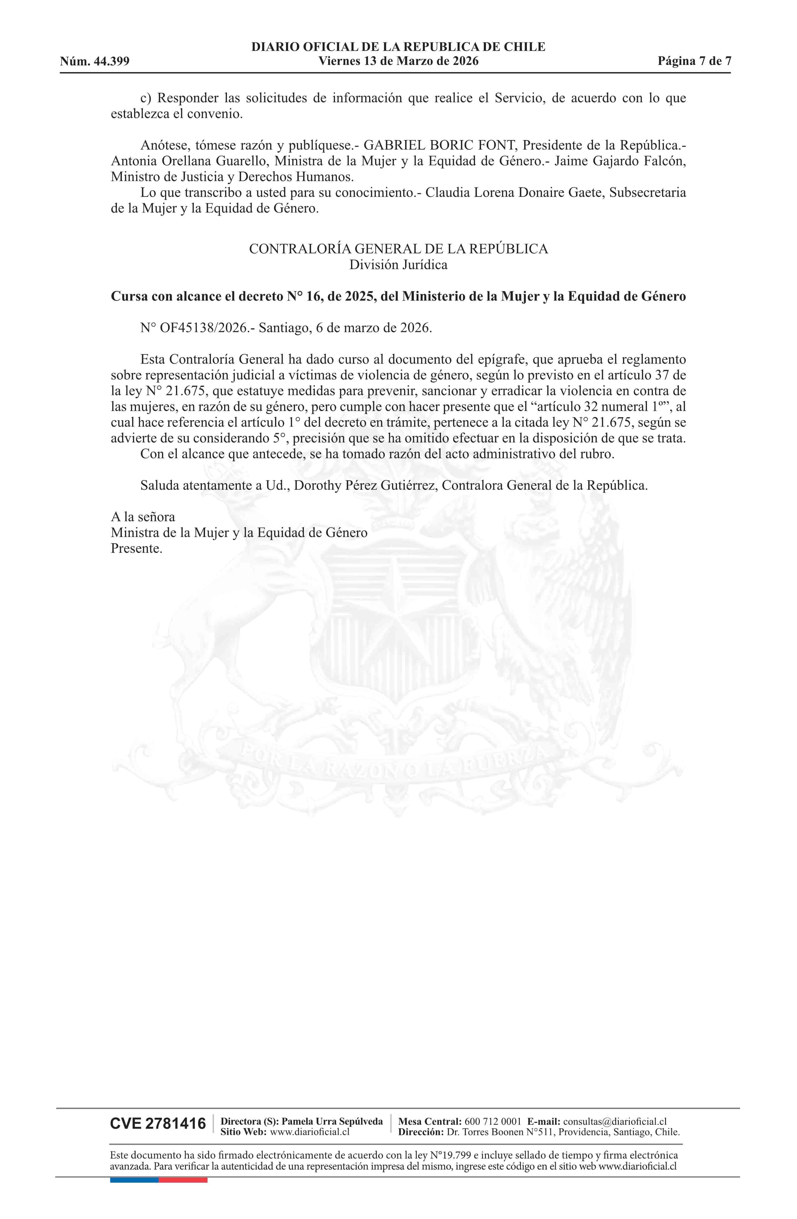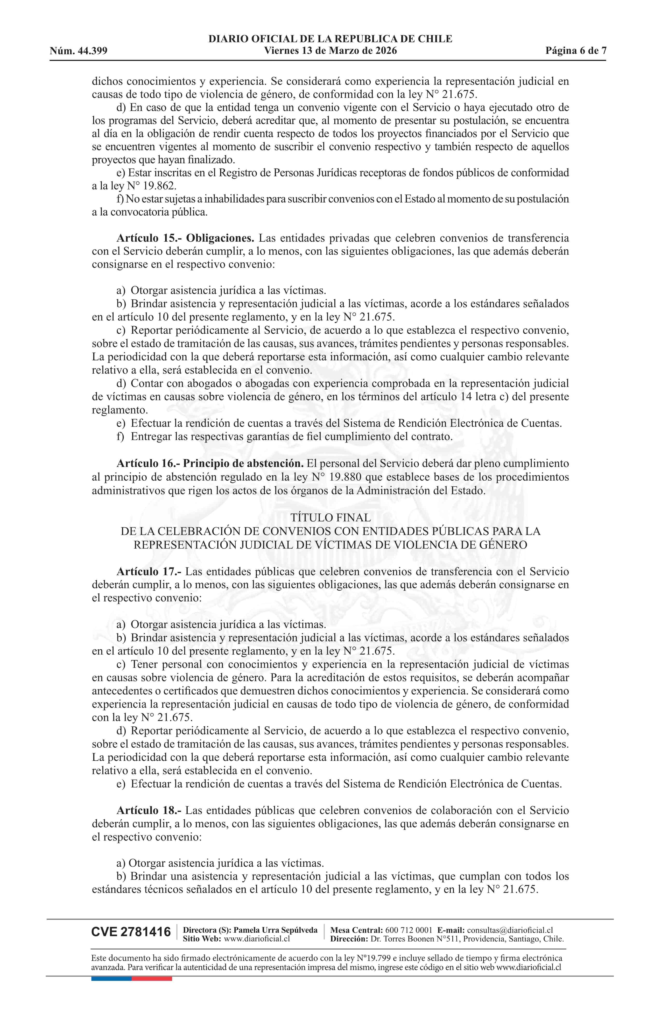 Título: Decreto número 16, de 2025.- Aprueba Reglamento sobre representación judicial a víctimas de violencia de género, según lo previsto en el artículo 37 de la ley N° 21.675, que estatuye medidas para prevenir, sancionar y erradicar la violencia en contra de las mujeres, en razón de su género