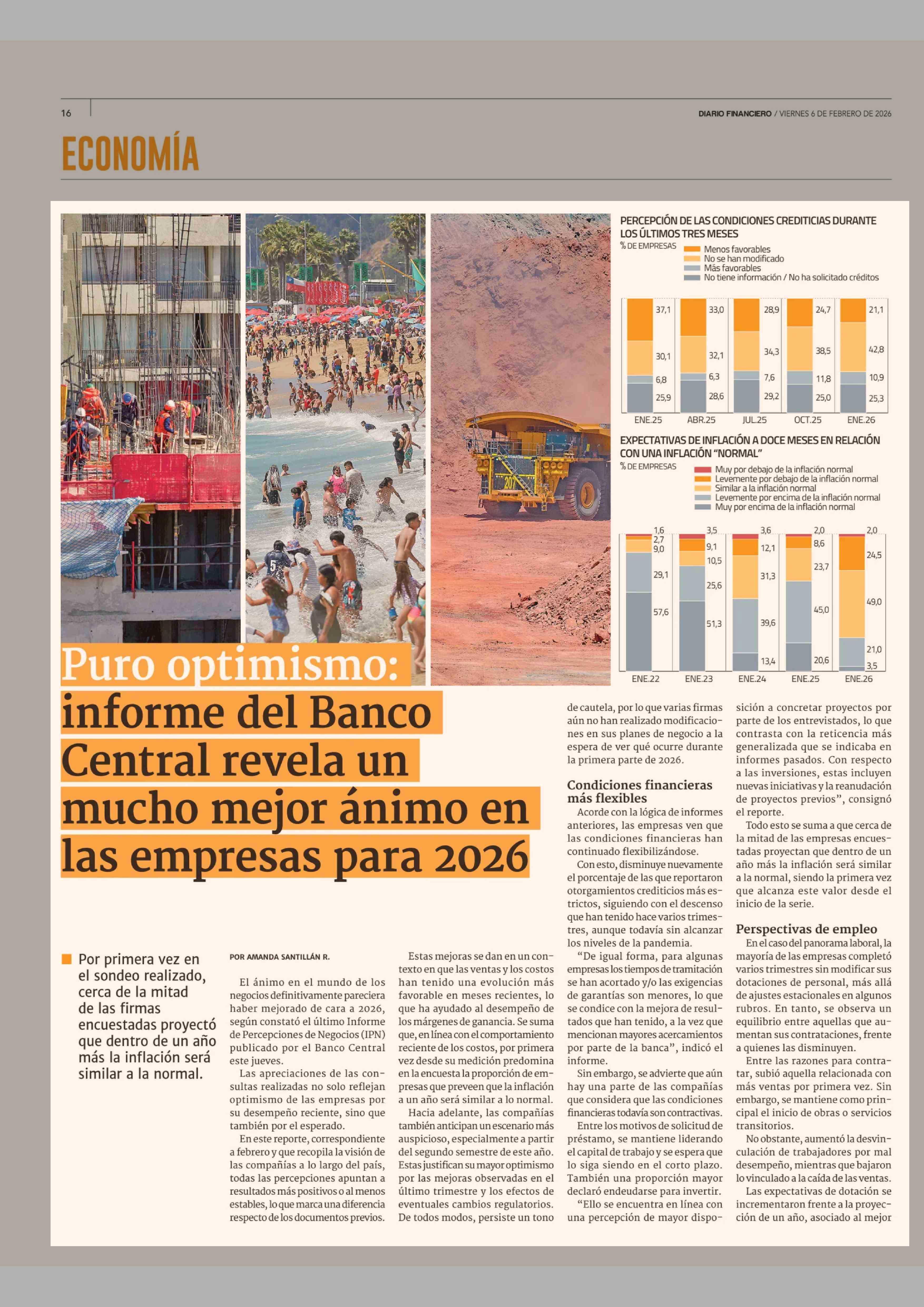 Puro optimismo: informe del Banco Central revela un mucho mejor ánimo en las empresas para 2026 06-02-2026 Diario Financiero |