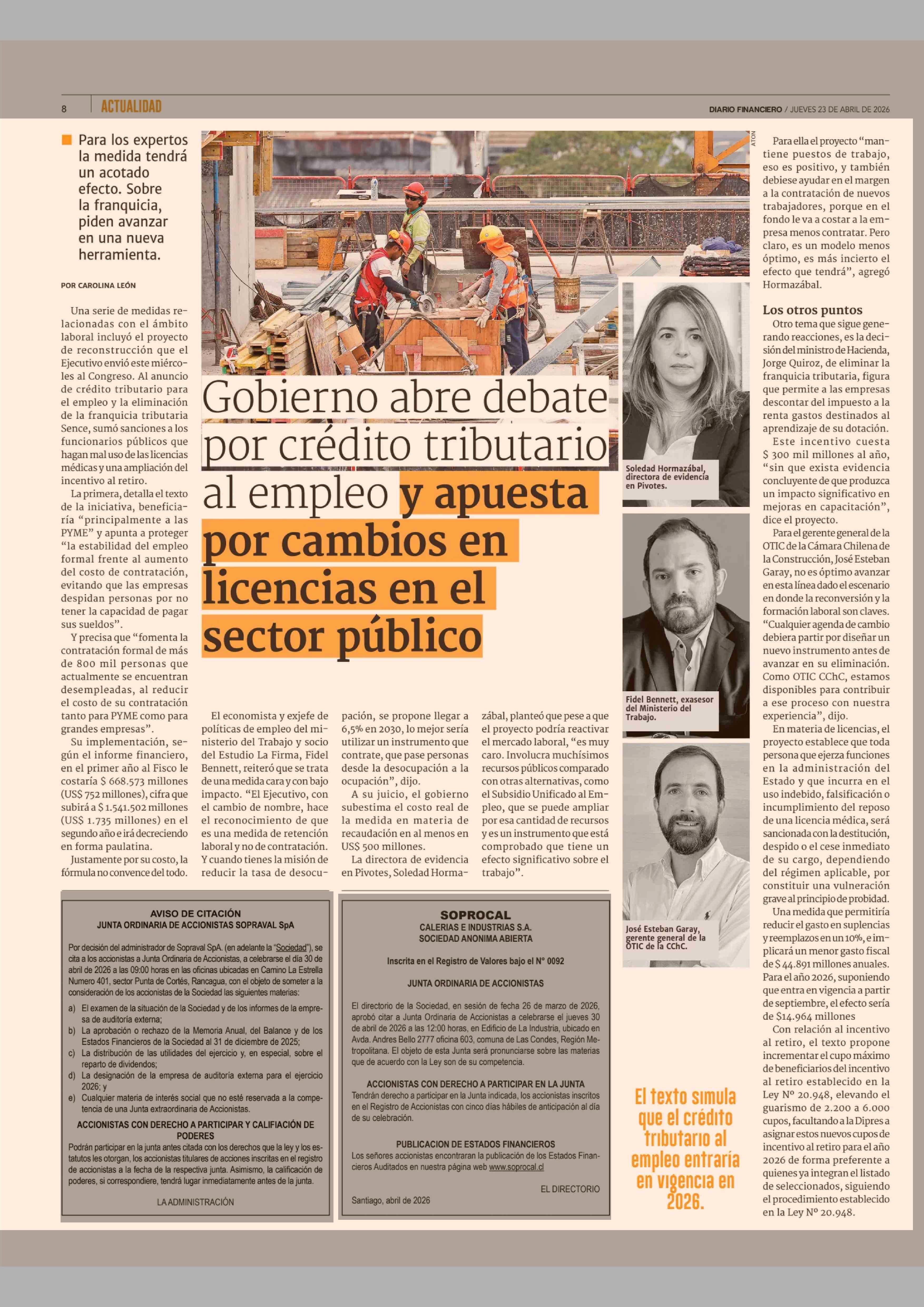 Gobierno abre debate por crédito tributario al empleo y apuesta por cambios en licencias en el sector público 23-04-2026 Diario Financiero |
