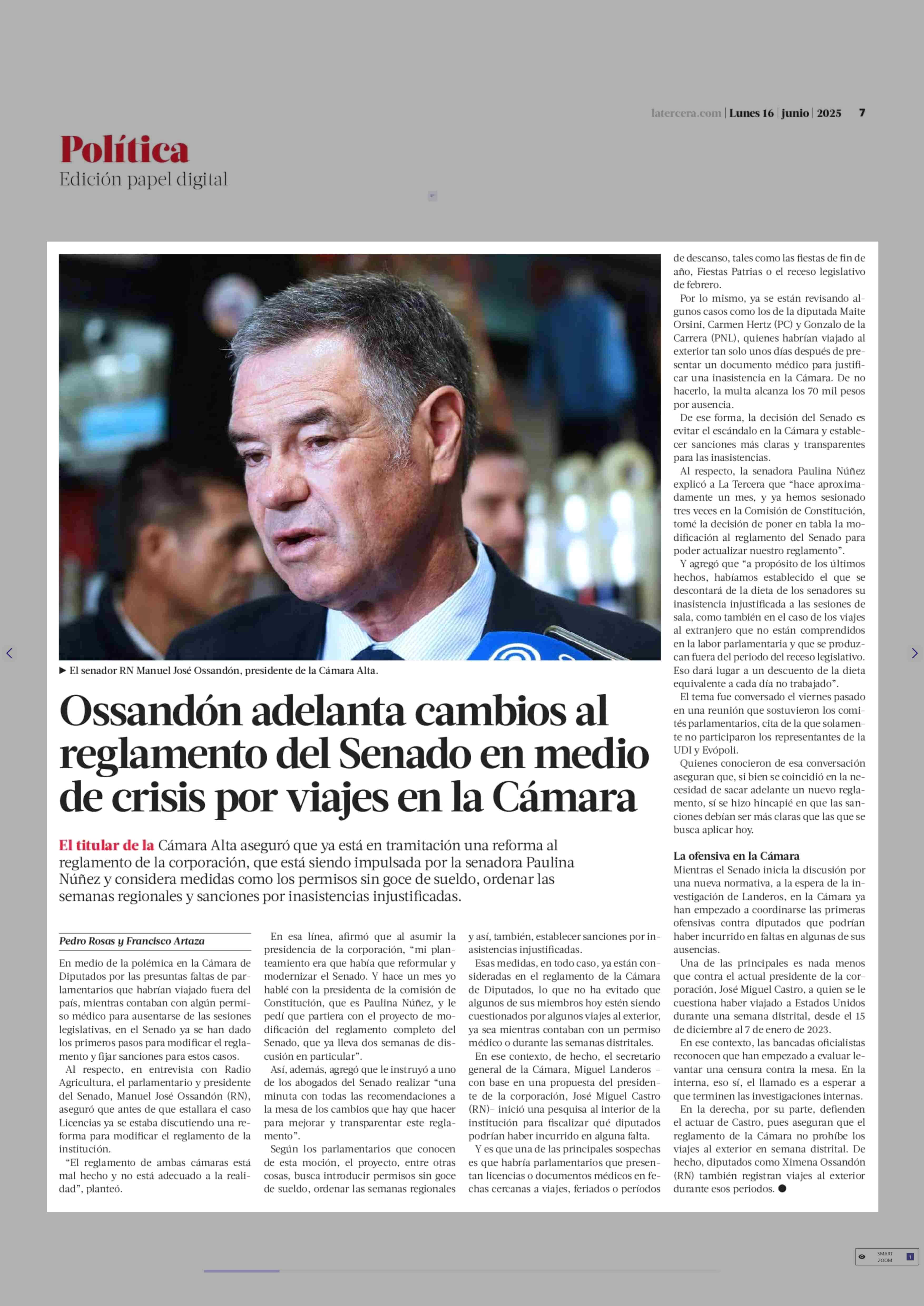 Ossandón adelanta cambios al reglamento del Senado en medio de crisis por viajes en la Cámara 16-06-2025 La Tercera |