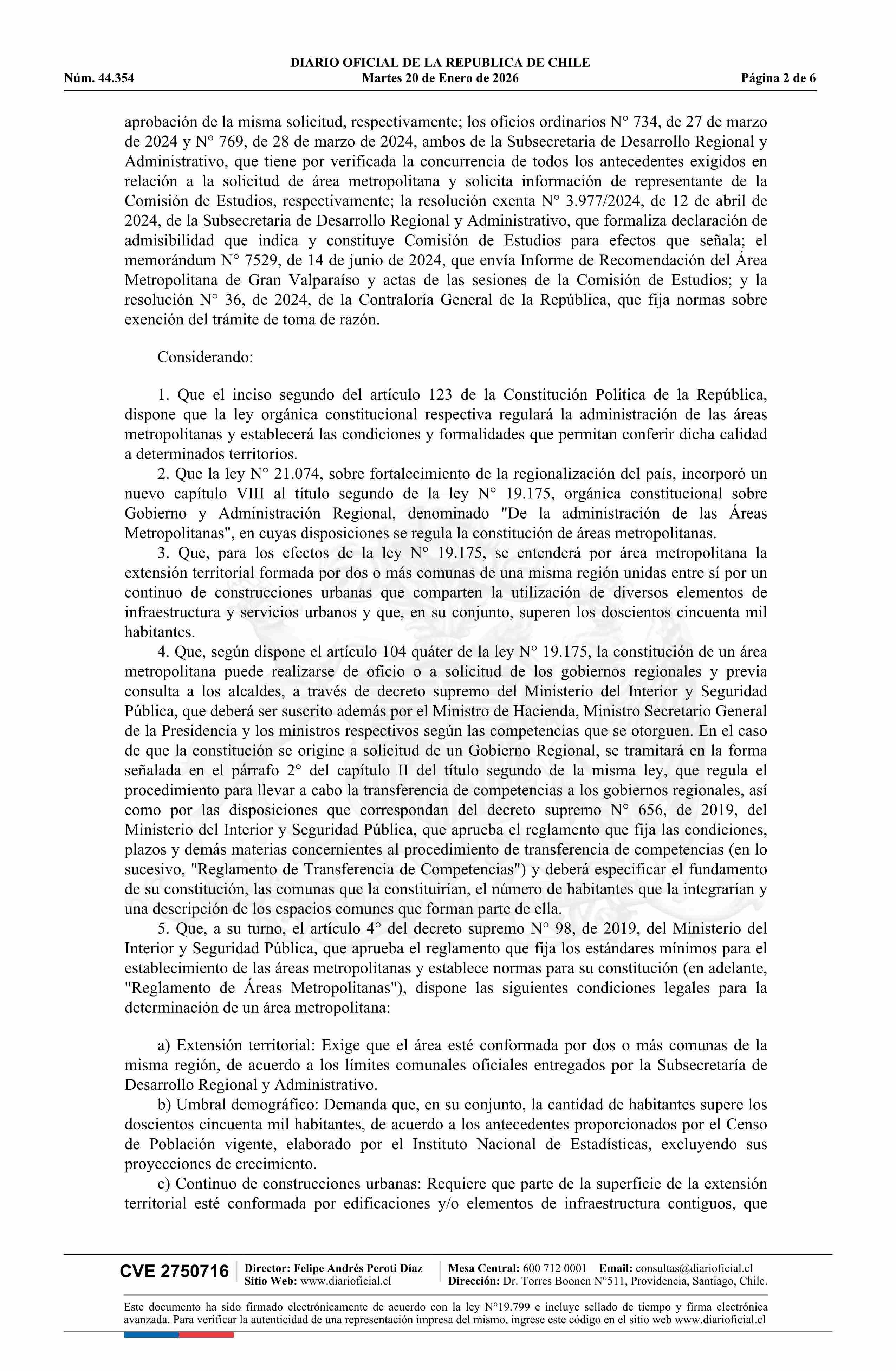 Decreto número 85, de 2025.- Constituye Área Metropolitana Gran Valparaíso 20-01-2026 DIARIO OFICIAL CHILE - BOLETÍN OFICIAL DE MINERÍA |