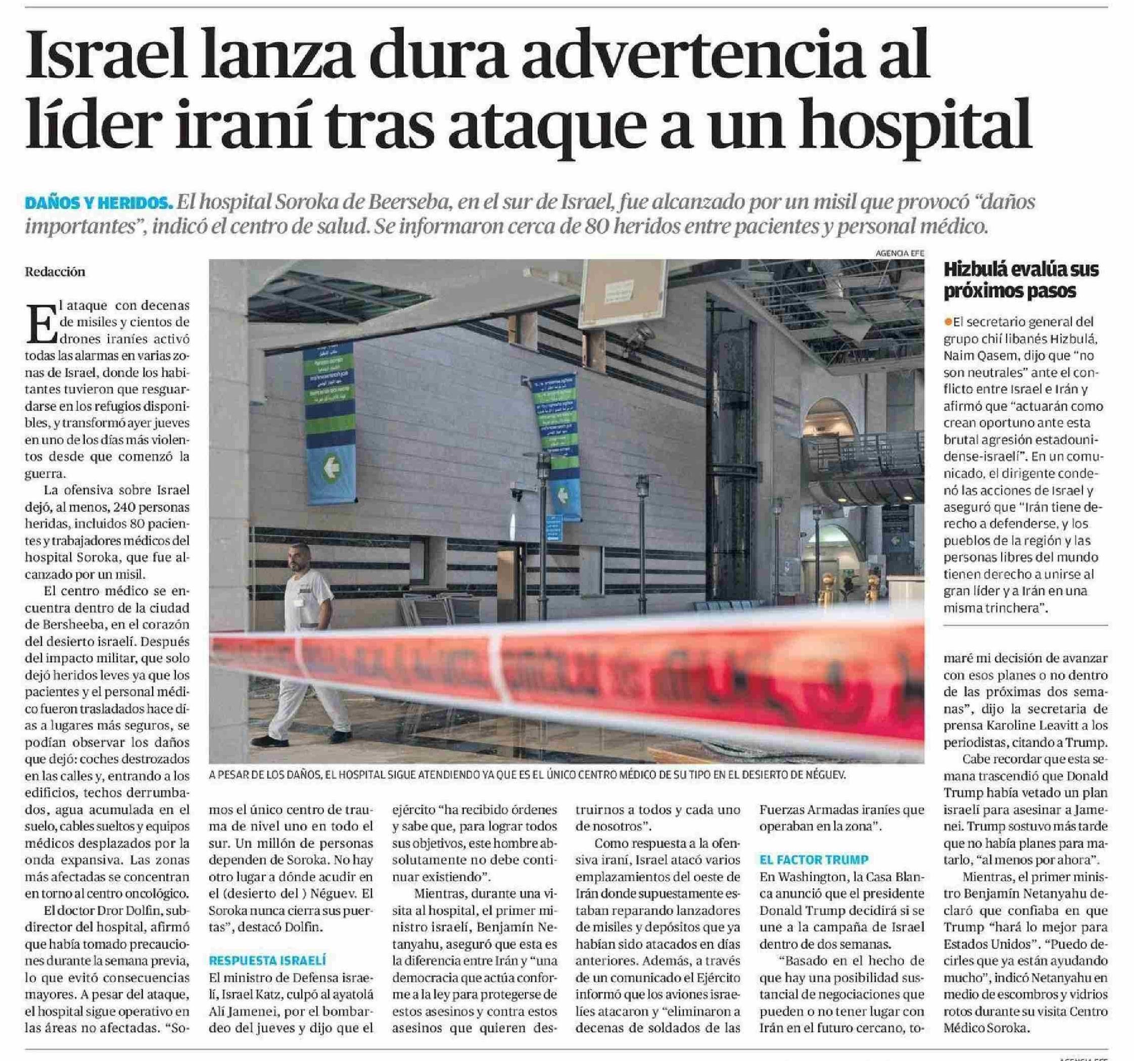 Israel lanza dura advertencia al líder iraní tras ataque a un hospital 20-06-2025 El Diario de Atacama |