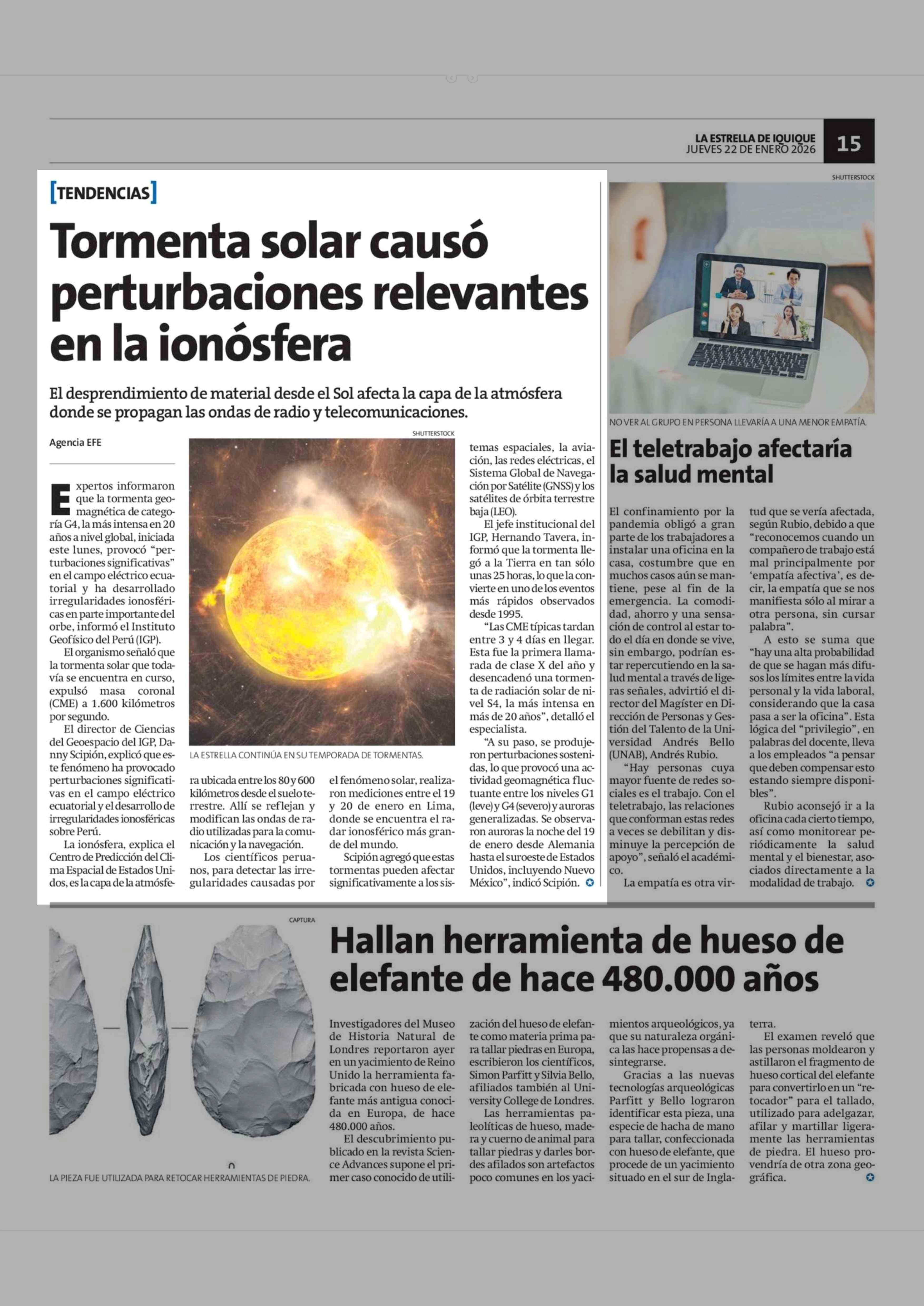 Tormenta solar causó perturbaciones relevantes en la ionósfera 22-01-2026 La Estrella de Iquique |