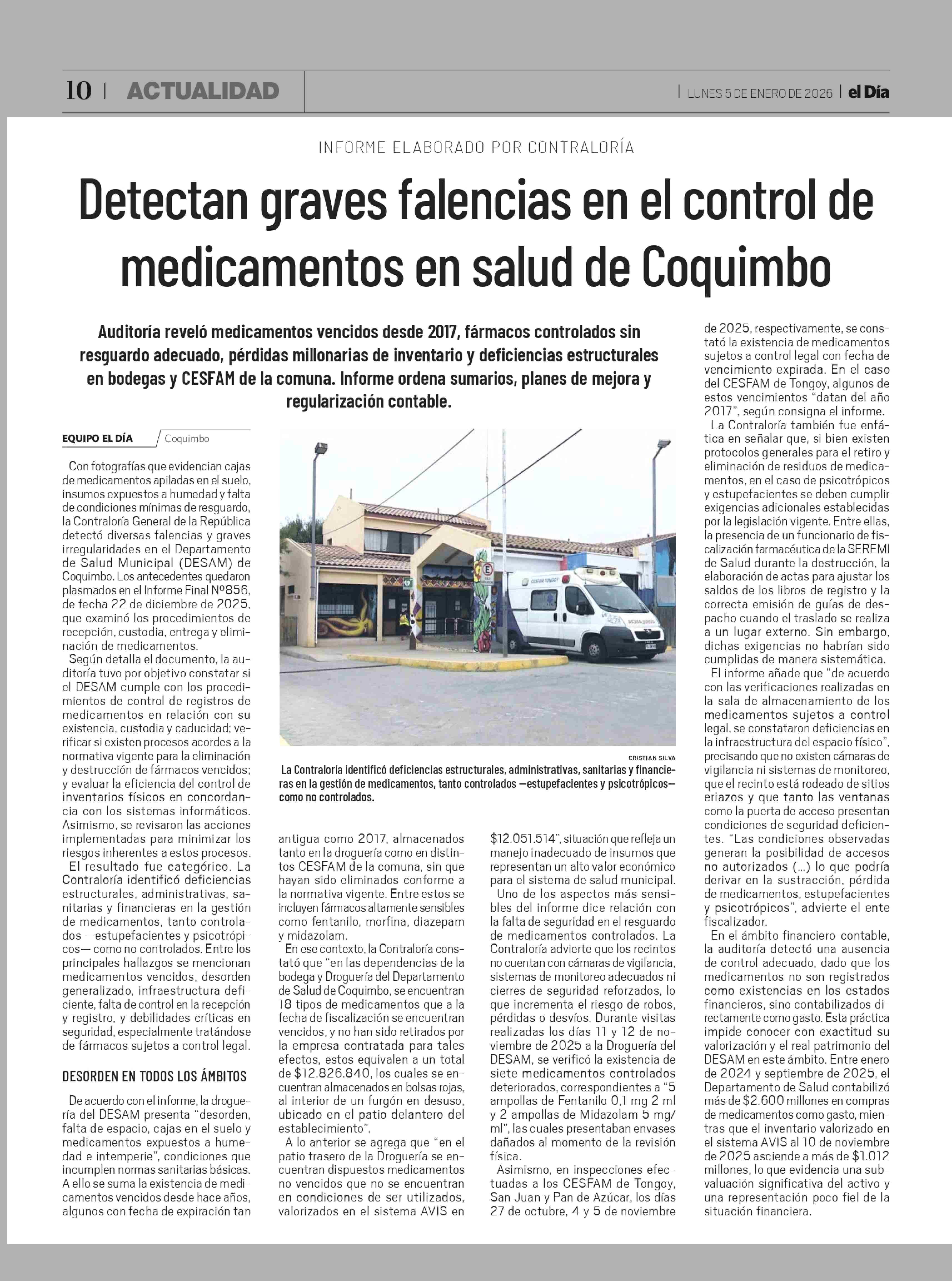 Detectan graves falencias en el control de medicamentos en salud de Coquimbo 05-01-2026 El Día |