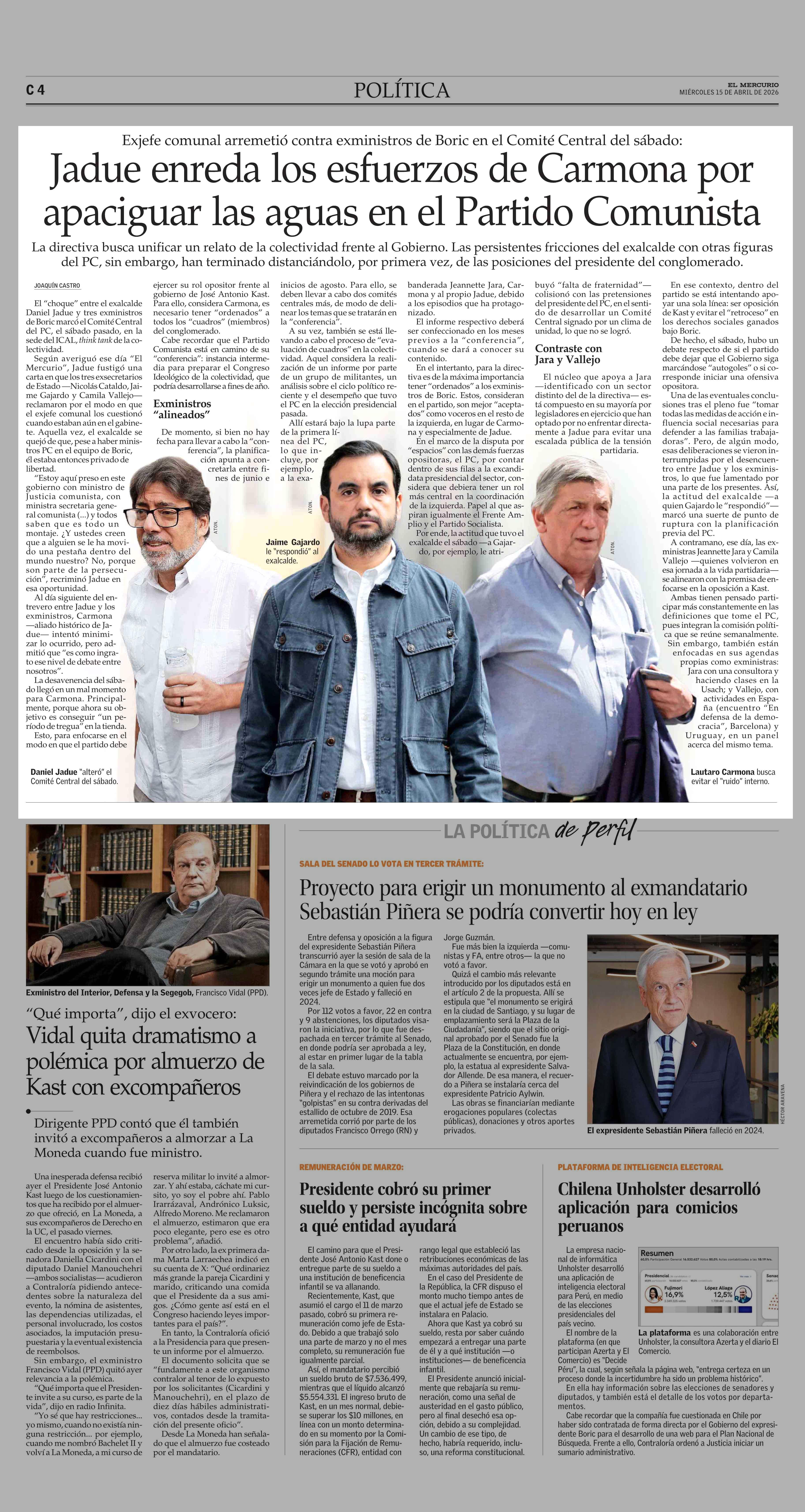 Jadue enreda los esfuerzos de Carmona por apaciguar las aguas en el Partido Comunista 15-04-2026 El Mercurio |