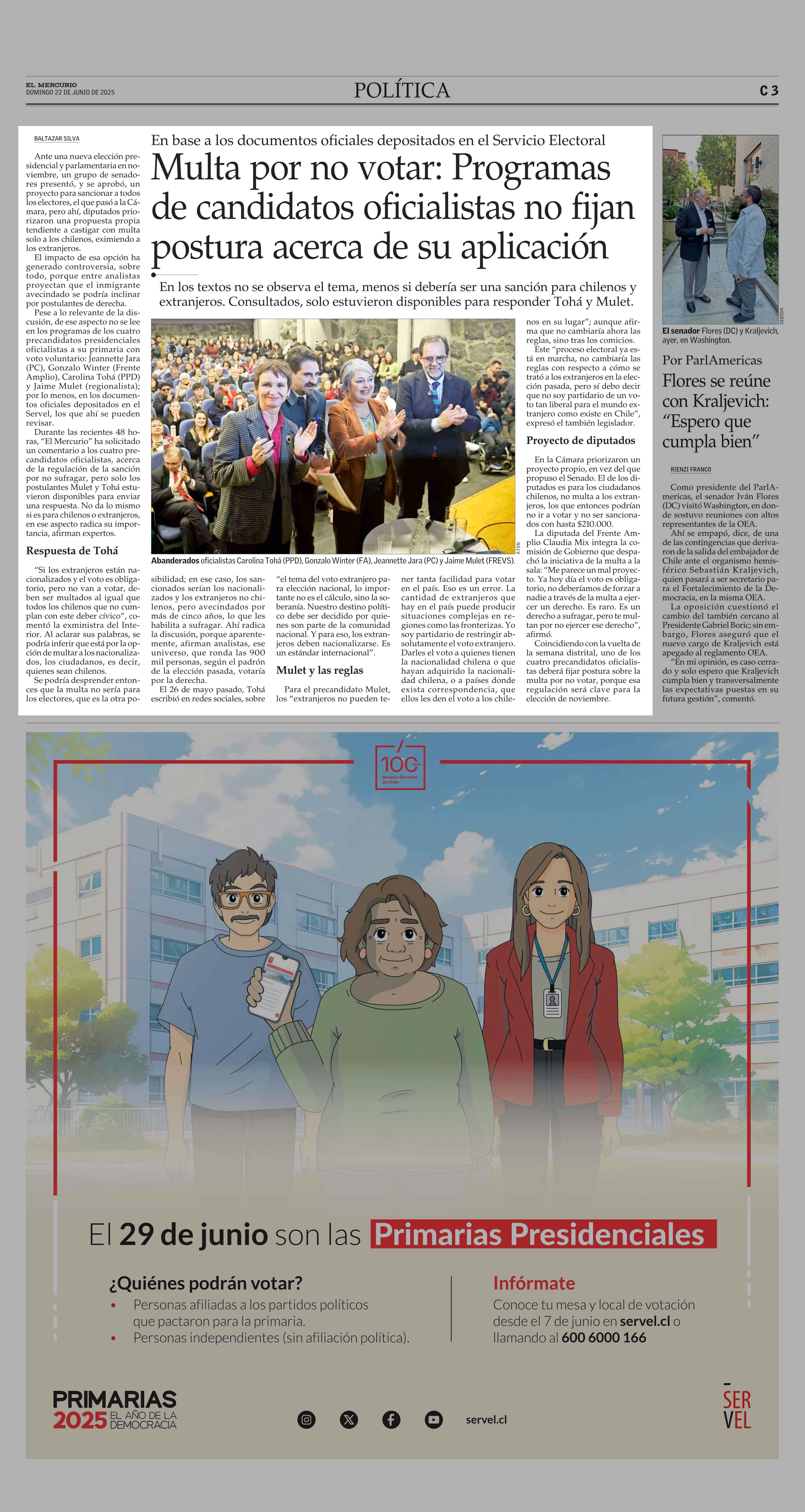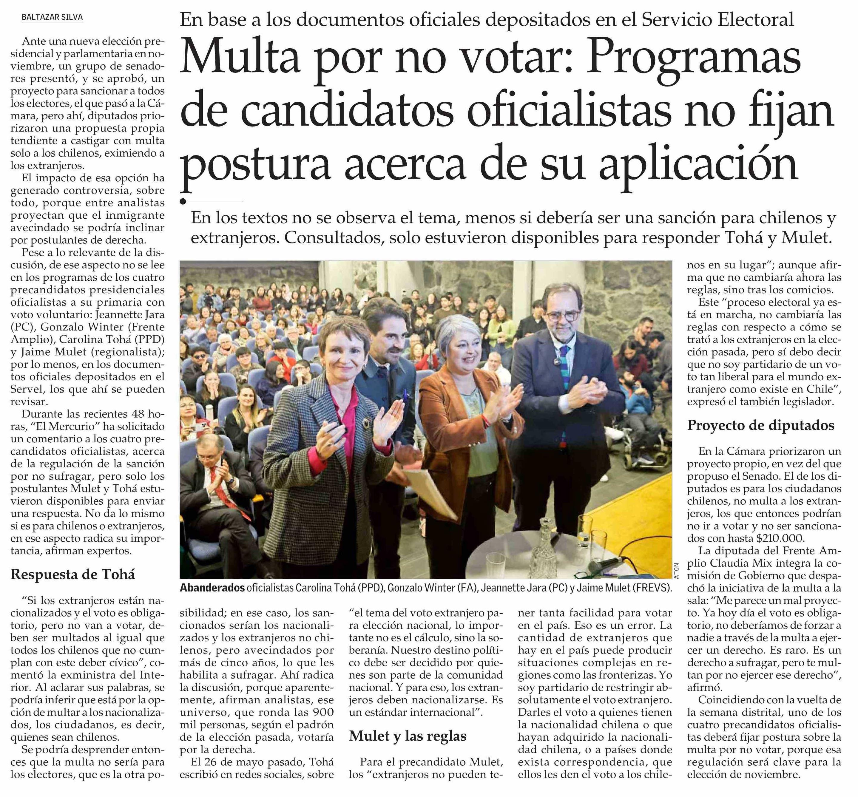 Multa por no votar: Programas de candidatos oficialistas no fijan postura acerca de su aplicación 22-06-2025 El Mercurio |