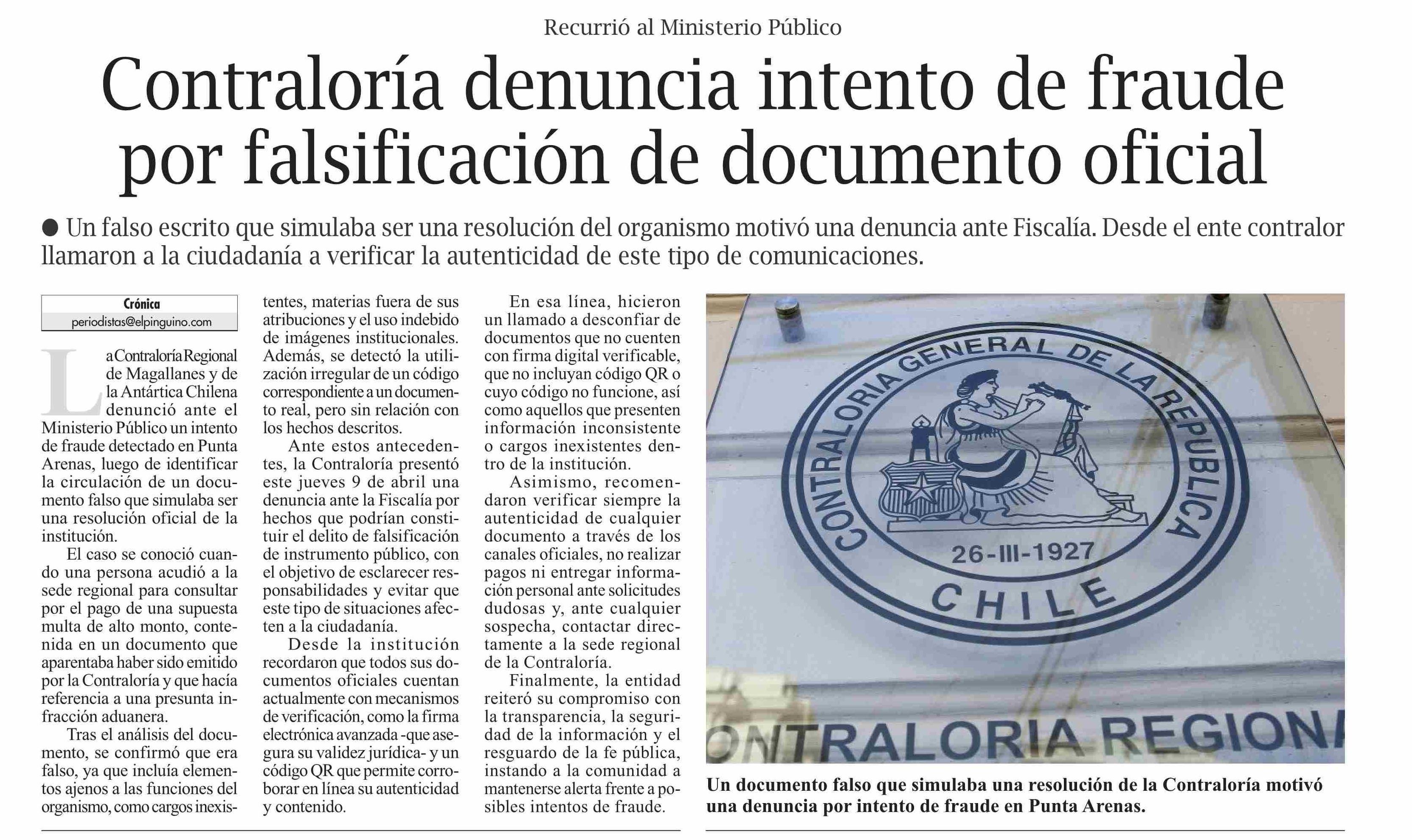 Título: Contraloría denuncia intento de fraude por falsificación de documento oficial