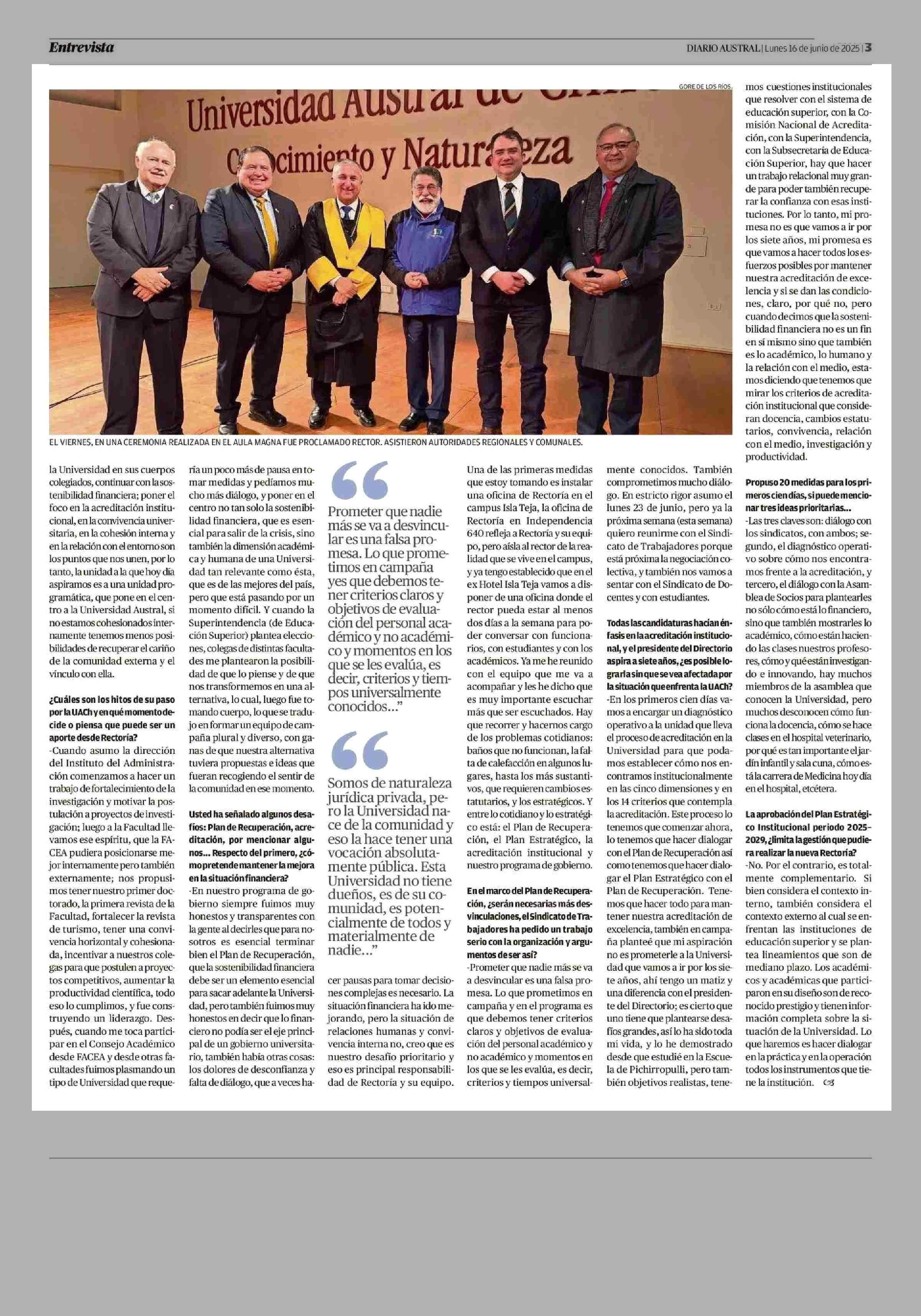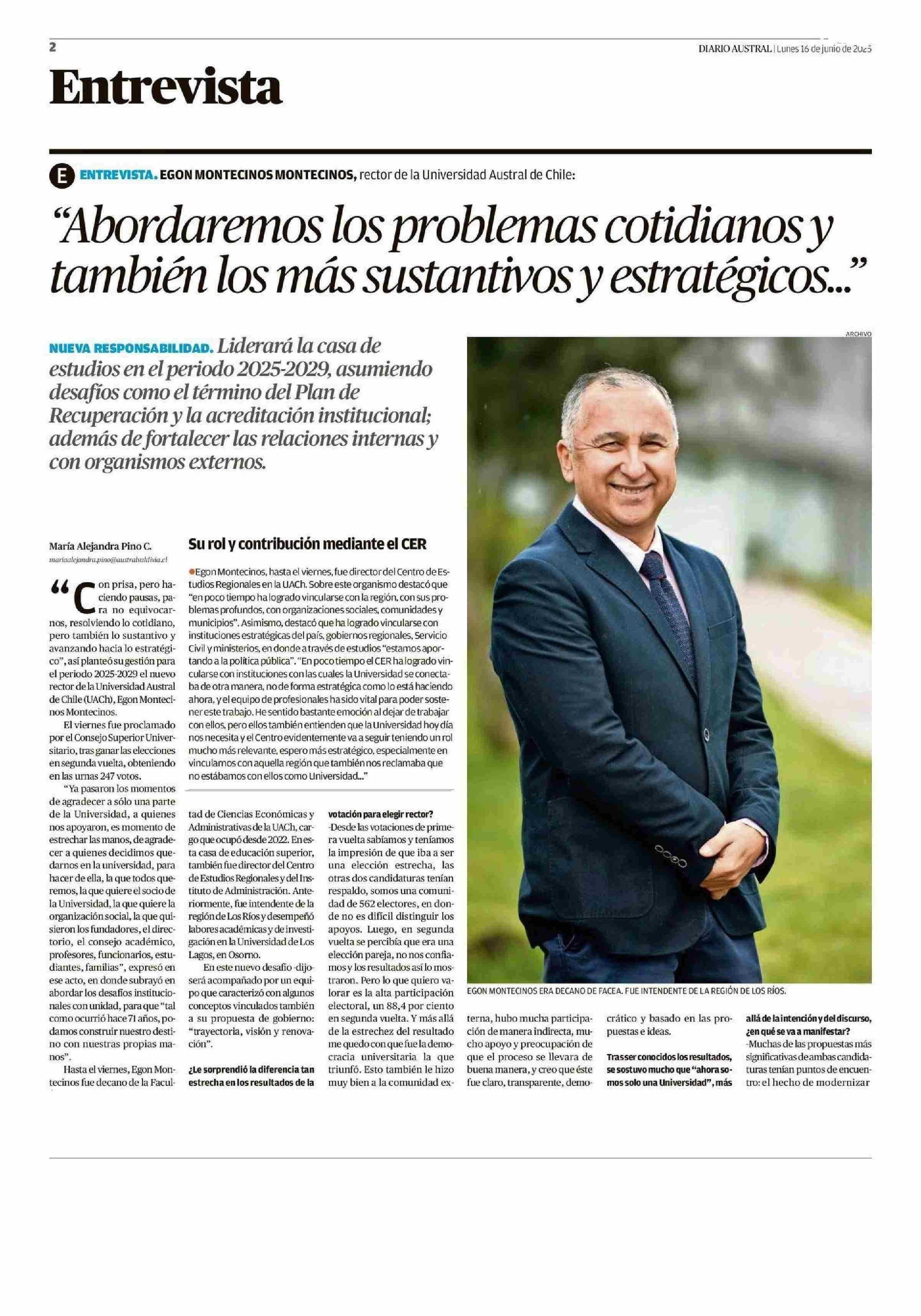 "Abordaremos los problemas cotidianos y también los más sustantivos y estratégicos ... " 16-06-2025 Diario Austral Región de Los Ríos |