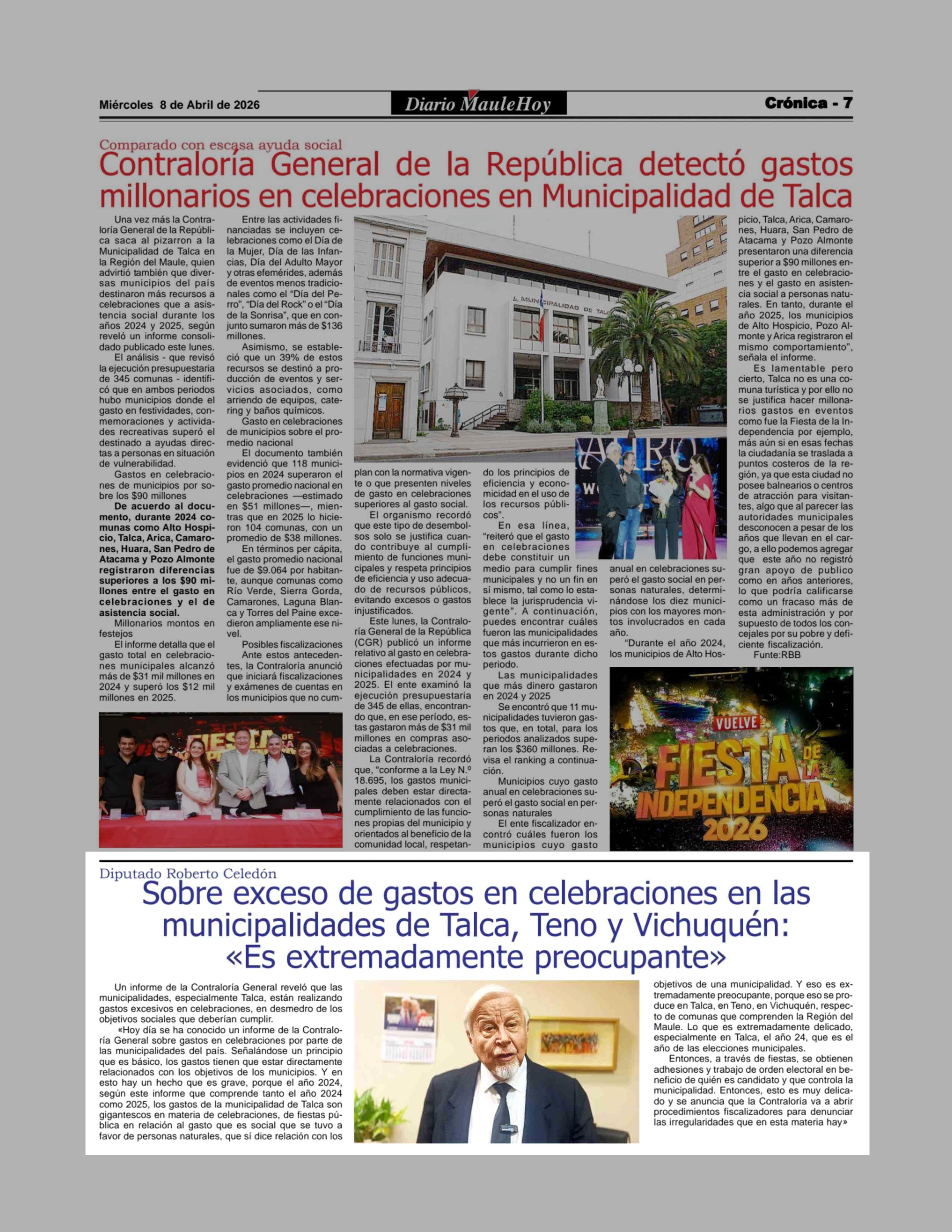Sobre exceso de gastos en celebraciones en las municipalidades de Talca, Teno y Vichuquén: «Es extremadamente preocupante» 08-04-2026 Maule Hoy |