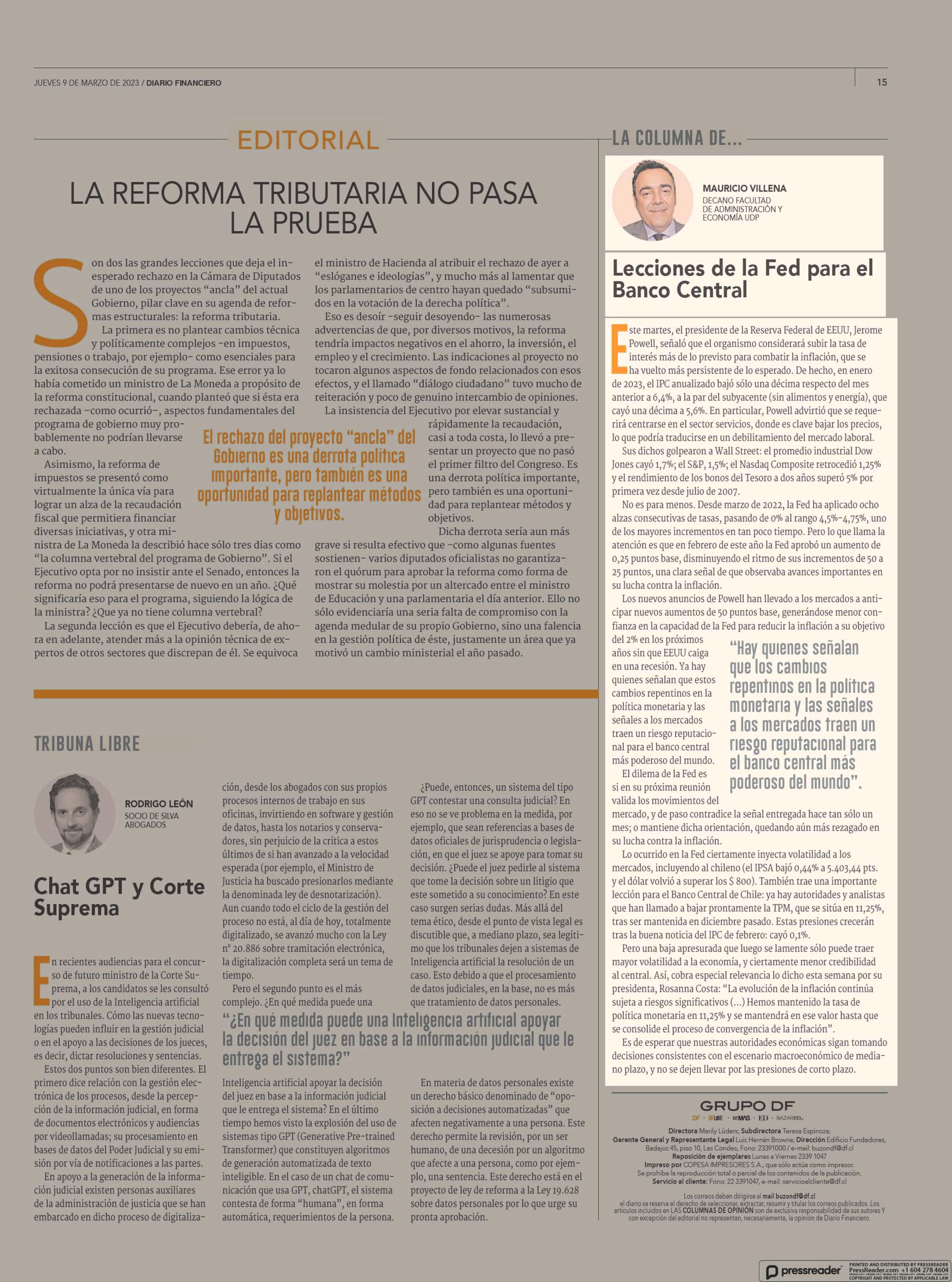 Lecciones de la Fed para el Banco Central 09-03-2023 Diario Financiero |