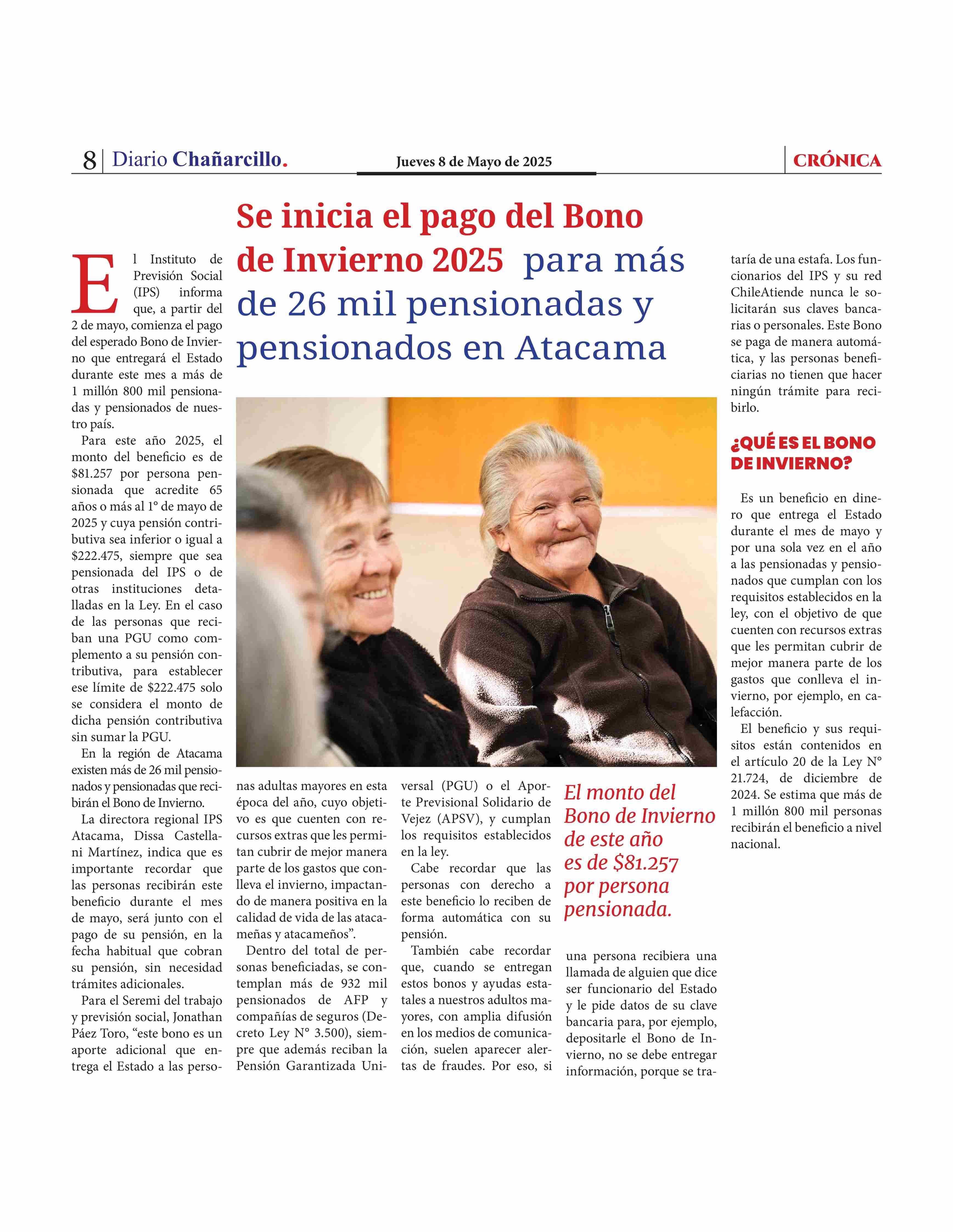 Se inicia el pago del Bono de Invierno 2025 para más de 26 mil pensionadas y pensionados en Atacama 08-05-2025 Diario Chañarcillo |
