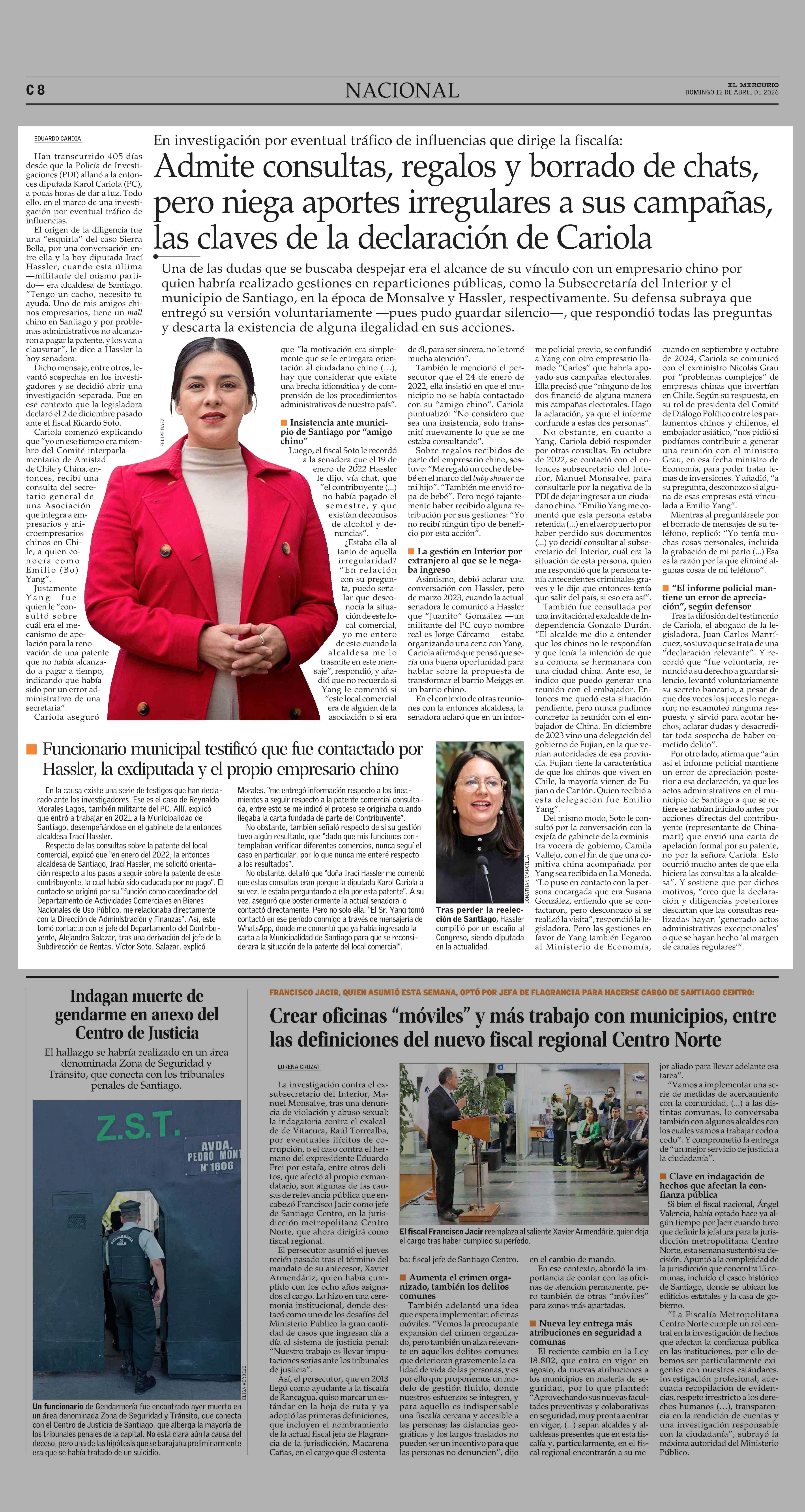 Admite consultas, regalos y borrado de chats, pero niega aportes irregulares a sus campañas, las claves de la declaración de Cariola 12-04-2026 El Mercurio |