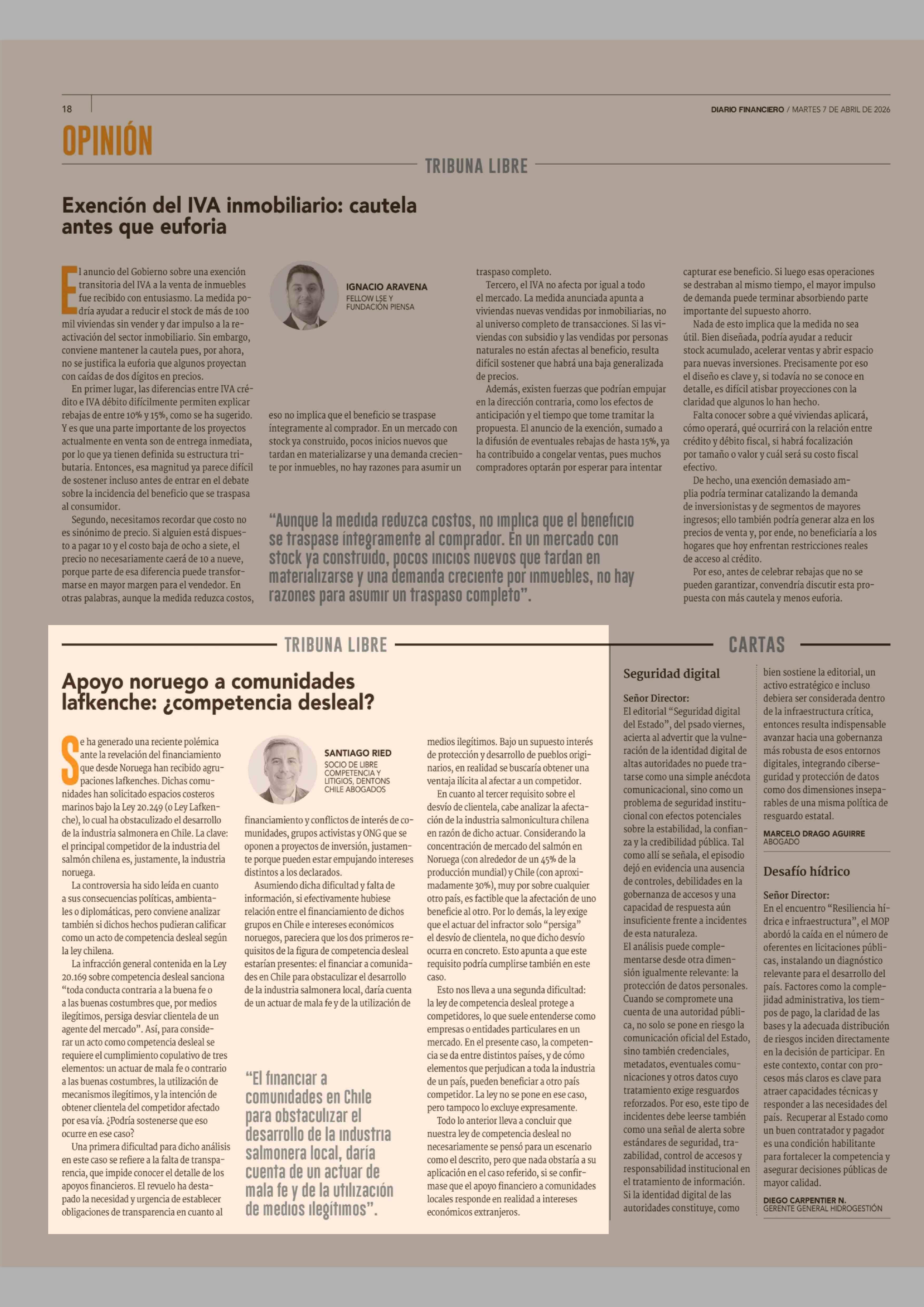 Columnas de Opinión: Apoyo noruego a comunidades lafkenche: ¿ competencia desleal? 07-04-2026 Diario Financiero |