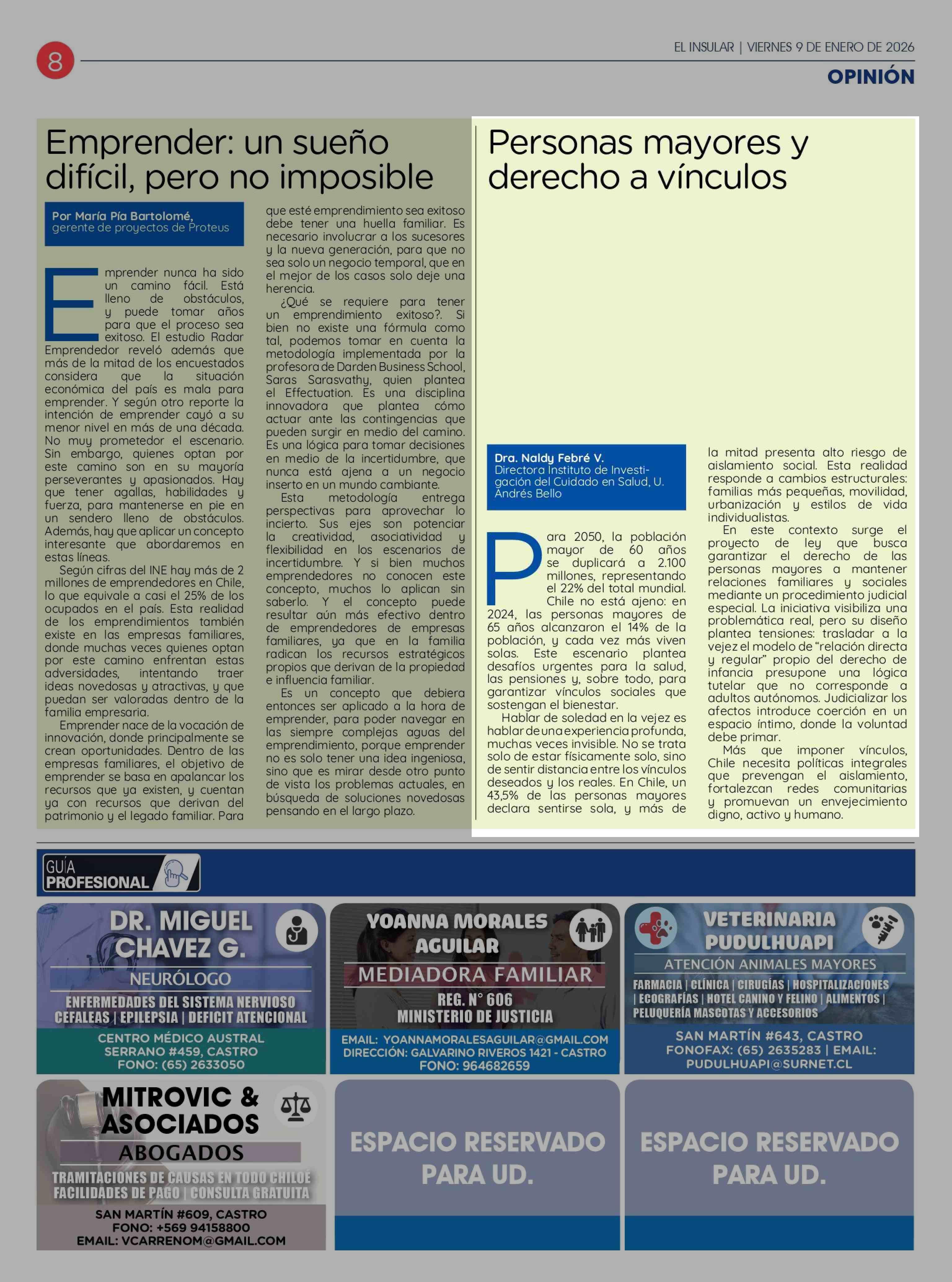 Columnas de Opinión: Personas mayores y derecho a vínculos 09-01-2026 El Insular |