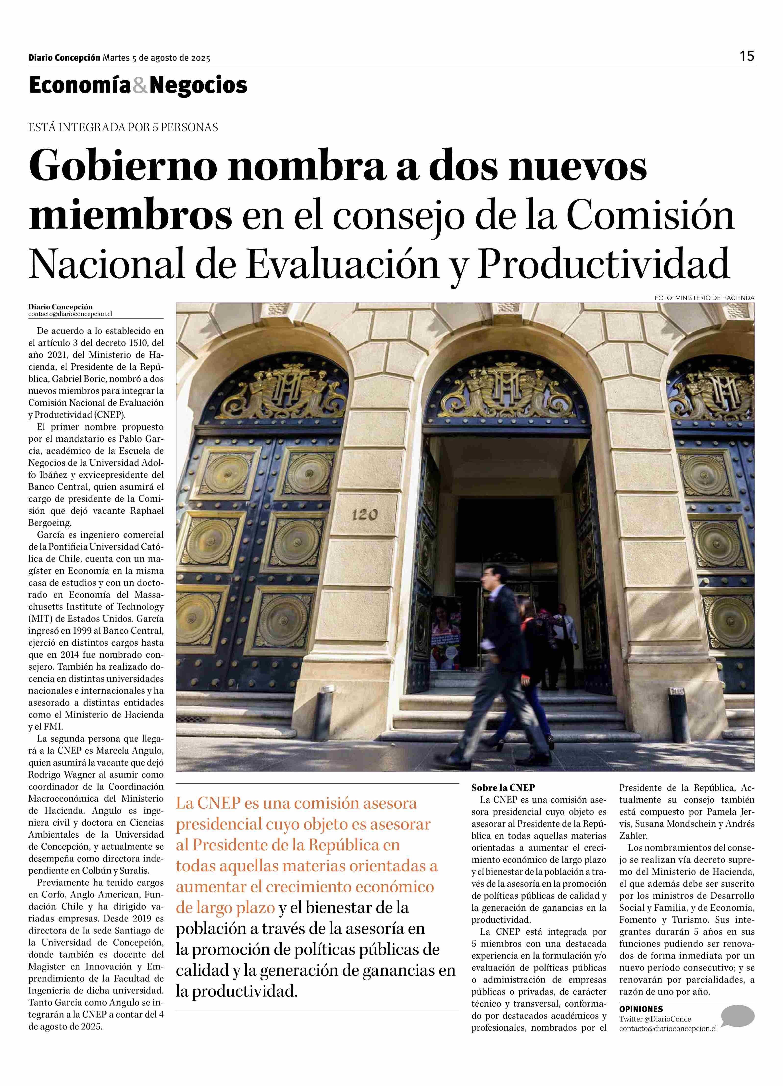 Gobierno nombra a dos nuevos miembros en el consejo de la Comisión Nacional de Evaluación y Productividad 05-08-2025 Diario Concepción |