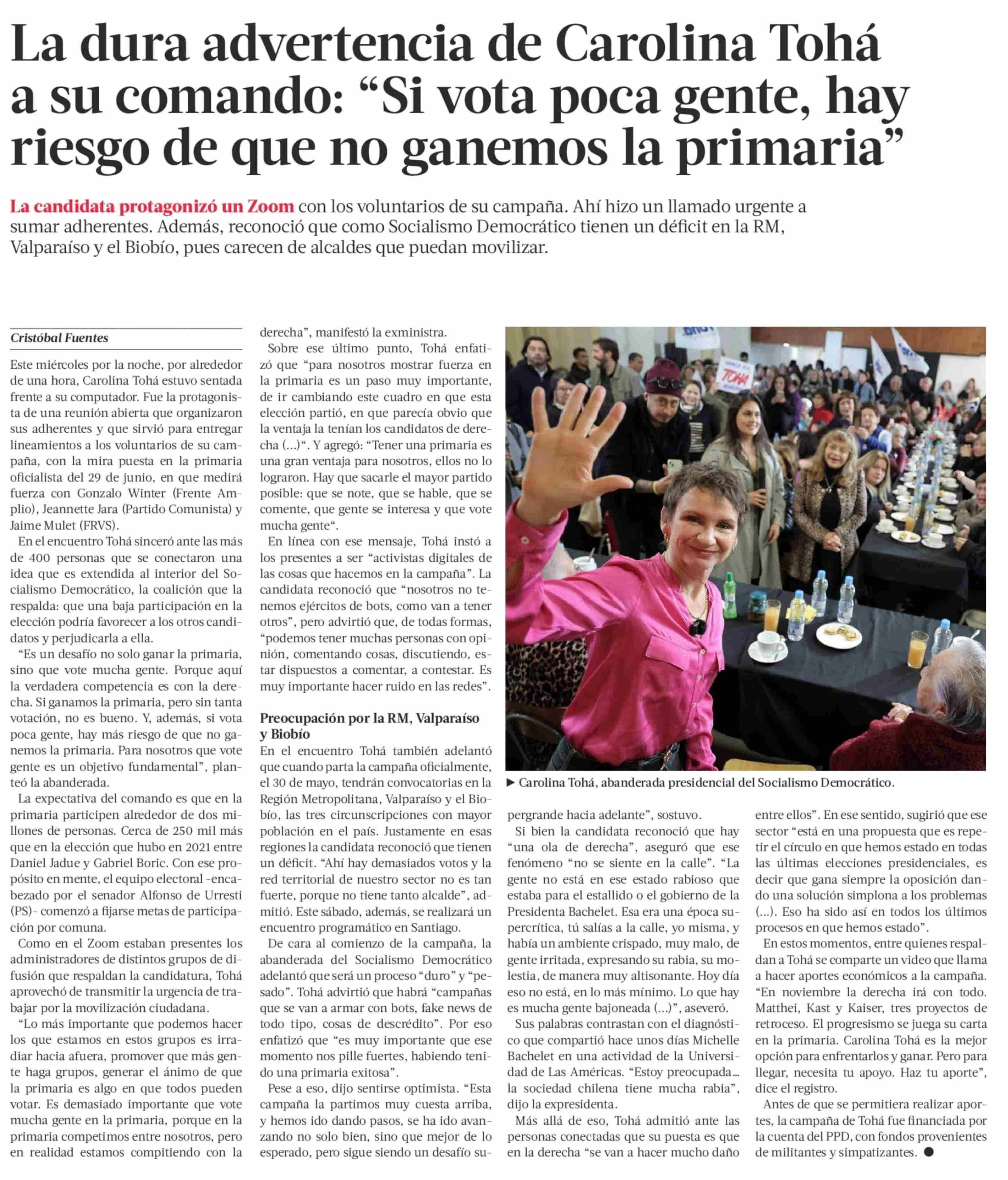 La dura advertencia de Carolina Tohá a su comando: “Si vota poca gente, hay riesgo de que no ganemos la primaria” 23-05-2025 La Tercera |