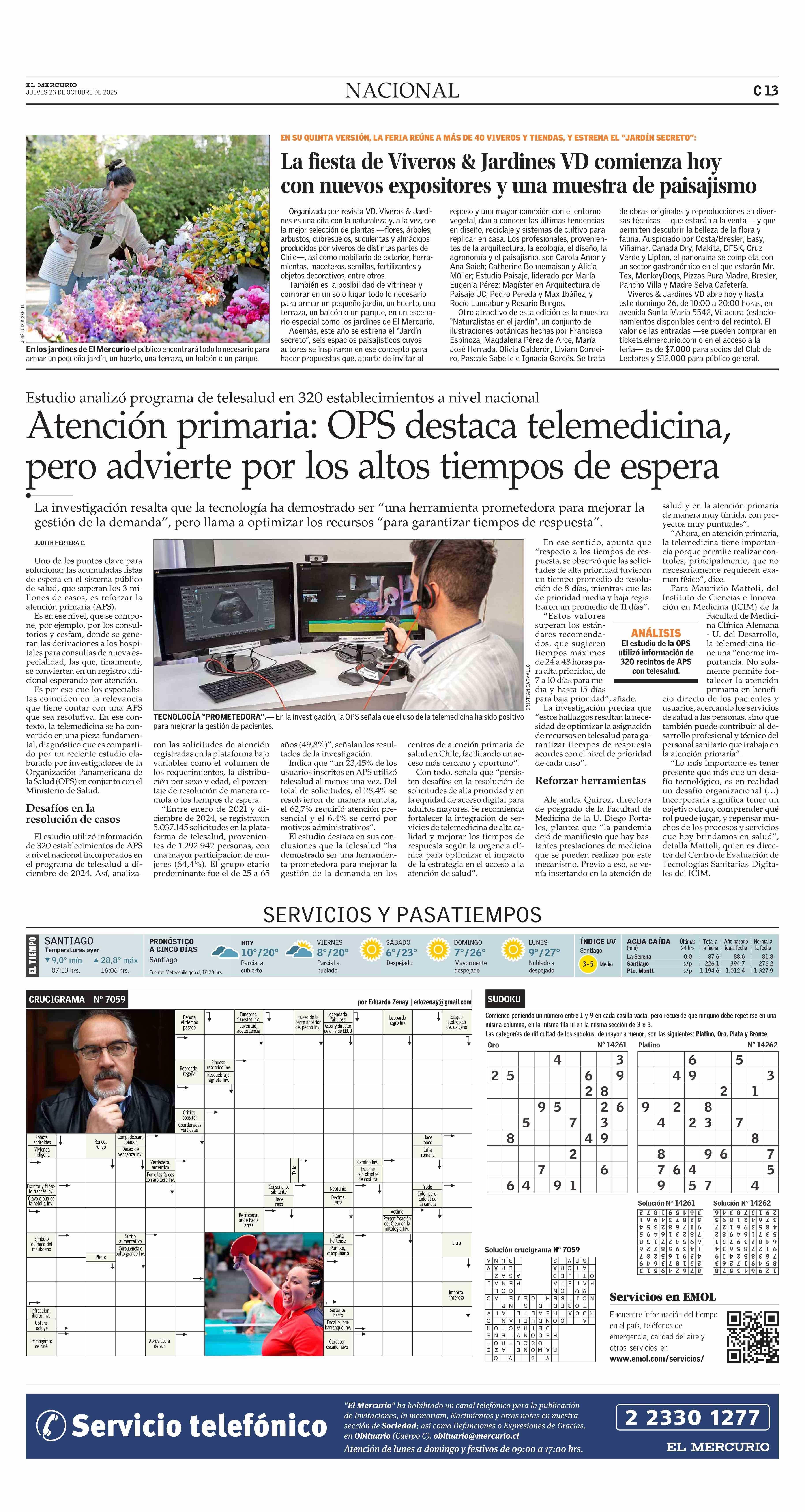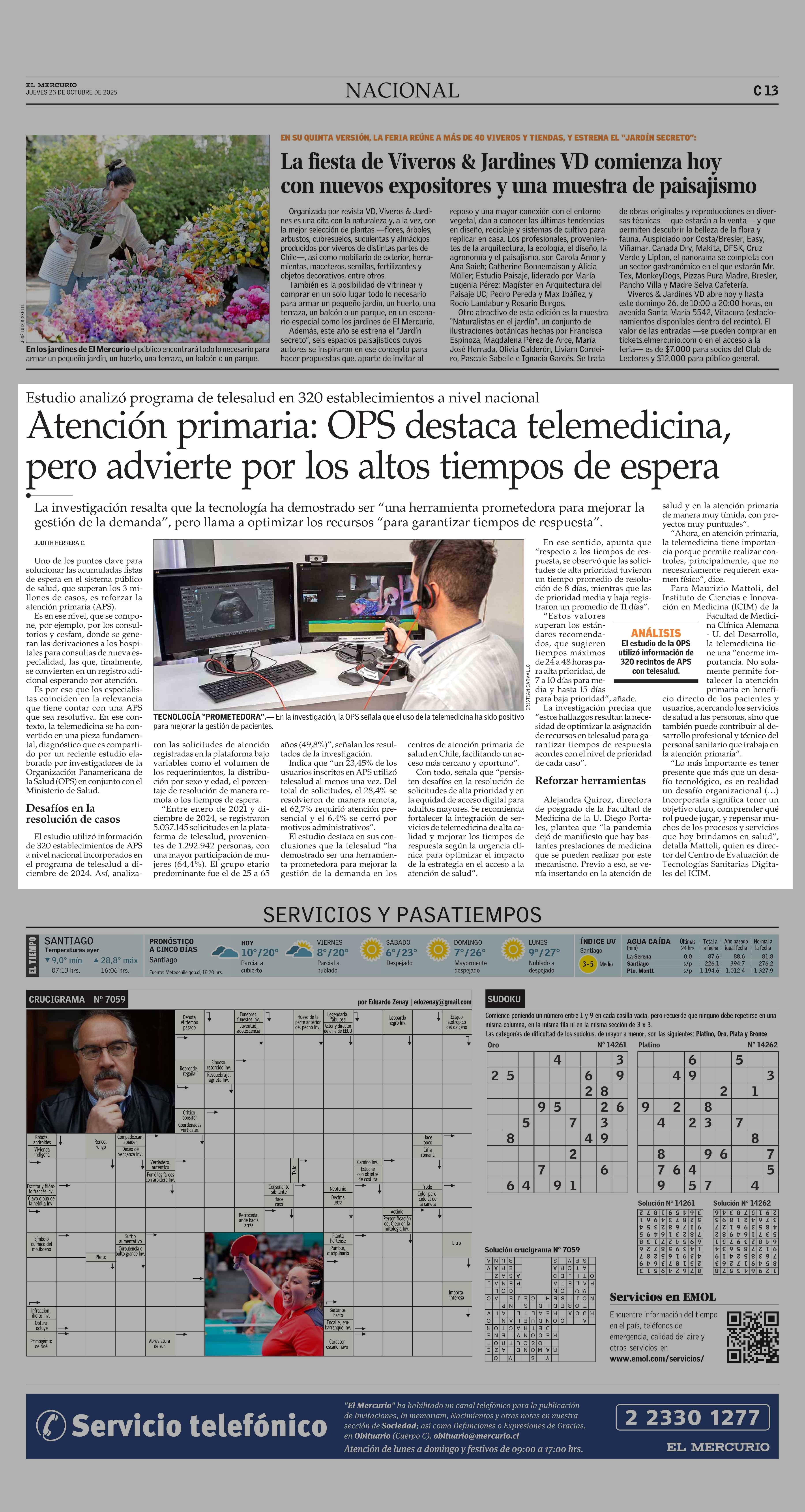 Atención primaria: OPS destaca telemedicina, pero advierte por los altos tiempos de espera 23-10-2025 El Mercurio |