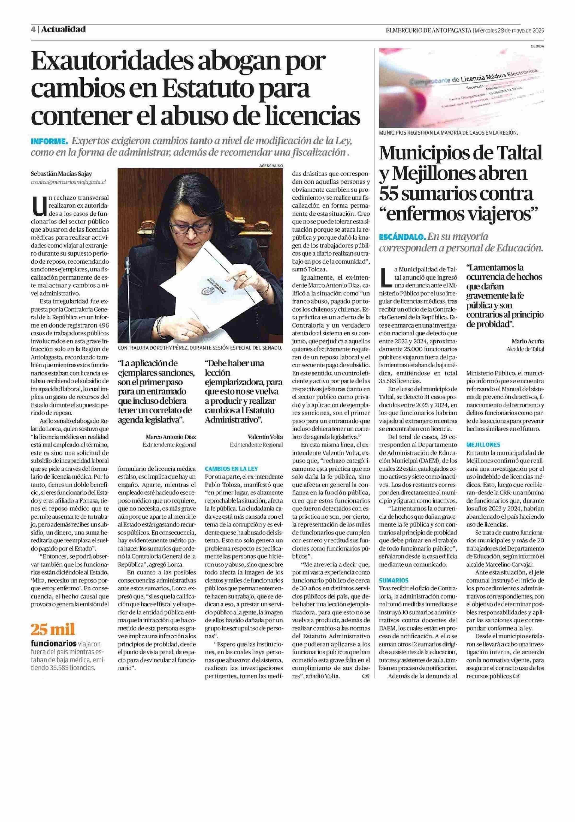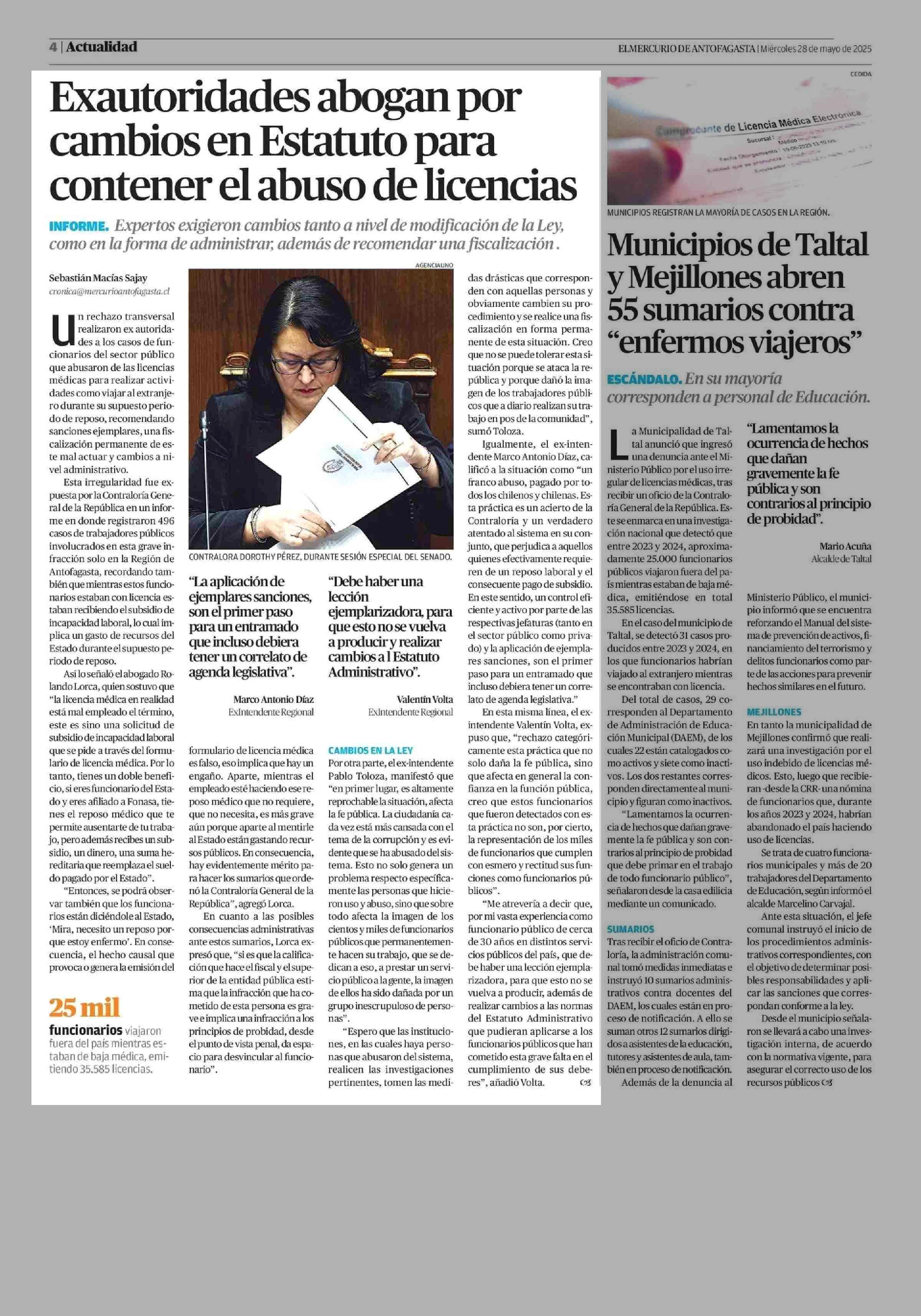 Exautoridades abogan por cambios en Estatuto para contener el abuso de licencias 28-05-2025 El Mercurio de Antofagasta |
