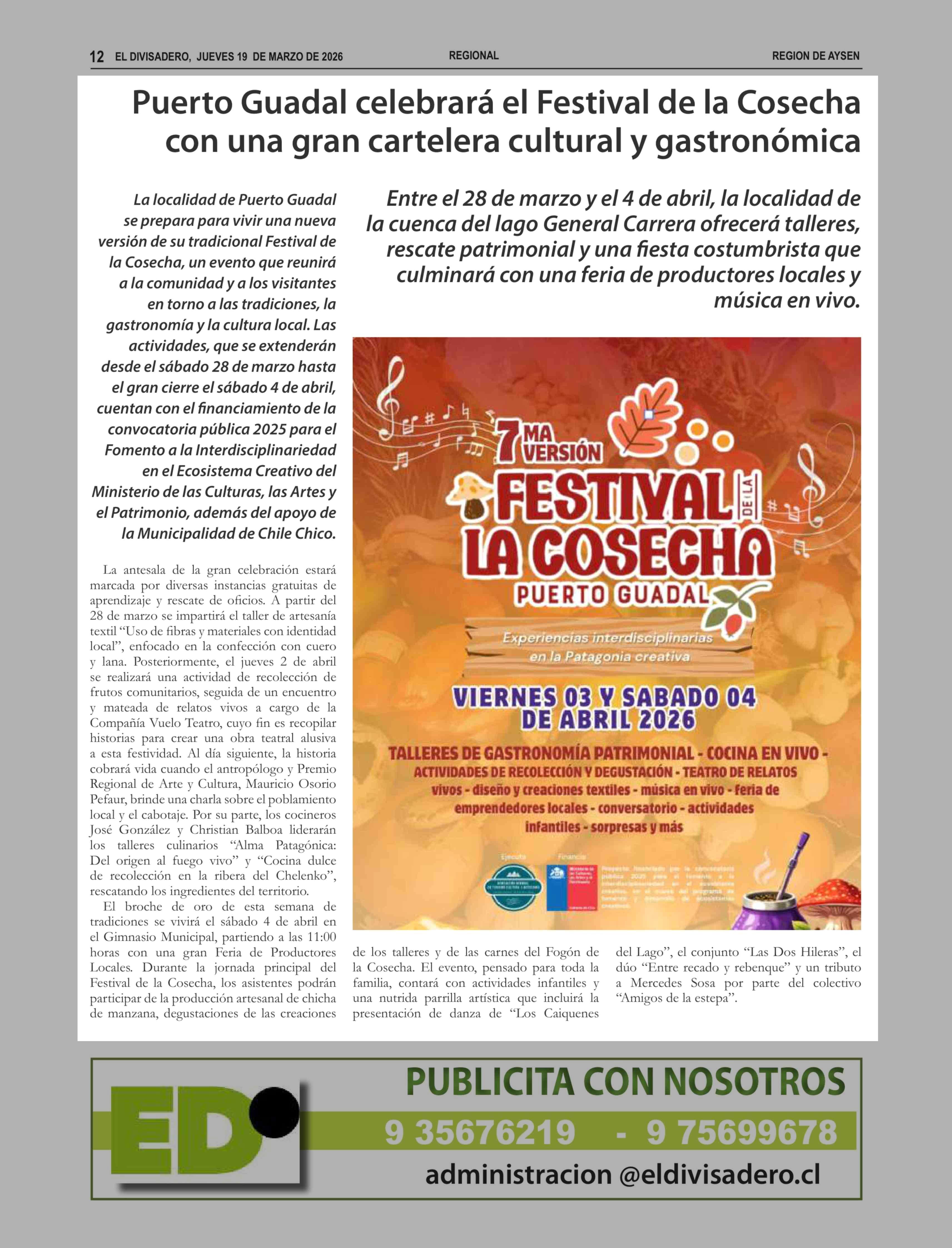 Título: Puerto Guadal celebrará el Festival de la Cosecha con una gran cartelera cultural y gastronómica
