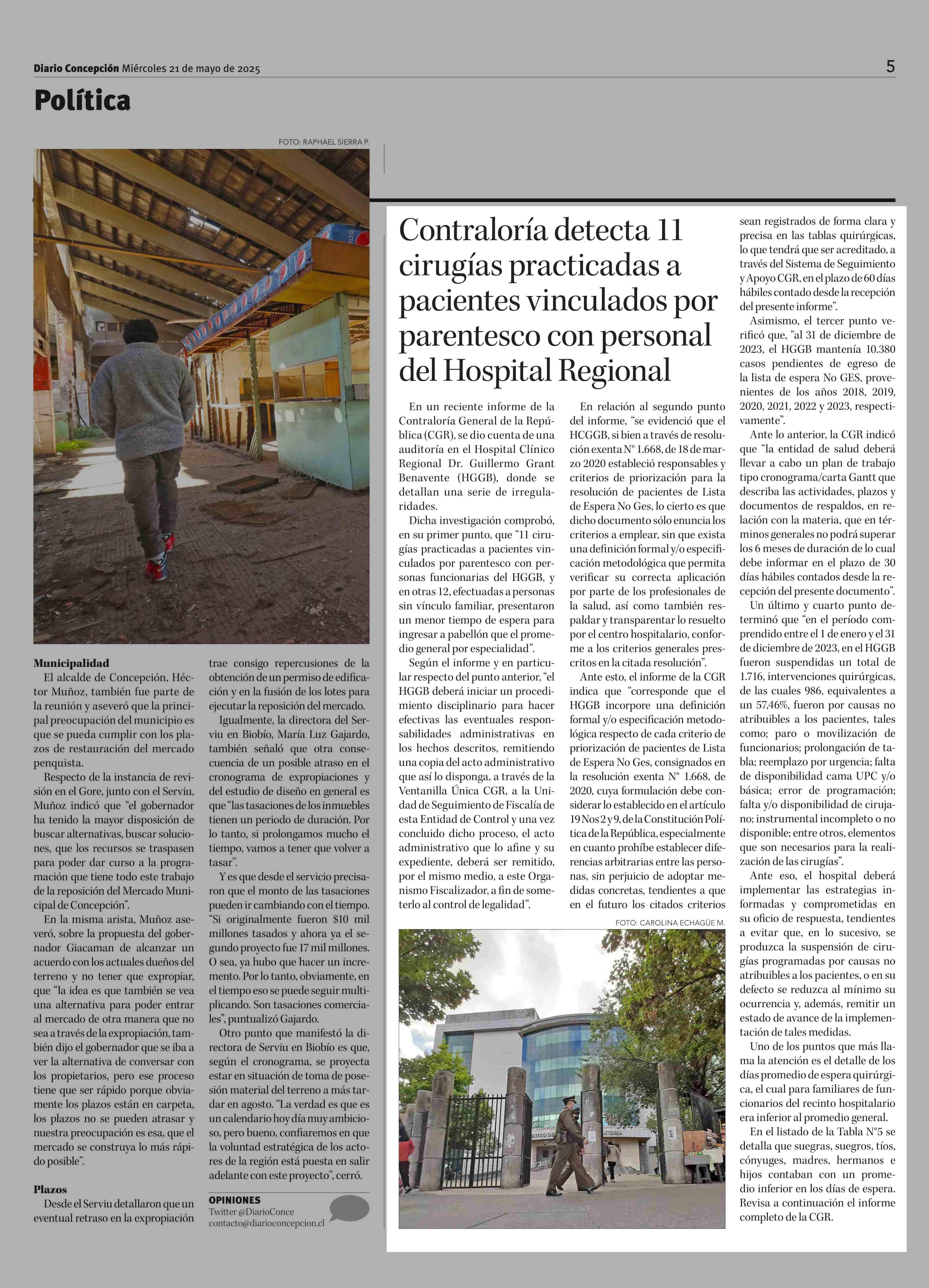 Contraloría detecta 11 cirugías practicadas a pacientes vinculados por parentesco con personal del Hospital Regional 21-05-2025 Diario Concepción |