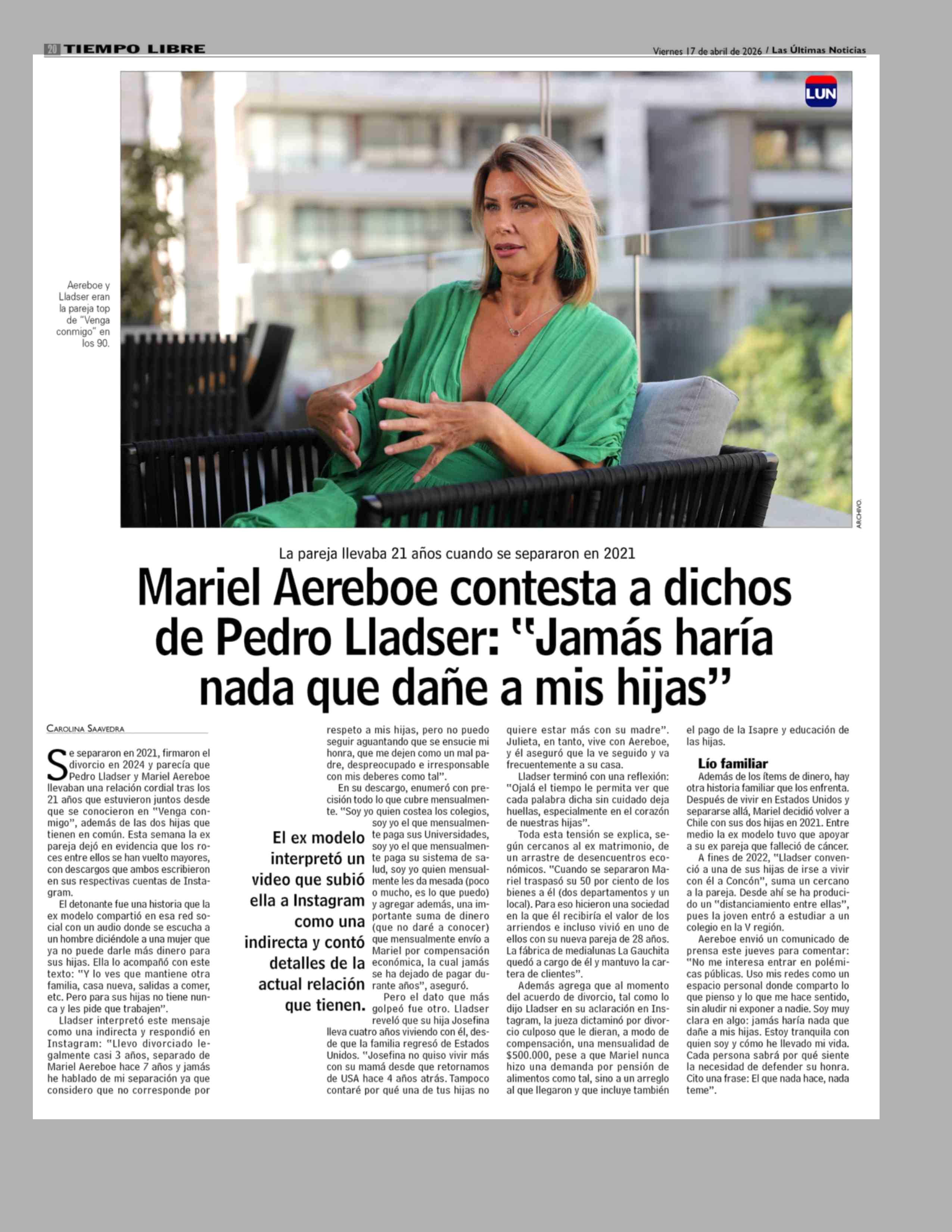 Mariel Aereboe contesta a dichos de Pedro Lladser: "Jamás haría nada que dañe a mis hijas" 17-04-2026 Las Últimas Noticias |
