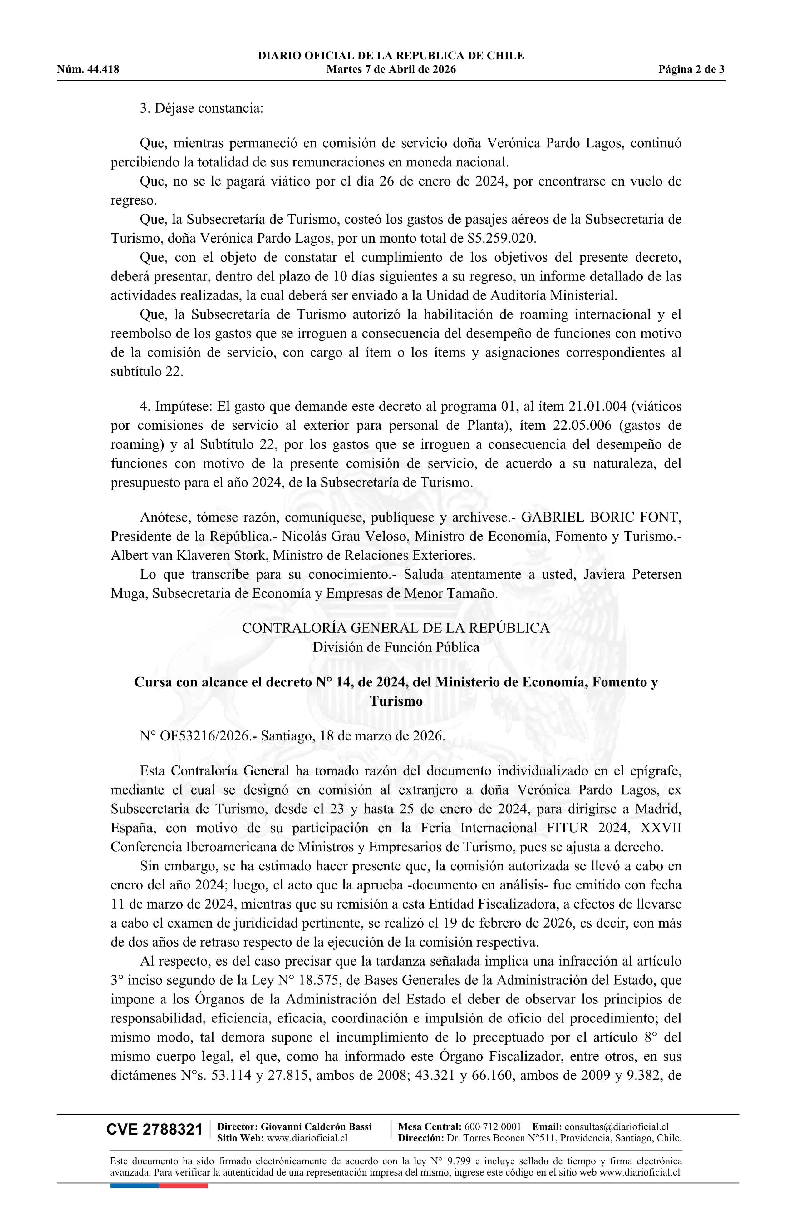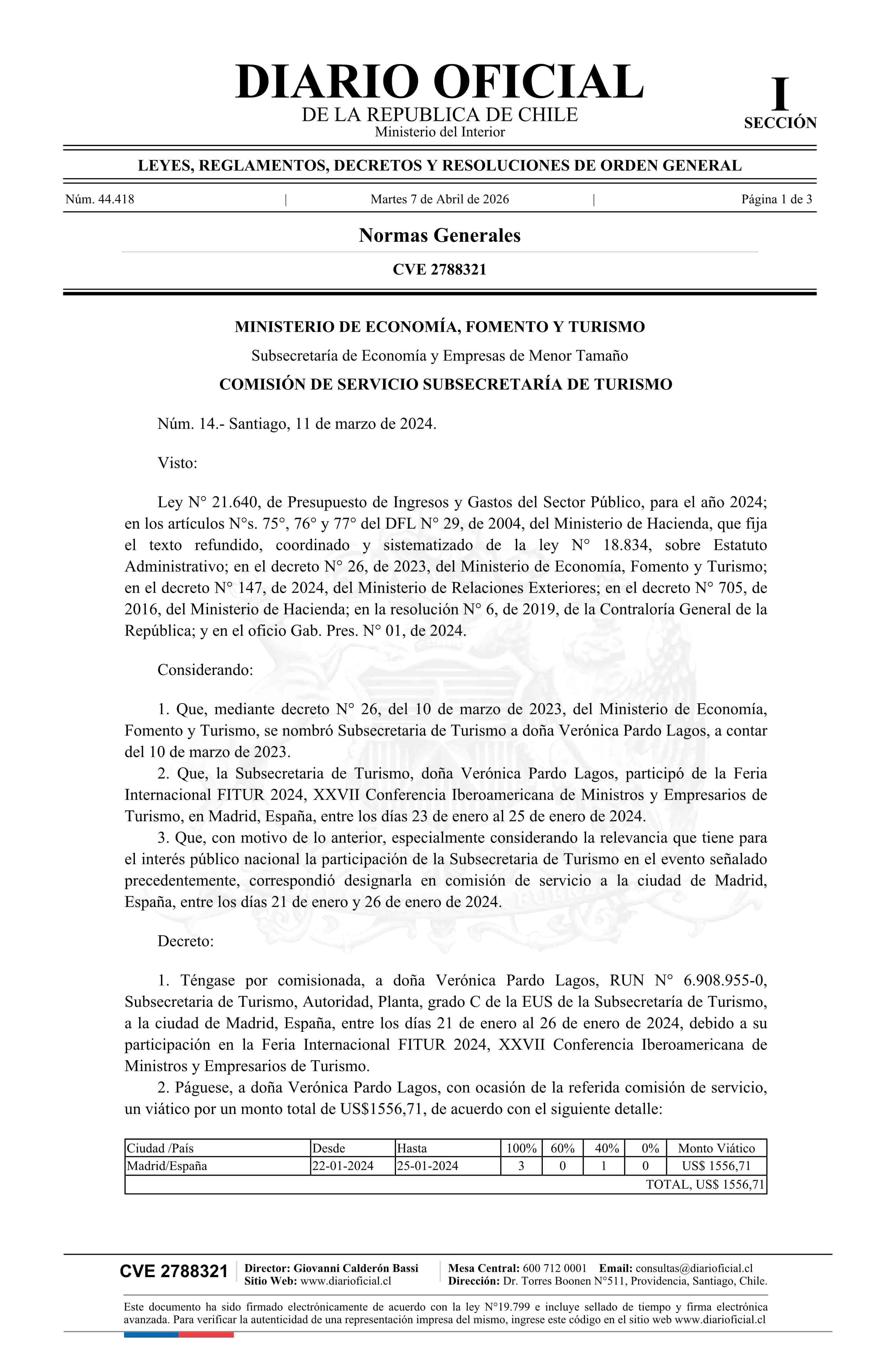 Decreto número 14, de 2024.- Designa en comisión de servicio en el extranjero a doña Verónica Pardo Lagos, Subsecretaria de Turismo, a la ciudad de Madrid, España 07-04-2026 Diario Oficial Edición Electrónica |