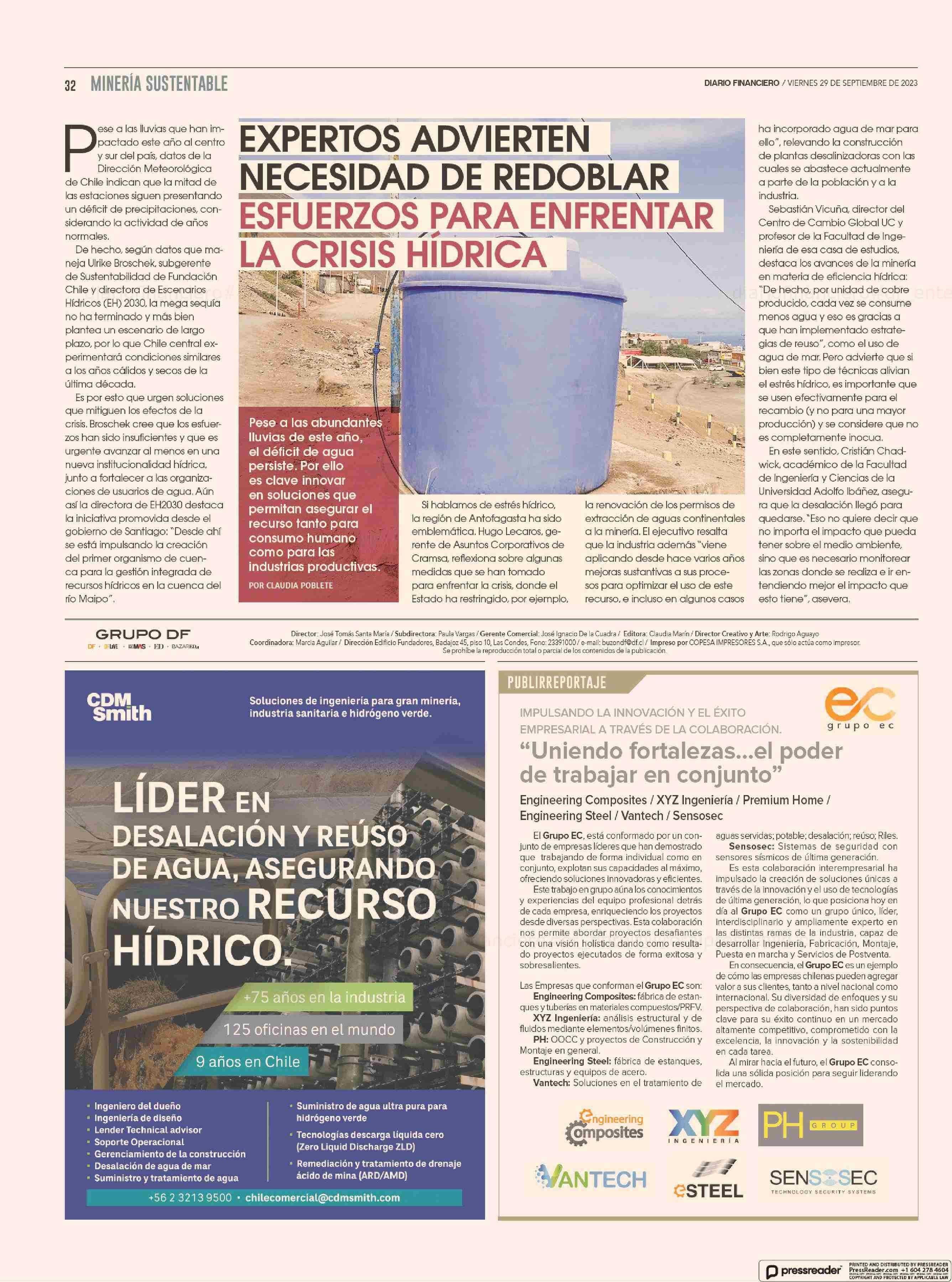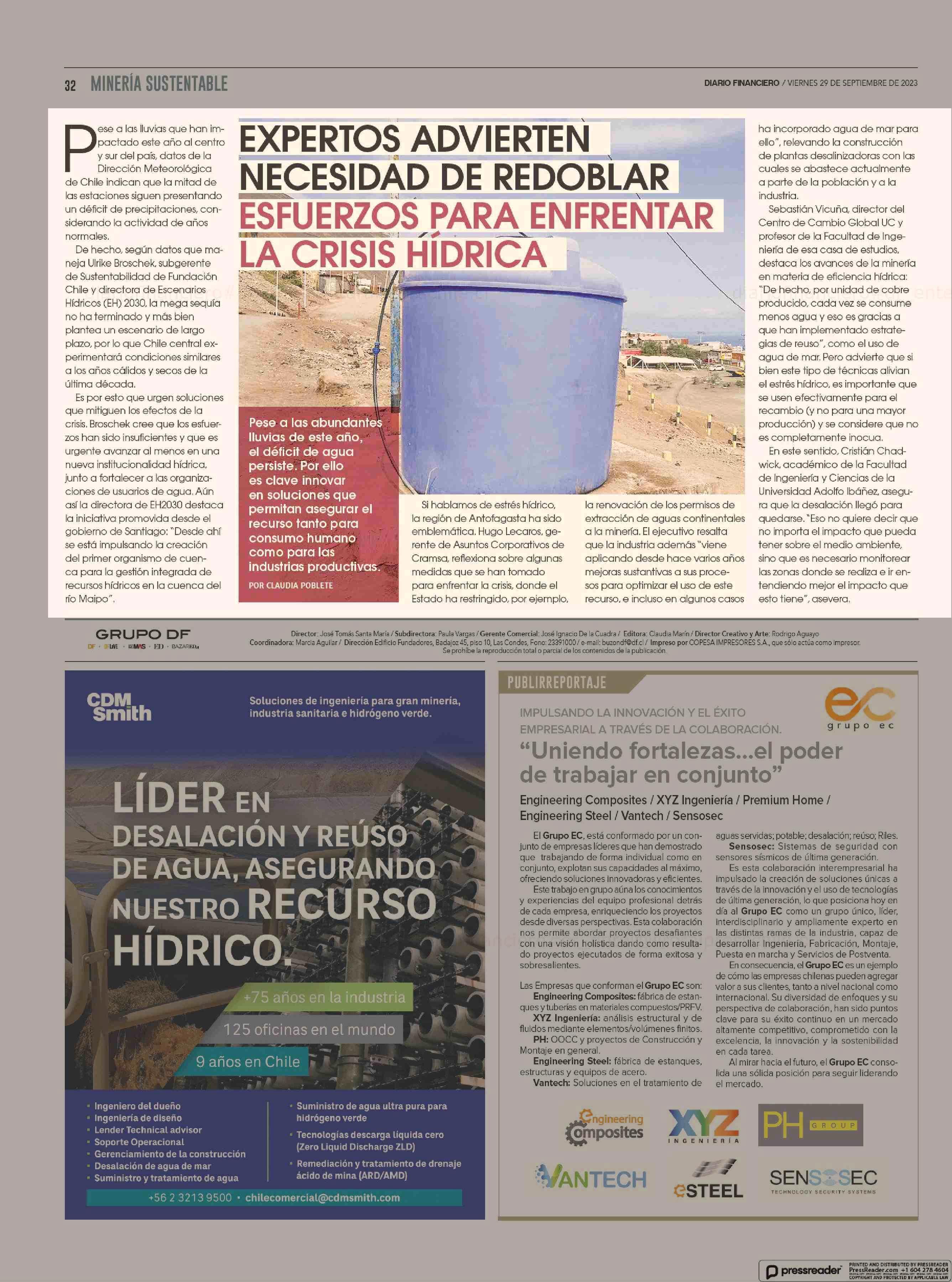 EXPERTOS ADVIERTEN NECESIDAD DE REDOBLAR ESFUERZOS PARA ENFRENTAR LA CRISIS HÍDRICA 29-09-2023 Diario Financiero |