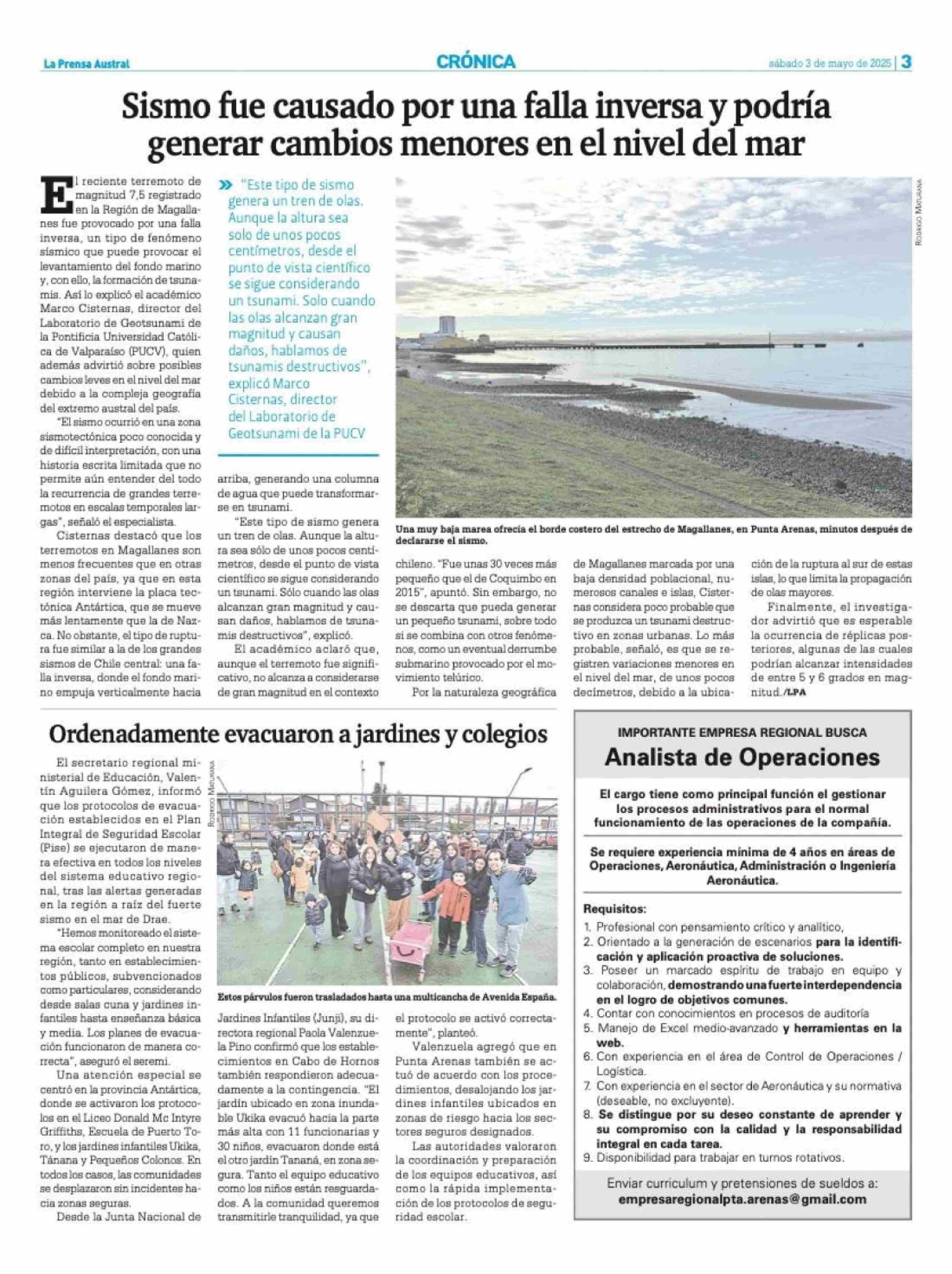 Sismo fue causado por una falla inversa y podría generar cambios menores en el nivel del mar 03-05-2025 La Prensa Austral |