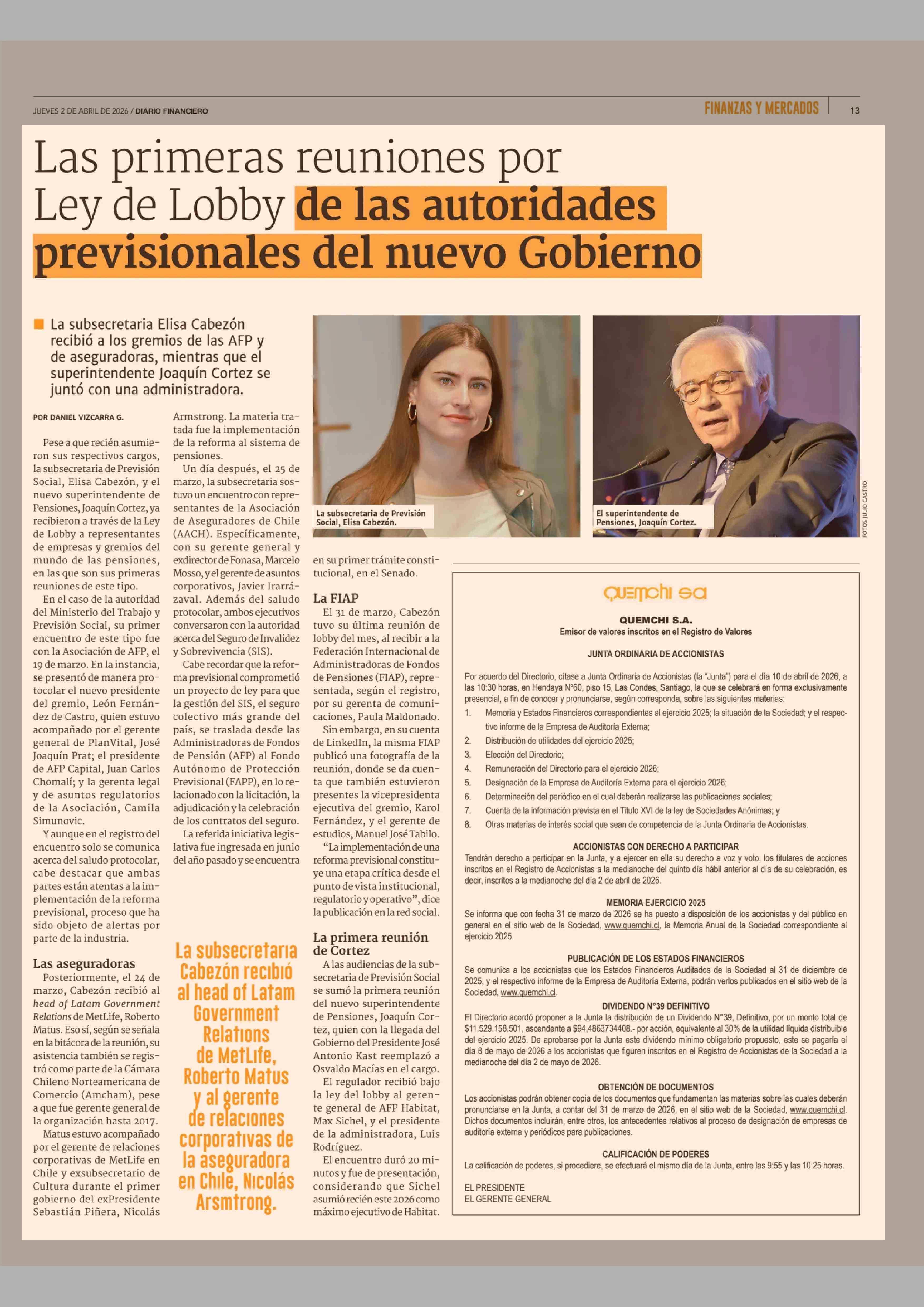 Las primeras reuniones por Ley de Lobby de las autoridades previsionales del nuevo Gobierno 02-04-2026 Diario Financiero |