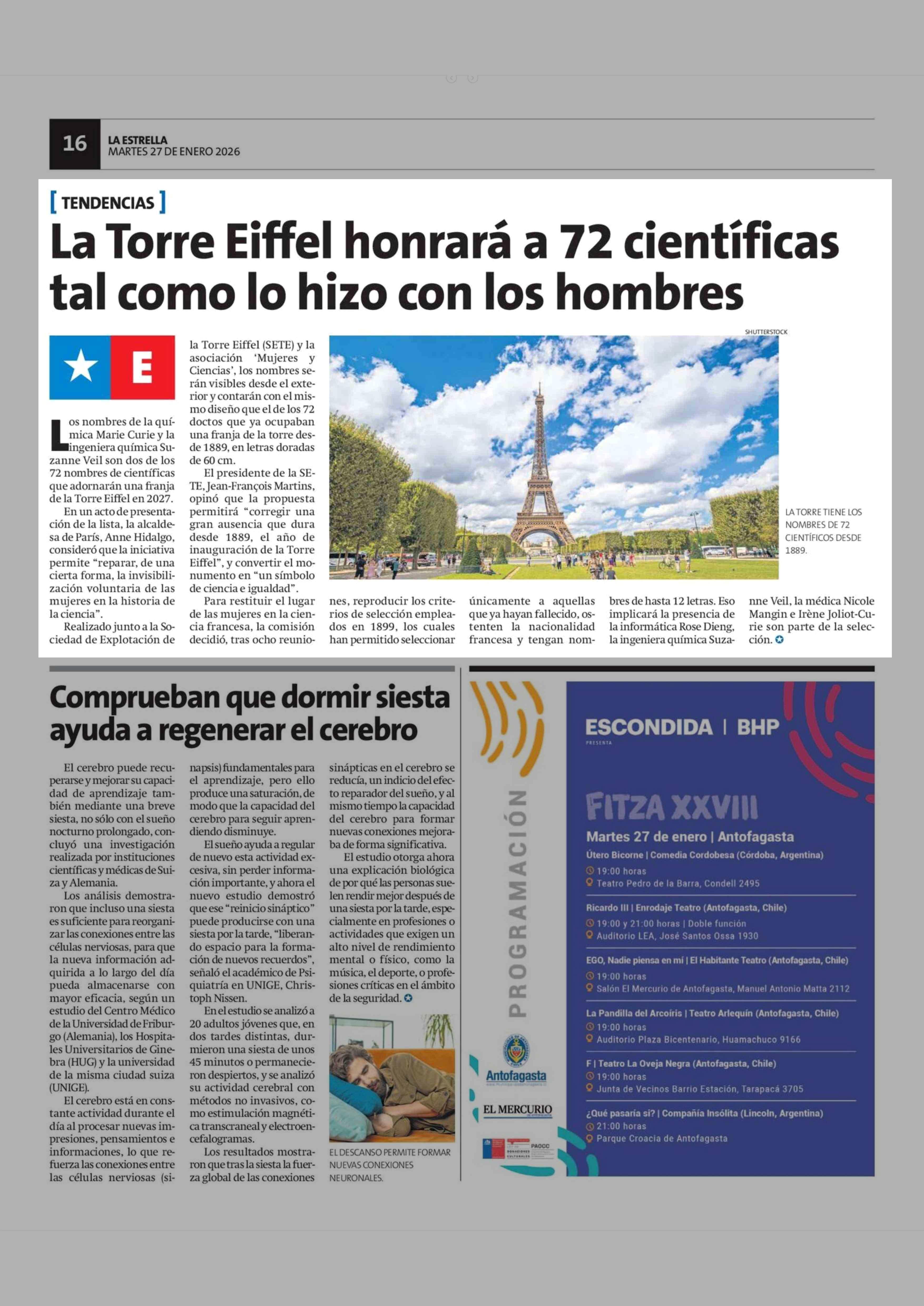 La Torre Eiffel honrará a 72 científicas tal como lo hizo con los hombres 27-01-2026 La Estrella de Antofagasta |