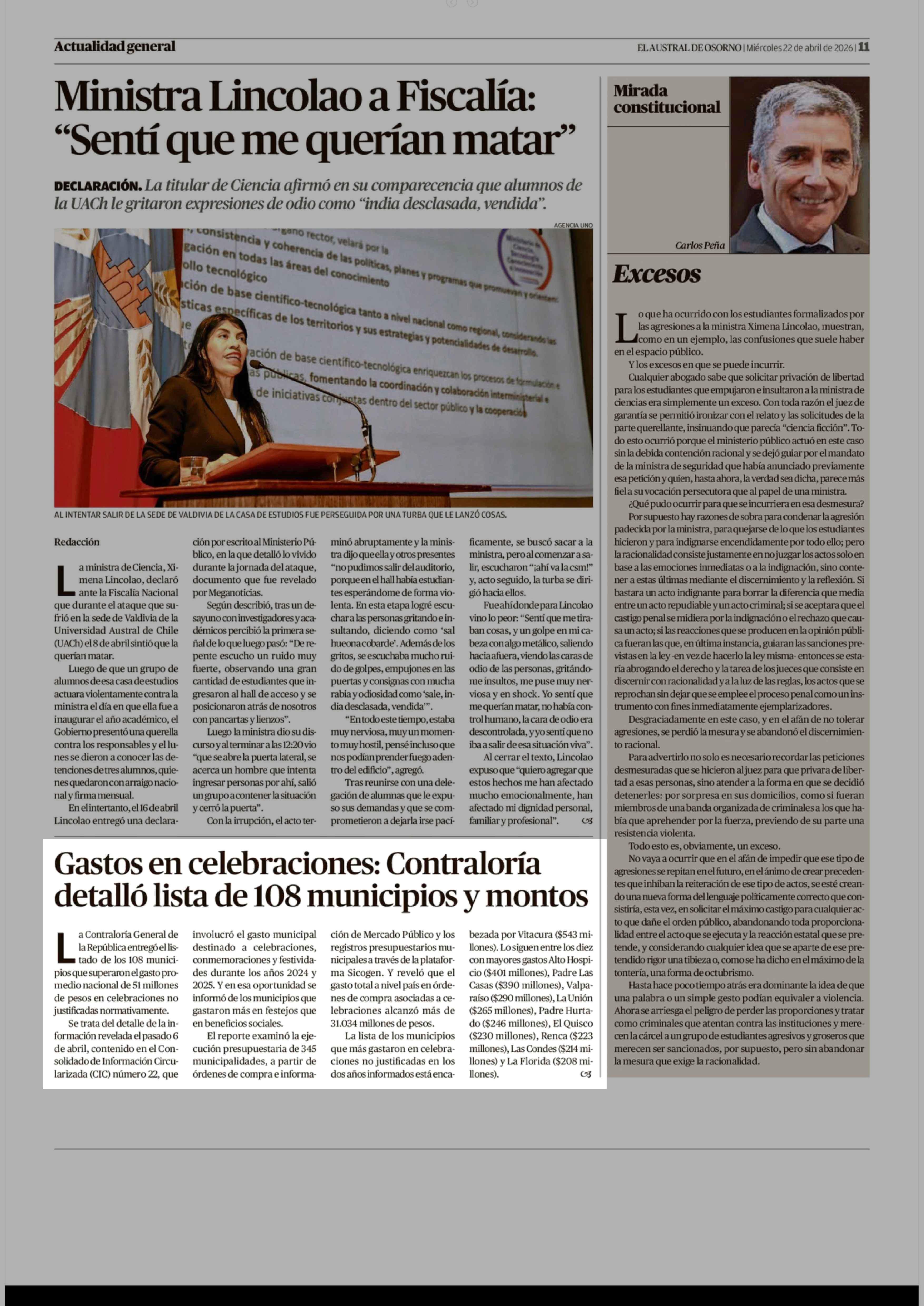 Gastos en celebraciones: Contraloría detalló lista de 108 municipios y montos 22-04-2026 El Austral de Osorno |