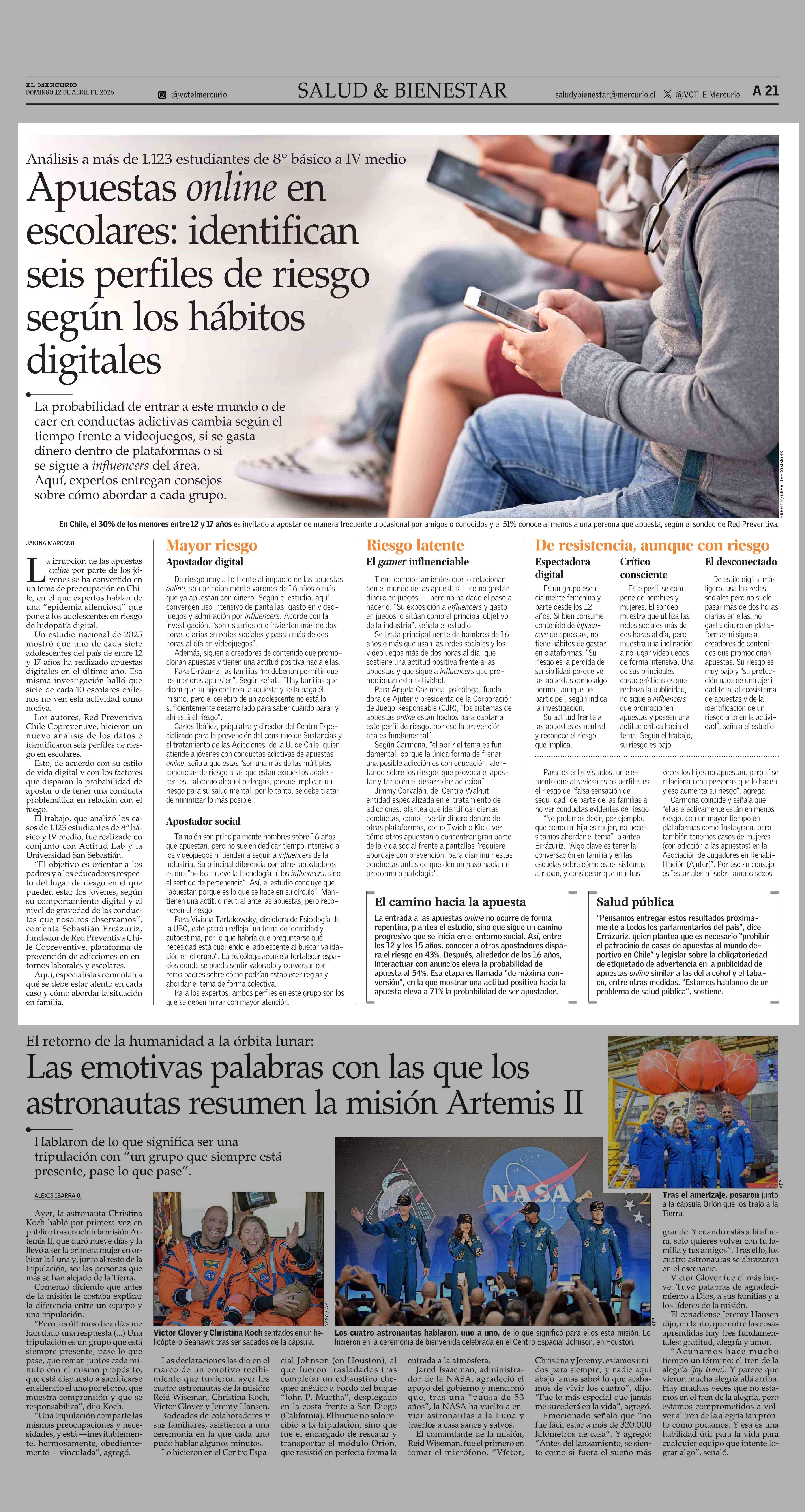 Apuestas online en escolares: identifican seis perfiles de riesgo según los hábitos digitales 12-04-2026 El Mercurio |