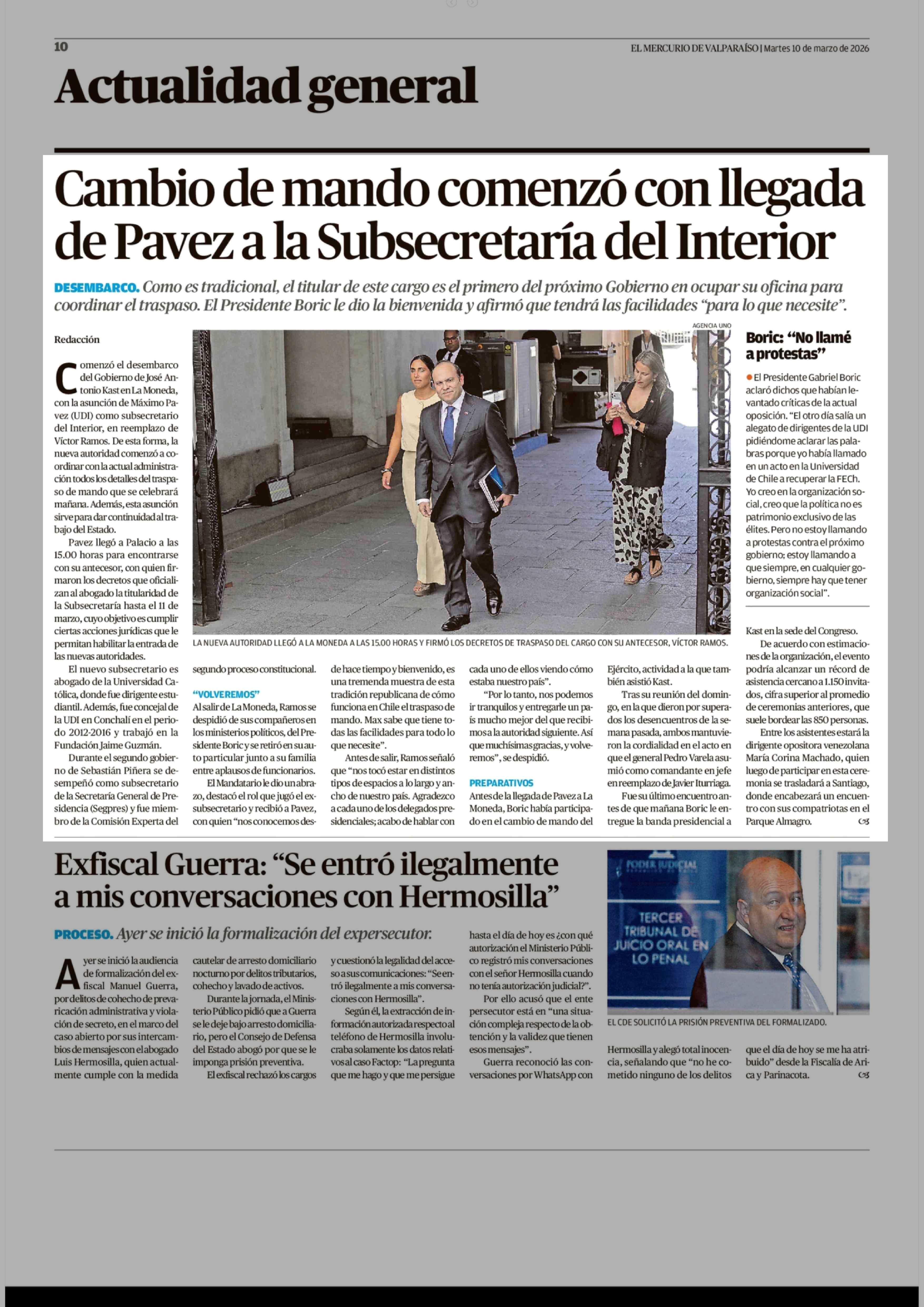 Cambio de mando comenzó con llegada de Pavez a la Subsecretaría del Interior 10-03-2026 El Mercurio de Valparaíso |