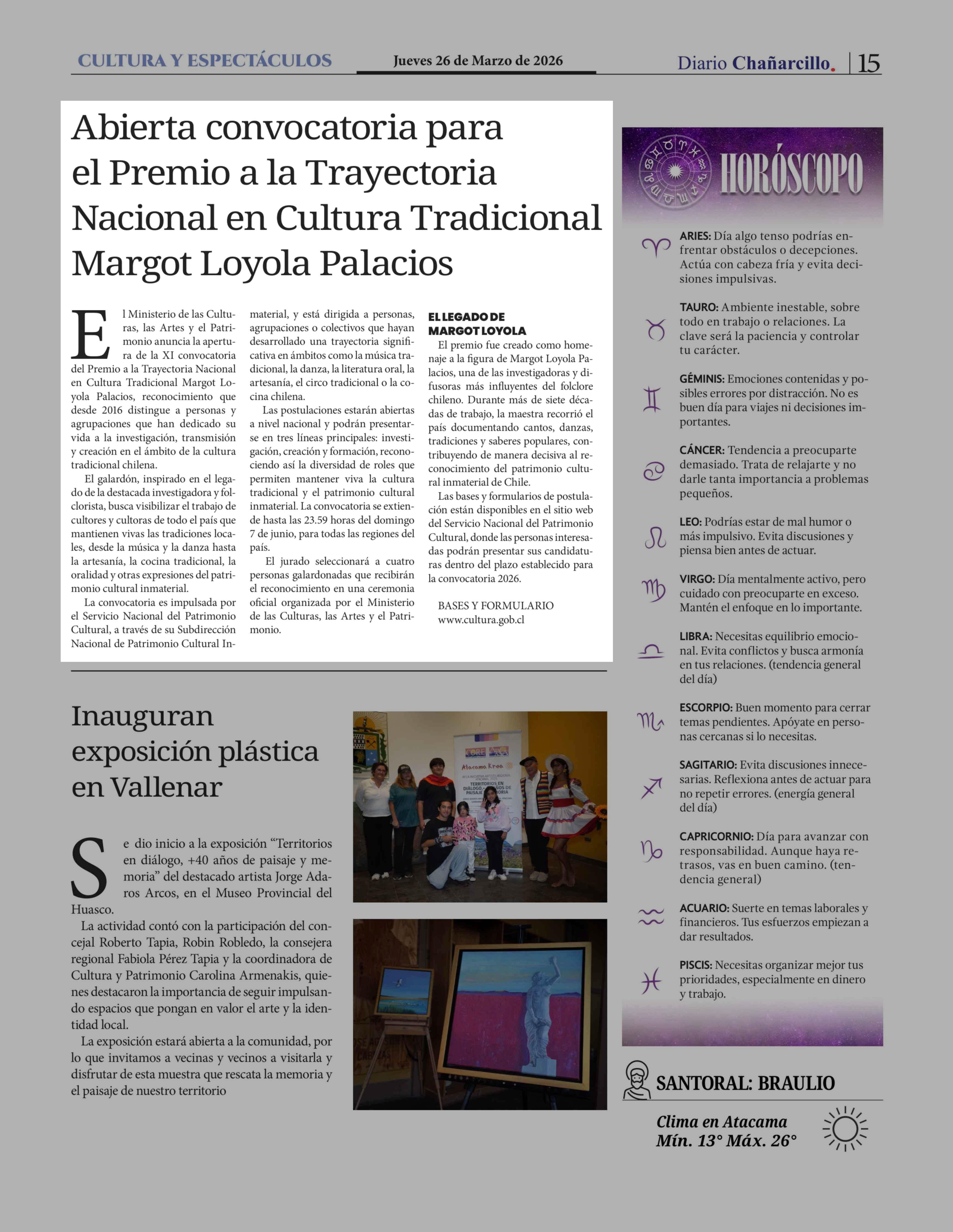 Abierta convocatoria para el Premio a la Trayectoria Nacional en Cultura Tradicional Margot Loyola Palacios 26-03-2026 Diario Chañarcillo |