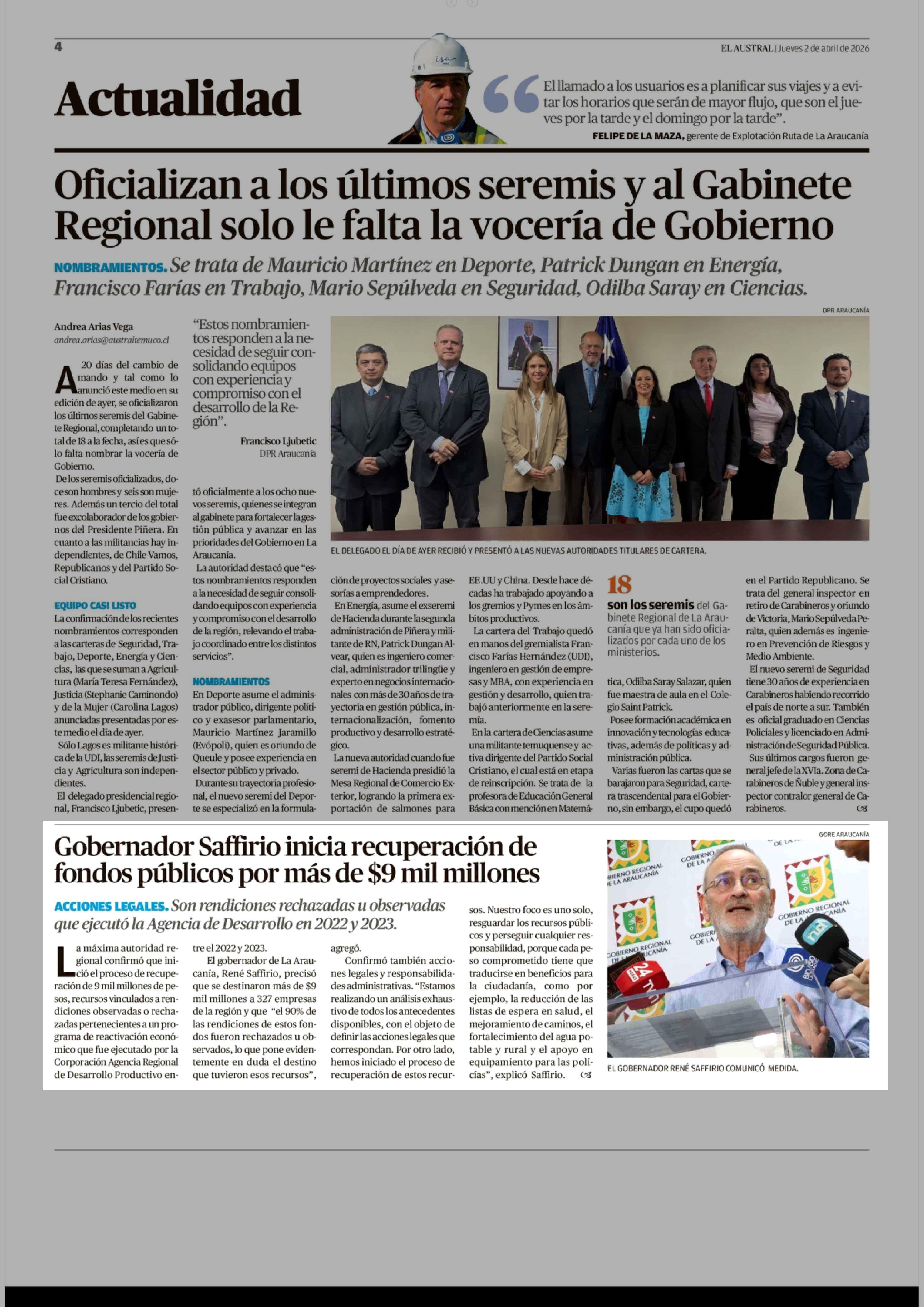 Gobernador Saffirio inicia recuperación de fondos públicos por más de $9 mil millones 02-04-2026 El Austral de la Araucanía |