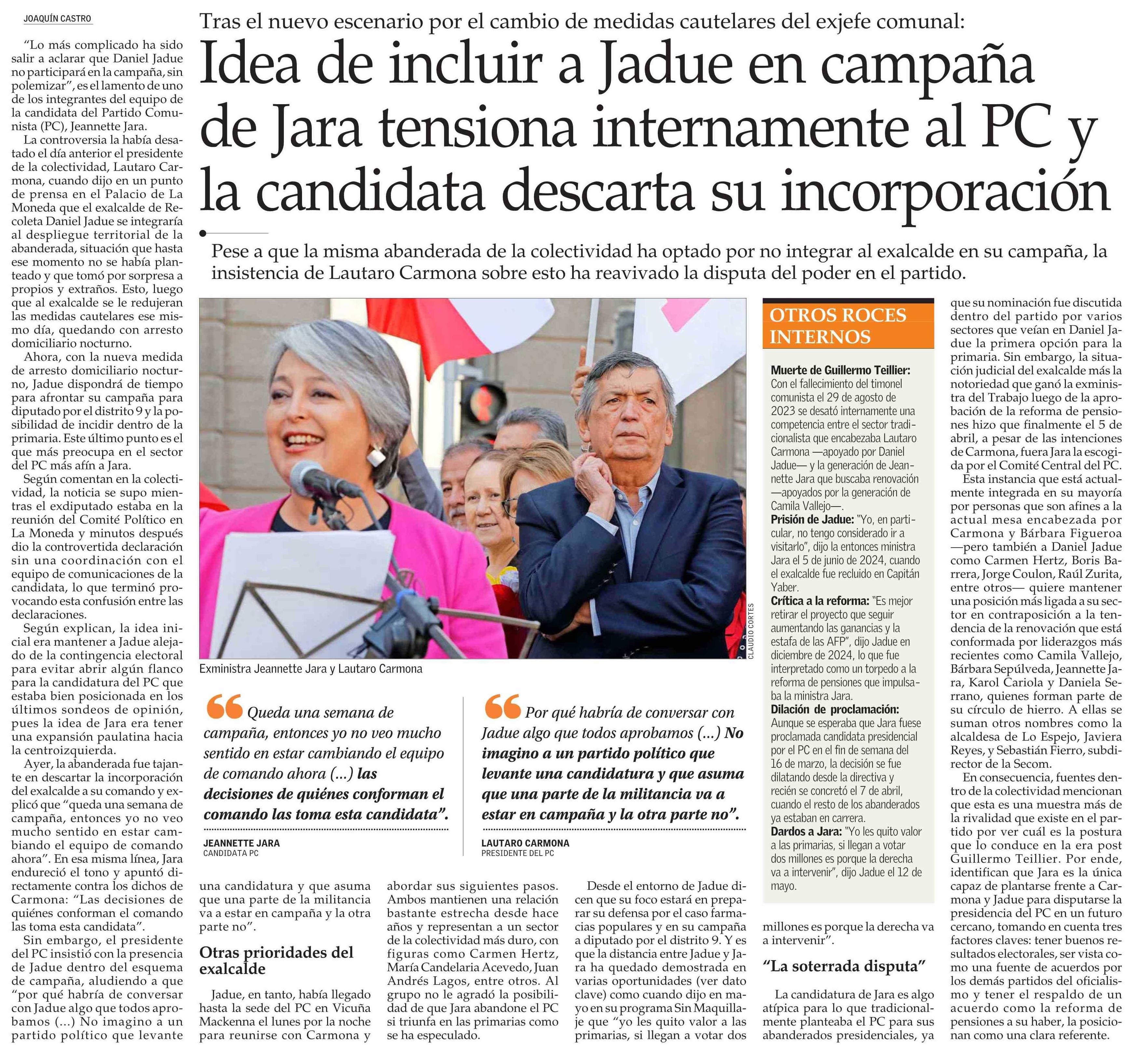 Idea de incluir a Jadue en campaña de Jara tensiona internamente al PC y la candidata descarta su incorporación 18-06-2025 El Mercurio |
