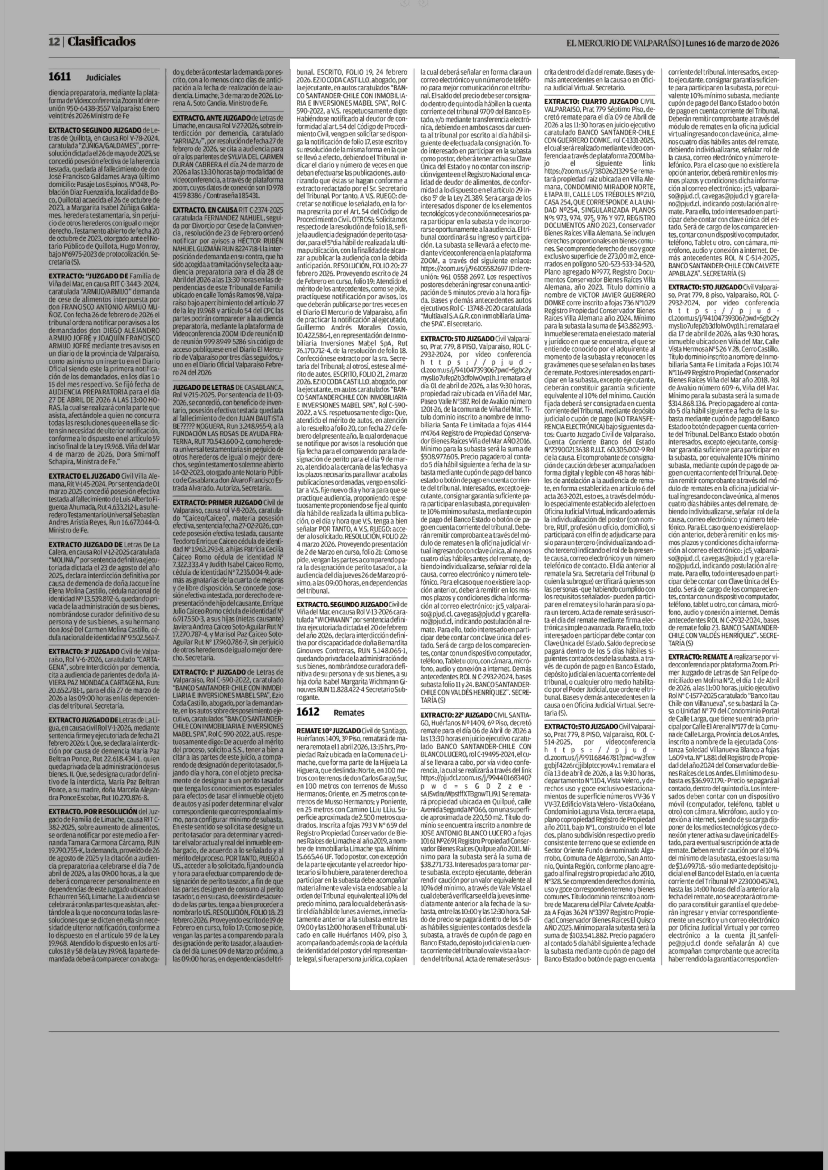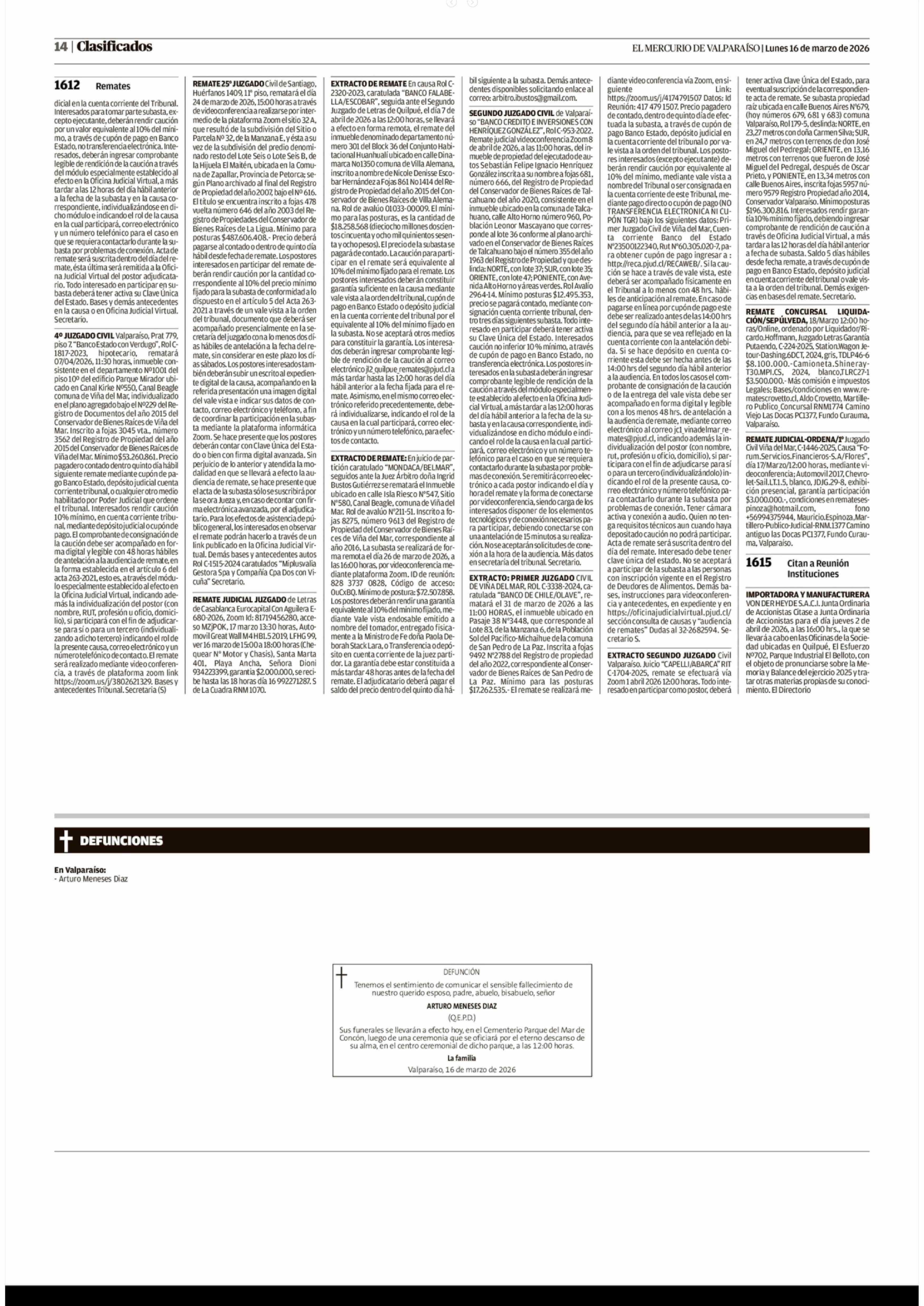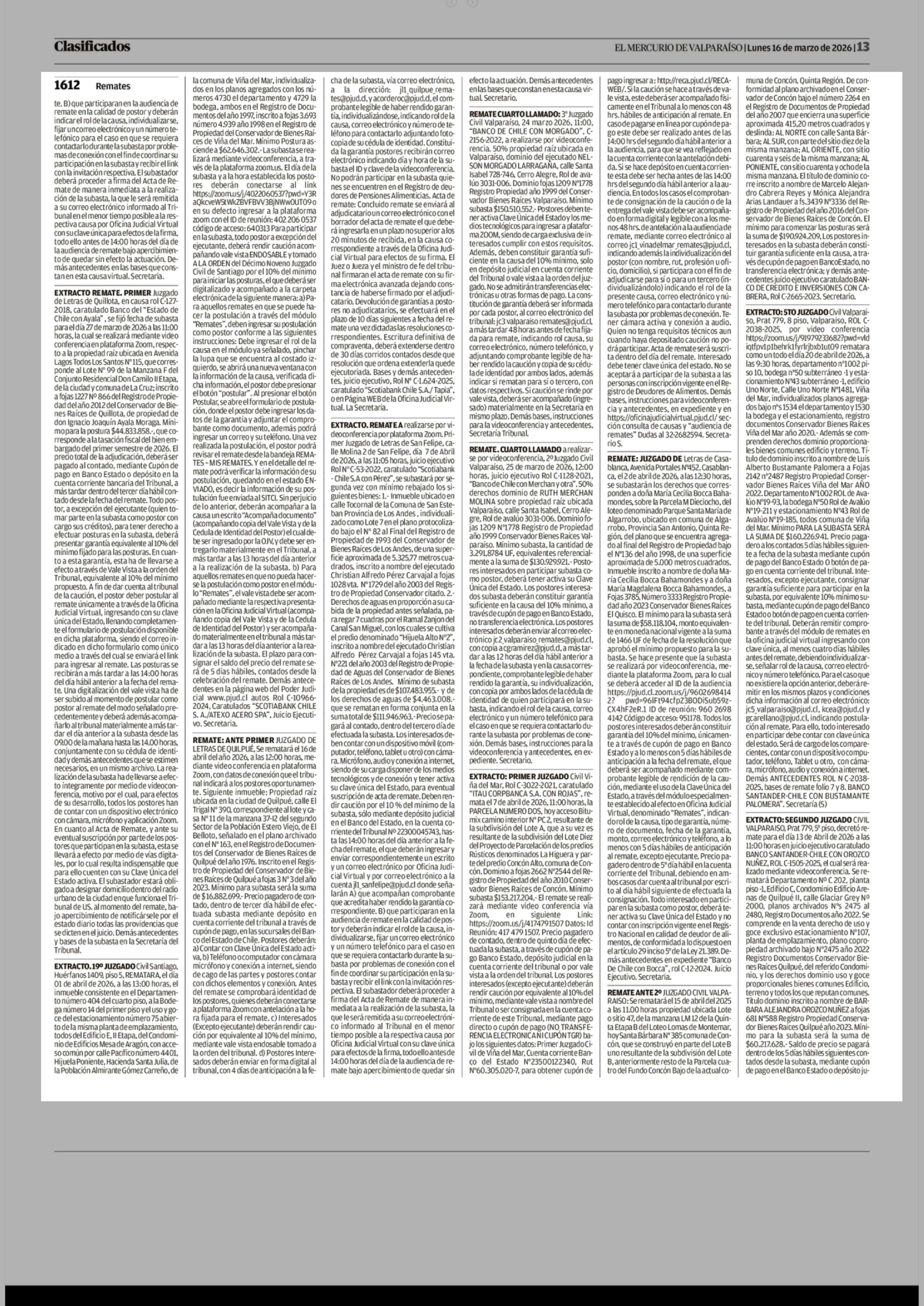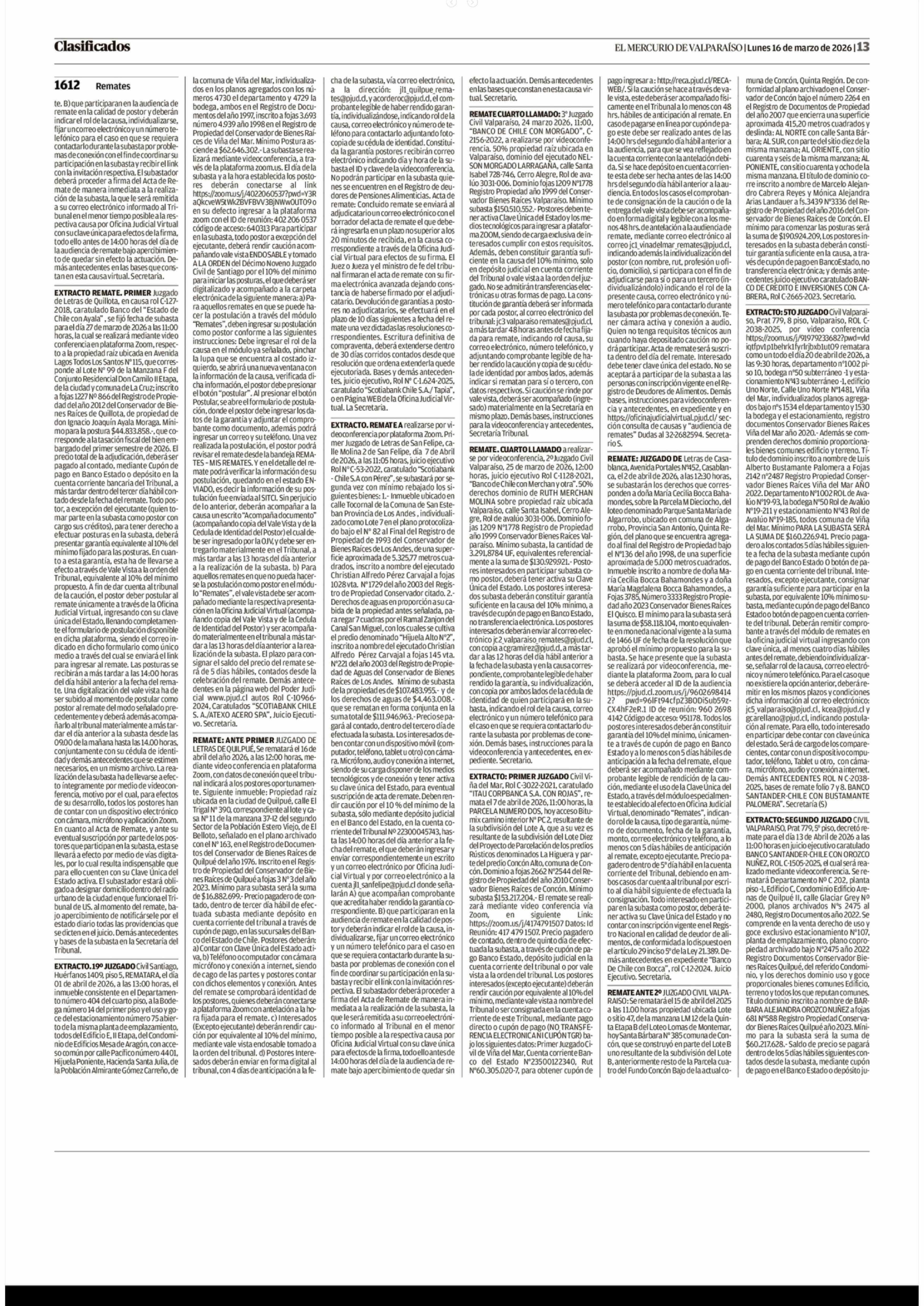 REMATES: 1612 REMATES 16-03-2026 El Mercurio de Valparaíso |