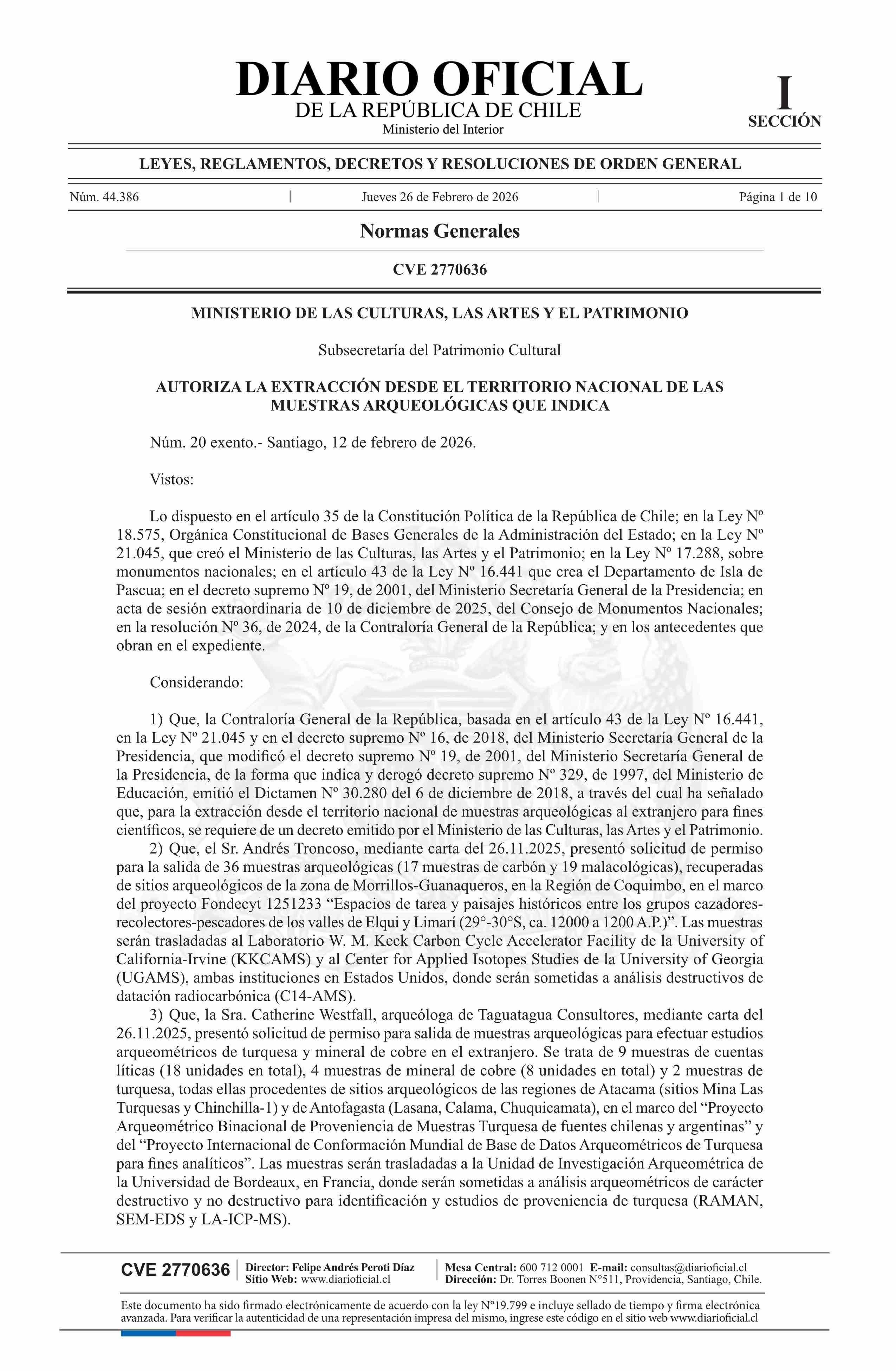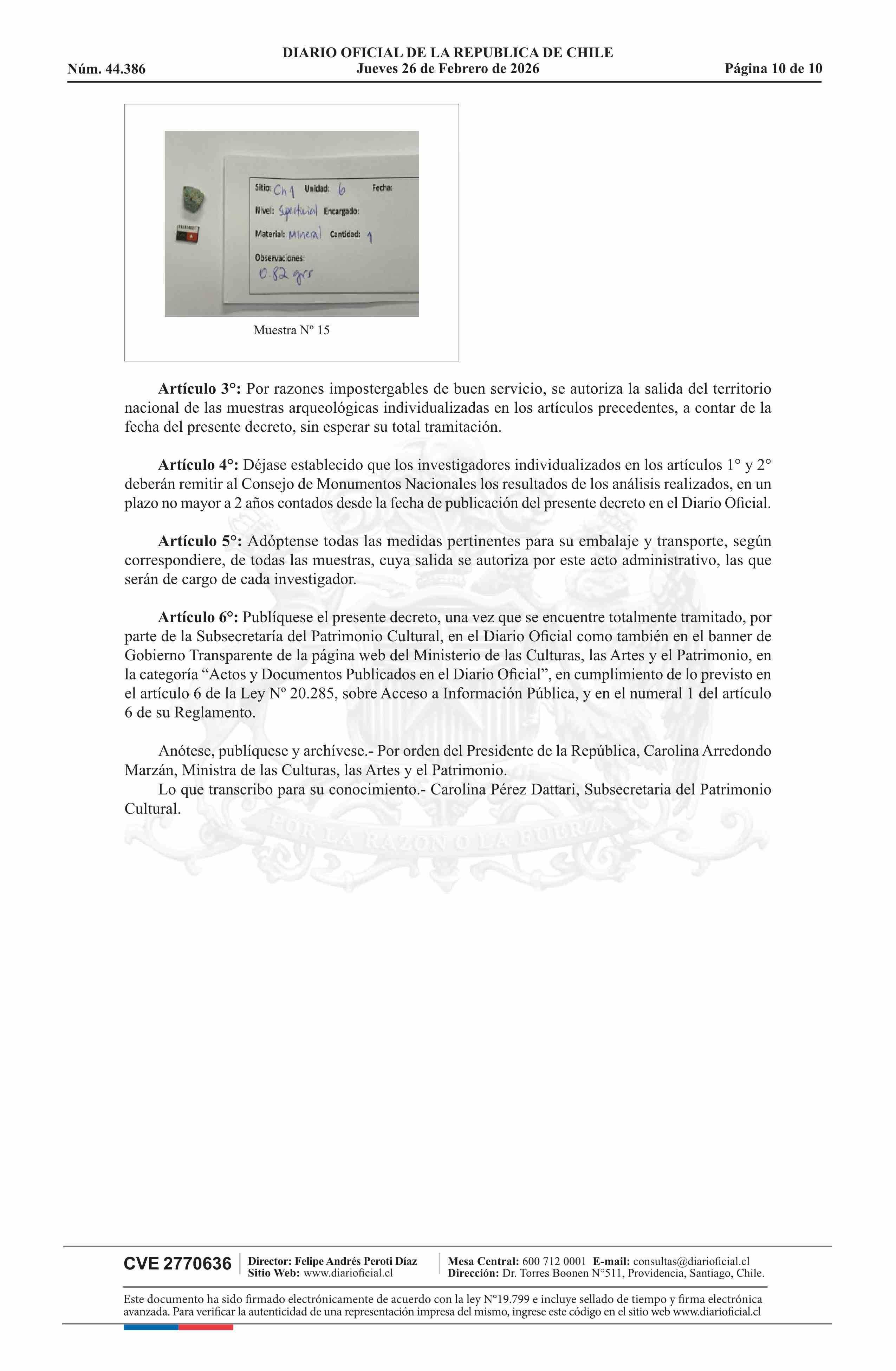| Título: | Decreto exento número 20, de 2026.- Autoriza la extracción desde el territorio nacional de las muestras arqueológicas que indica |