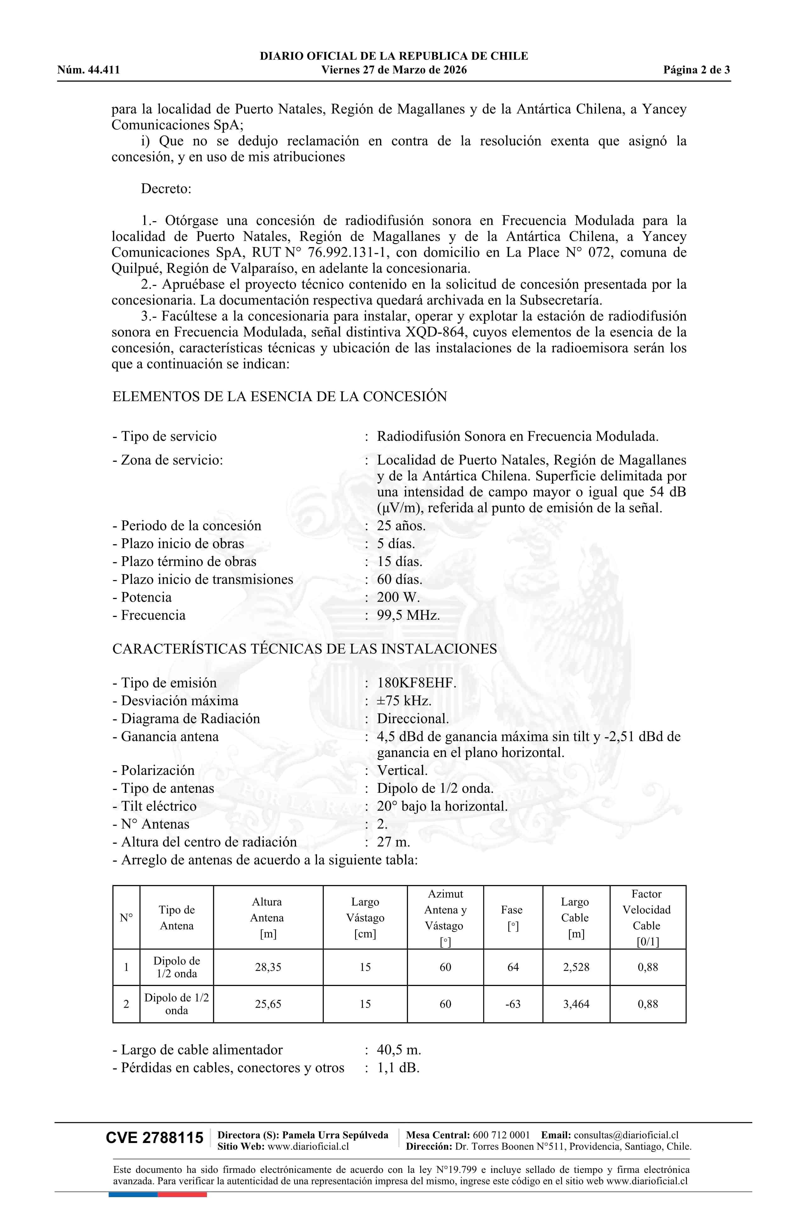 | Título: | Decreto exento número 206, de 2026.- Otorga concesión de radiodifusión sonora en frecuencia modulada para la localidad de Puerto Natales |