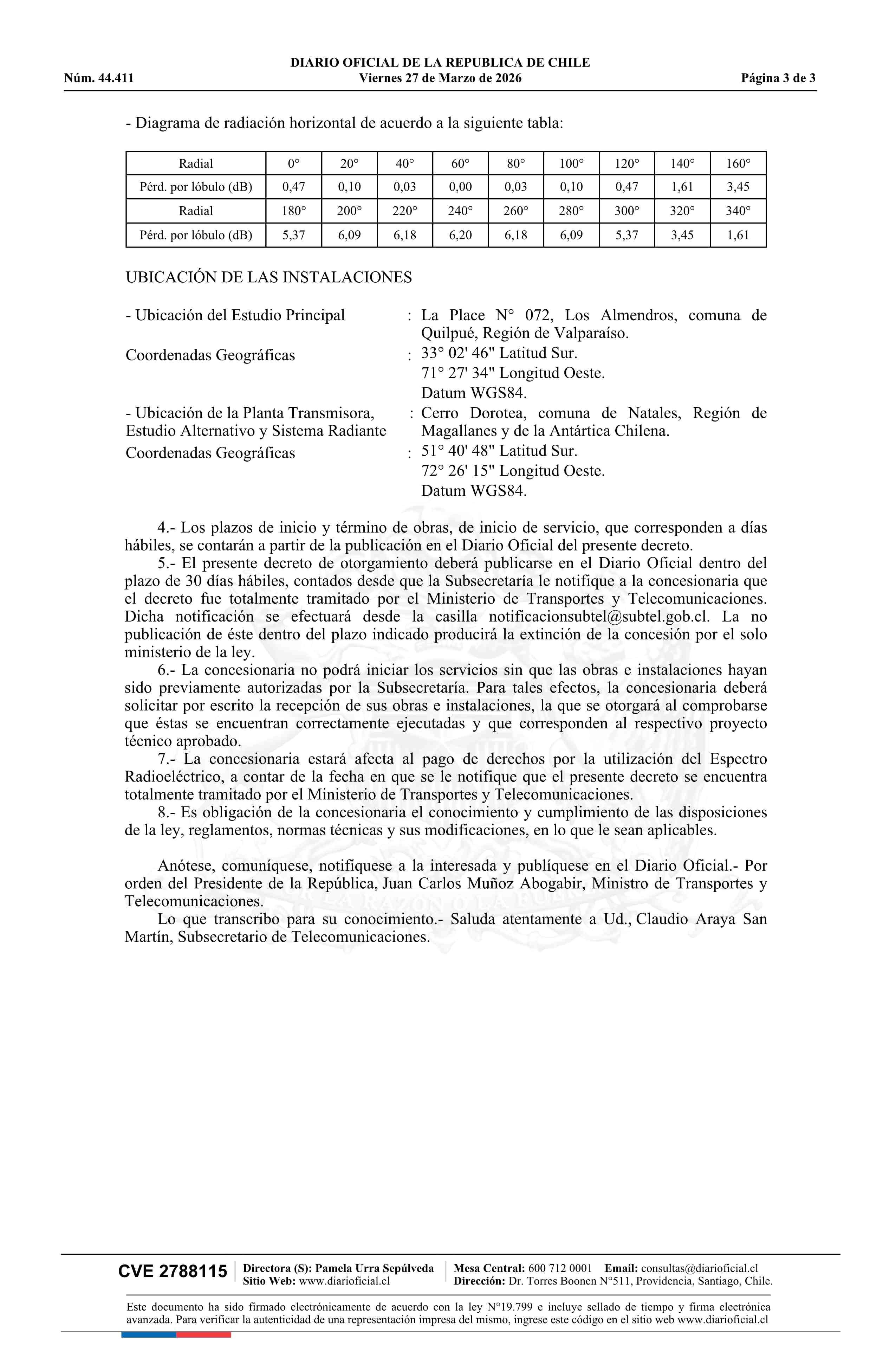 Decreto exento número 206, de 2026.- Otorga concesión de radiodifusión sonora en frecuencia modulada para la localidad de Puerto Natales 27-03-2026 Diario Oficial Edición Electrónica |