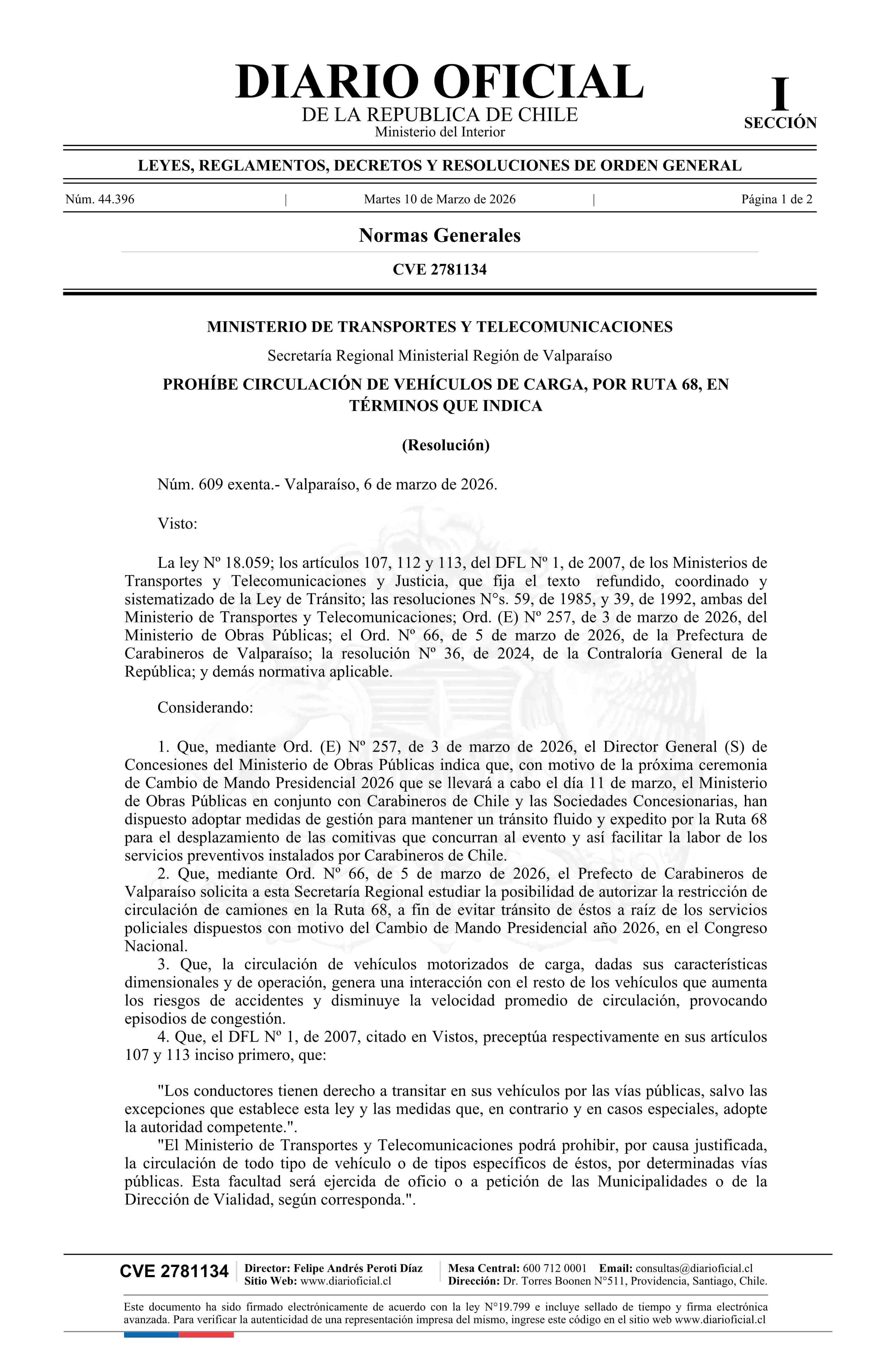 Resolución exenta número 609, de 2026.- Prohíbe circulación de vehículos de carga, por Ruta 68, en términos que indica 10-03-2026 Diario Oficial Edición Electrónica |