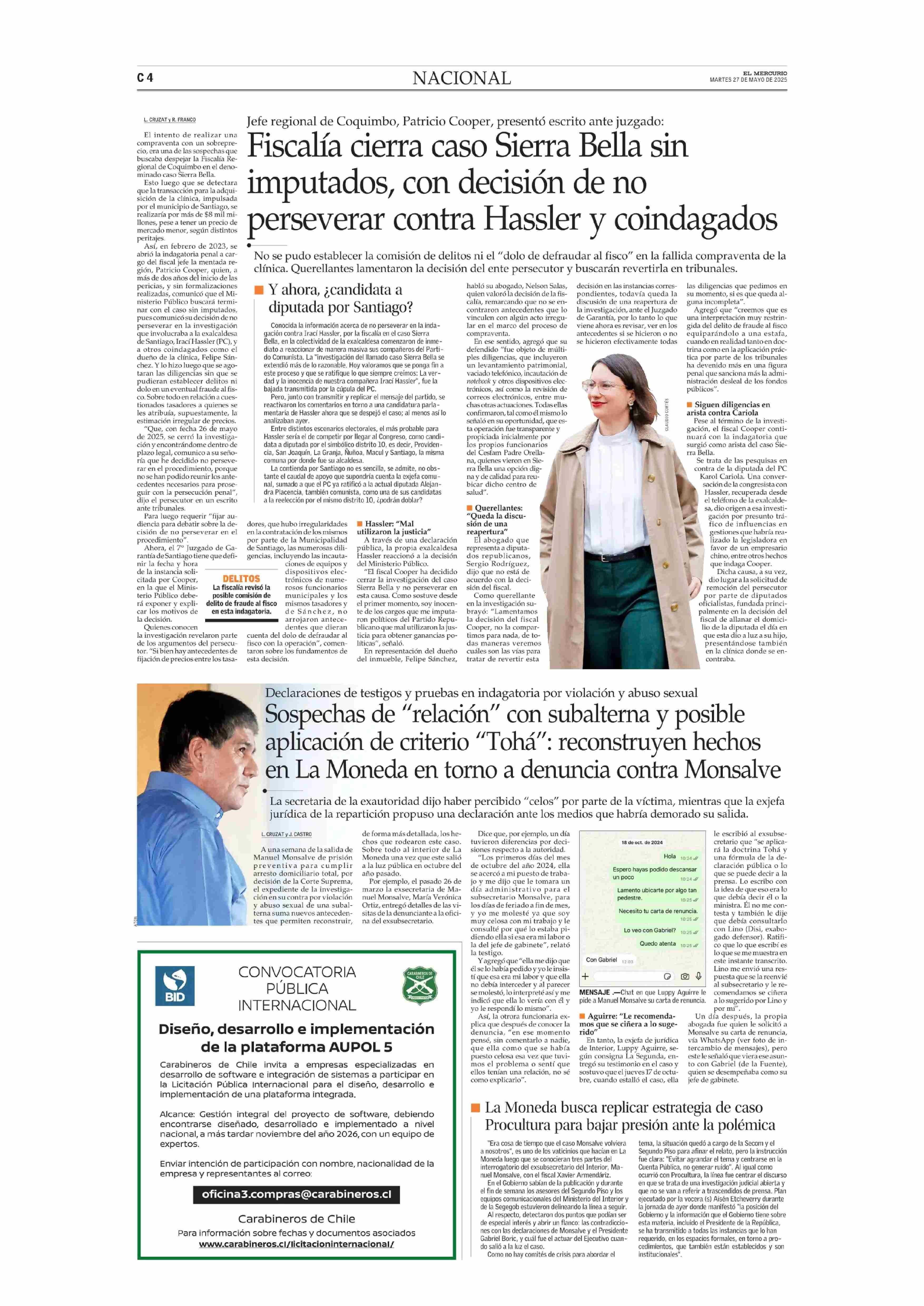 Fiscalía cierra caso Sierra Bella sin imputados, con decisión de no perseverar contra Hassler y coindagados 27-05-2025 El Mercurio |